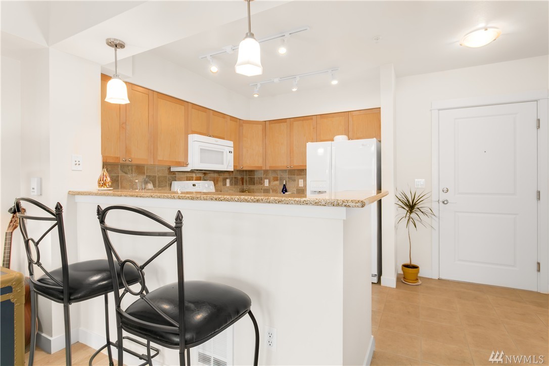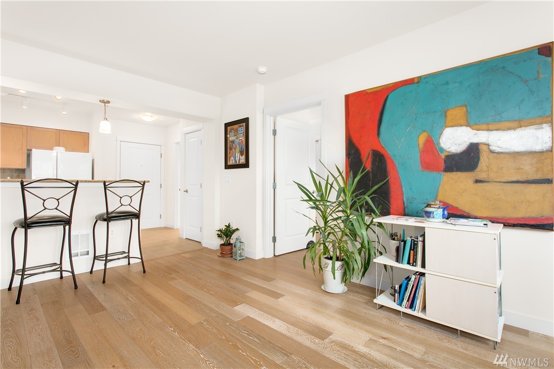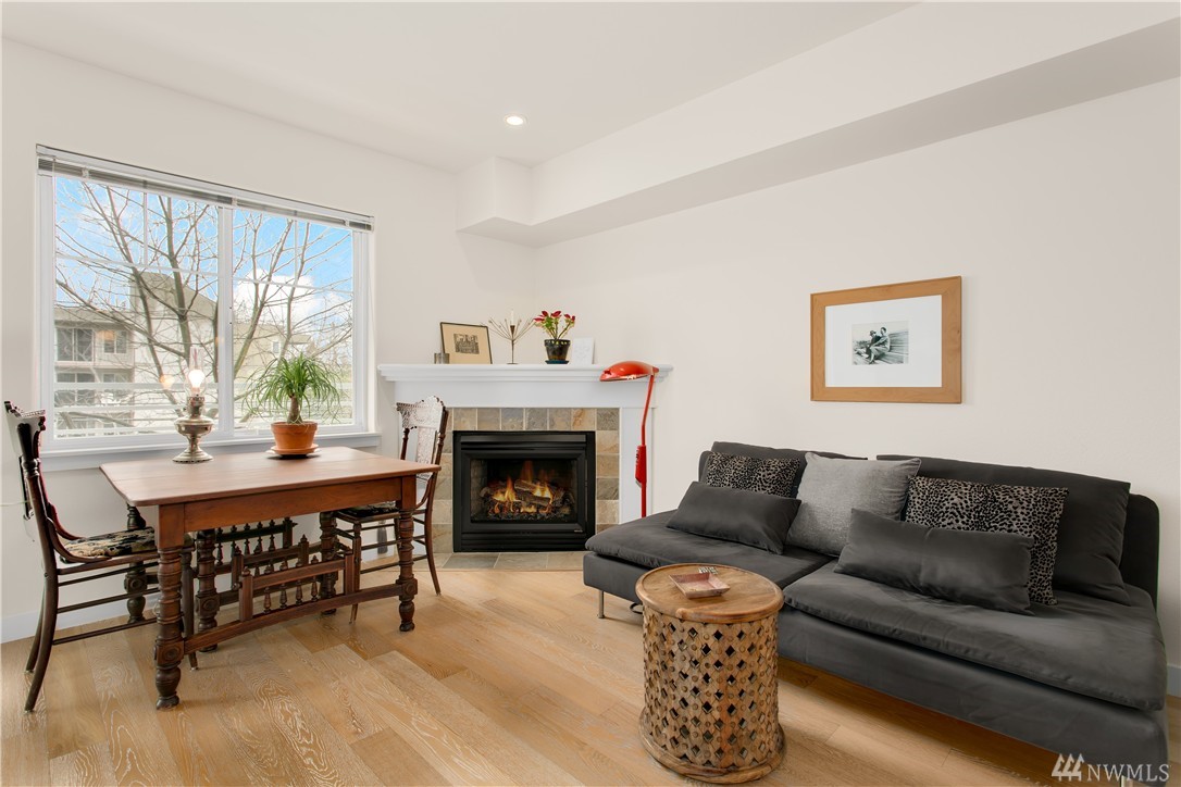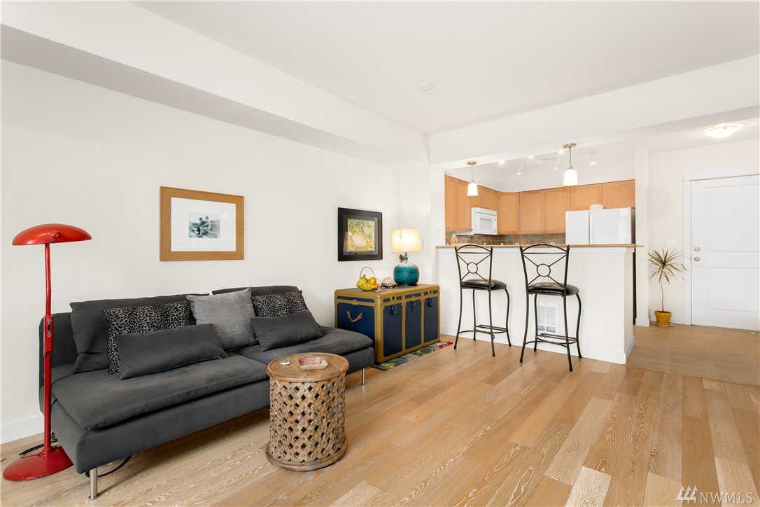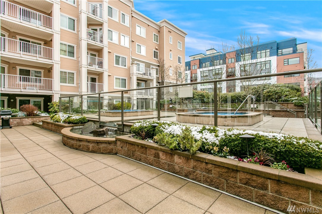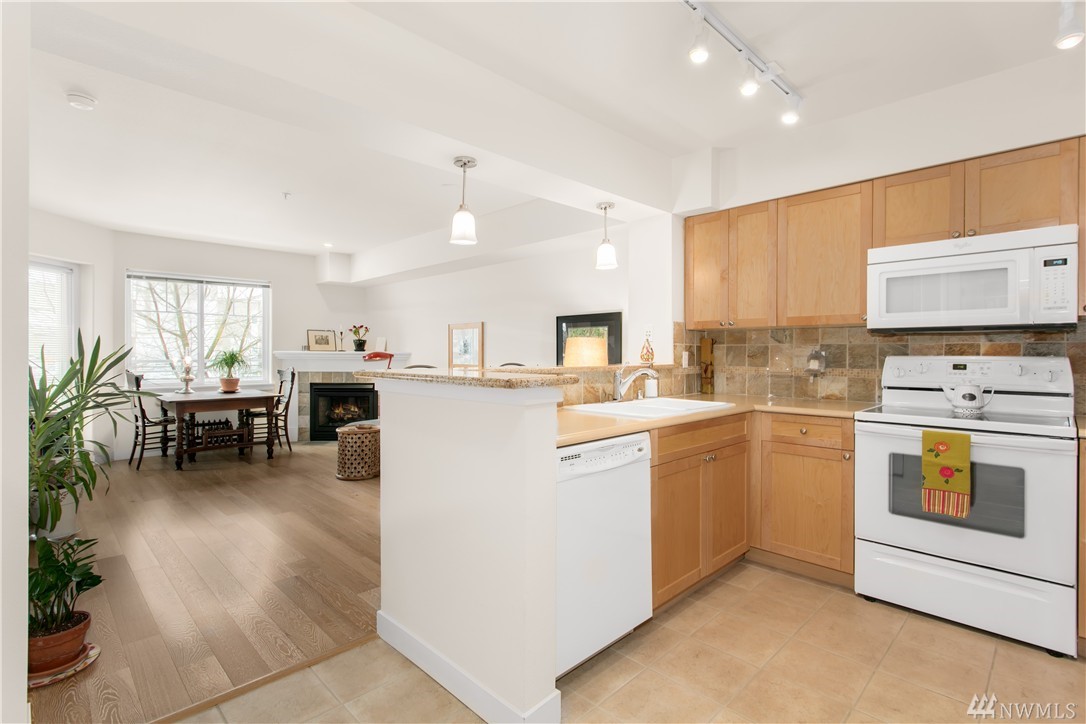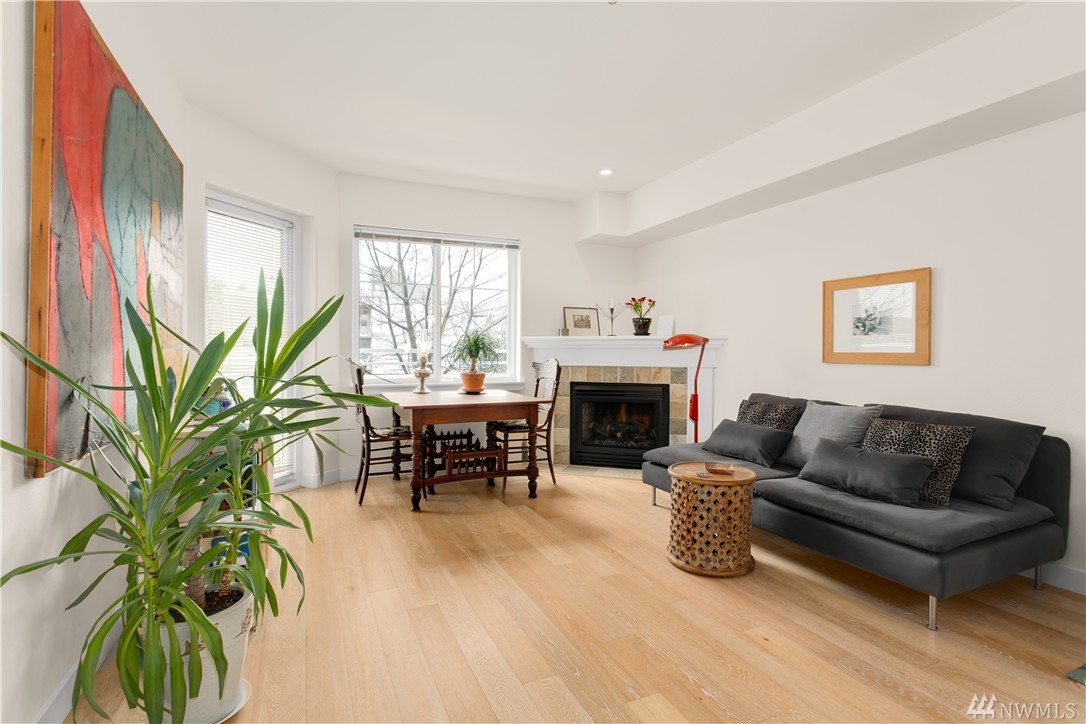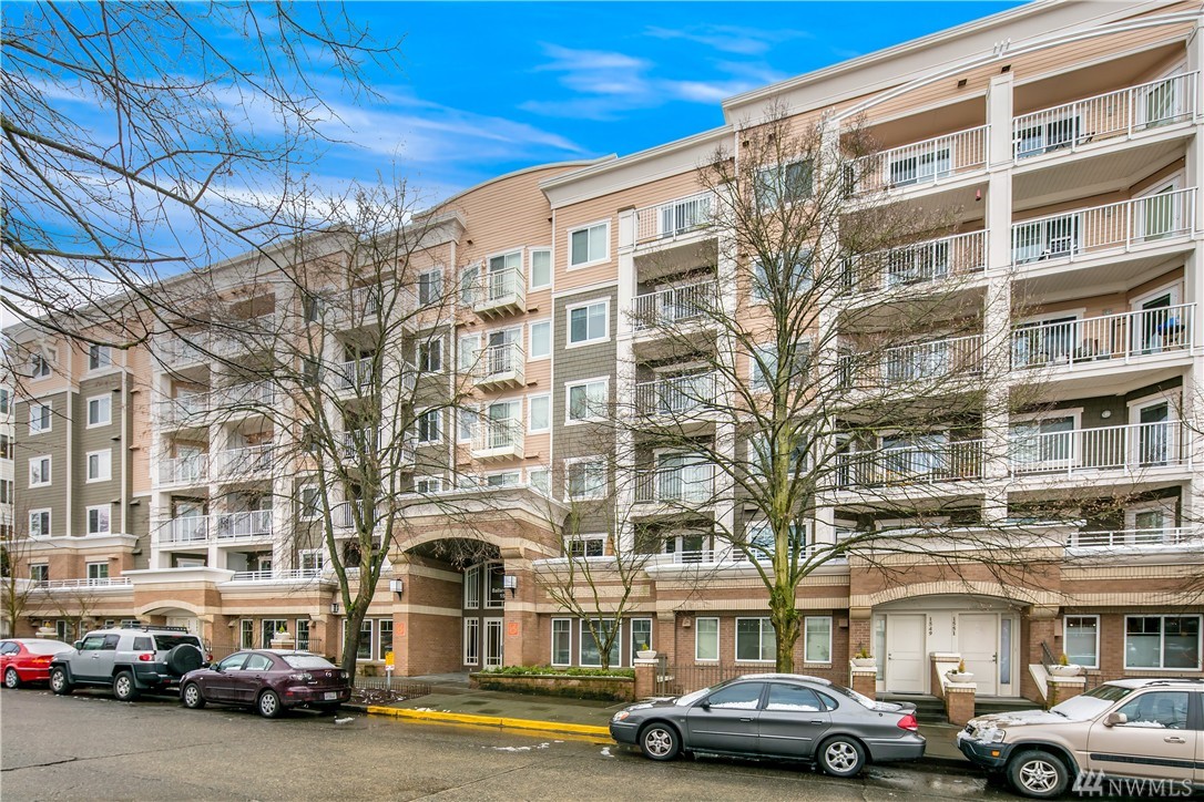 Live at the popular Ballard Place Condos! West facing 1 bedroom unit abundant w/natural light boasts new sand oak hardwood flooring, private patio & cozy fireplace. Open kitchen w/newer appliances, granite counters & maple cabinetry w/eating bar. Circular floor plan w/full bath, walk-in closet, in-unit washer dryer & 2 garage spaces! Low monthly dues, strong HOA & NO rental cap. Live in luxe w/concierge, business center, gym, hot tub, roof top deck & more! Near shops, eateries & entertainment!