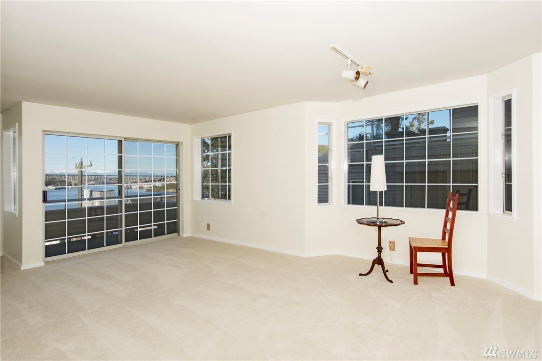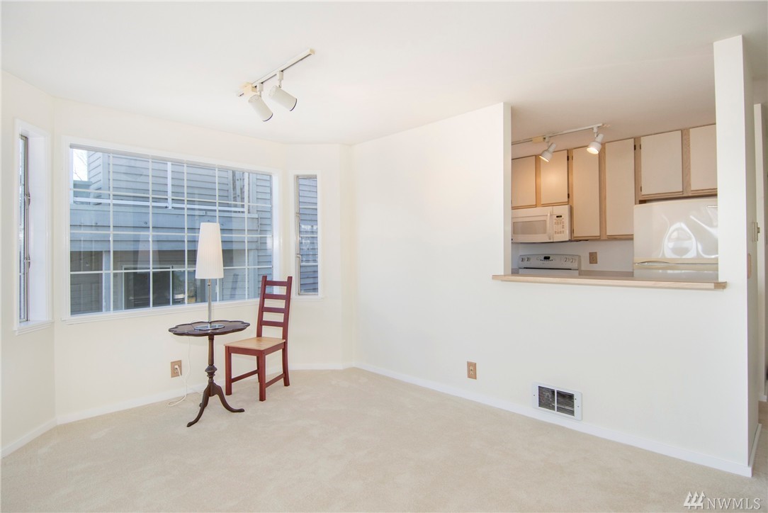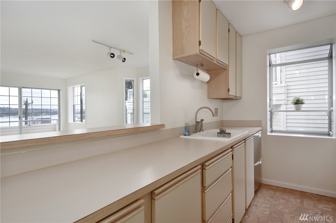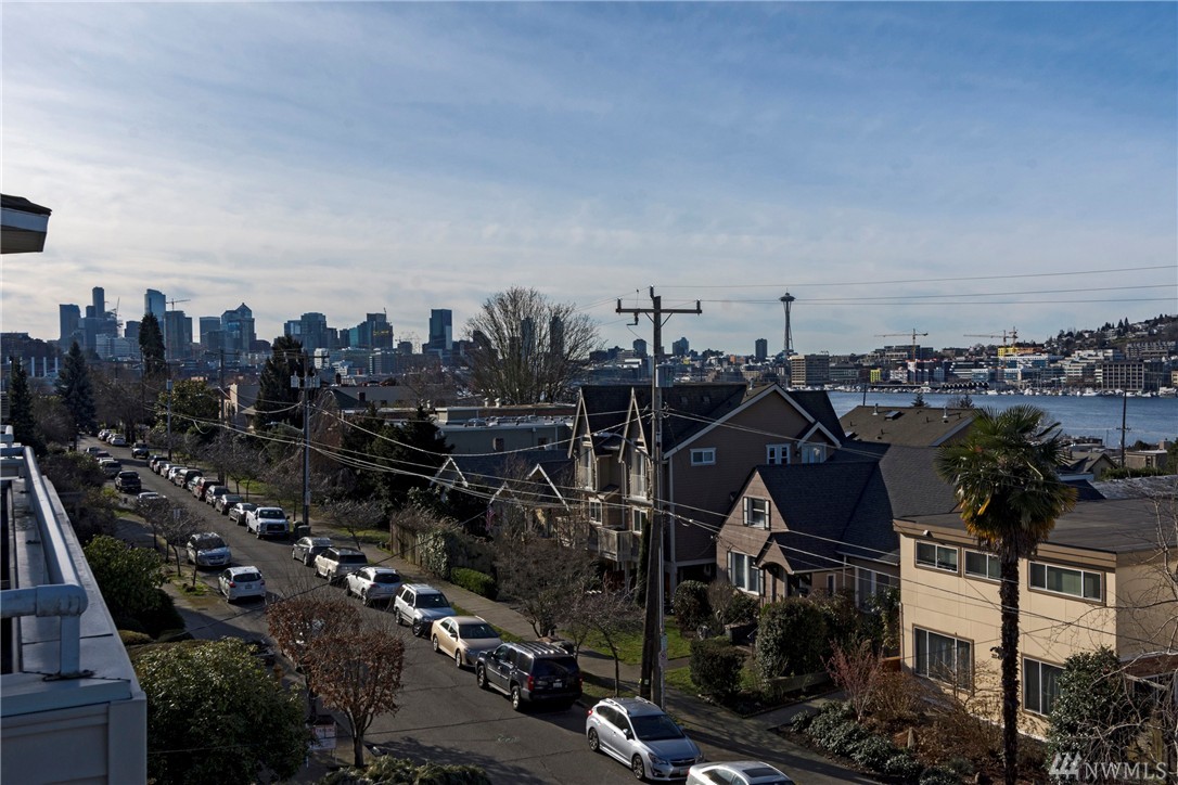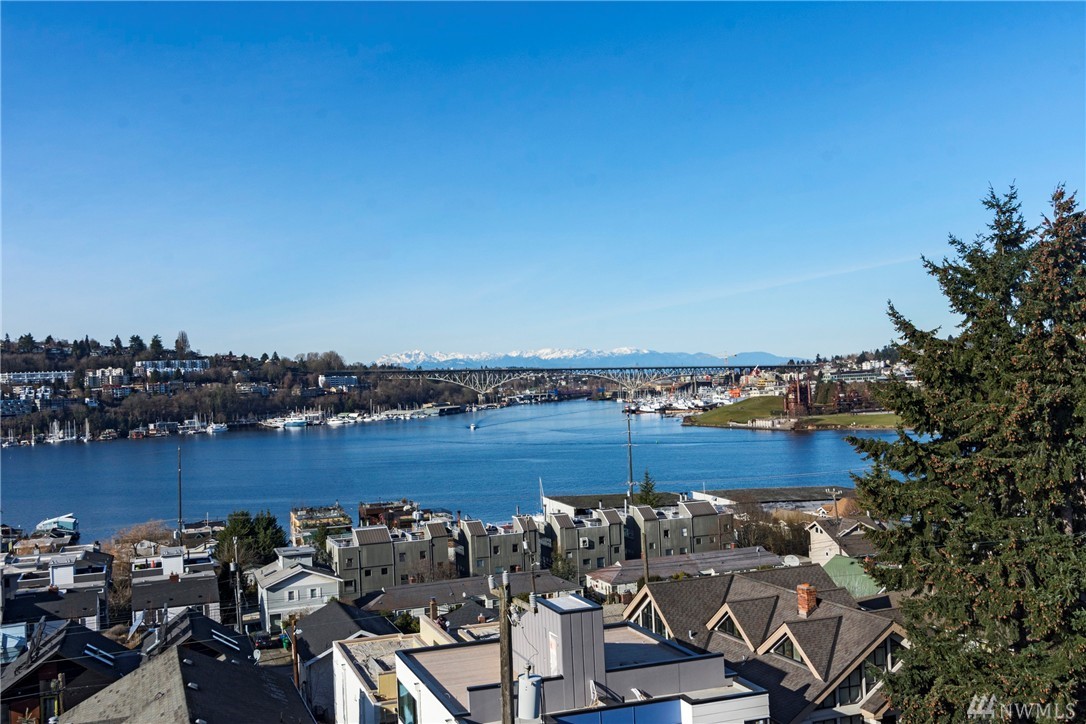 Prime location plus incredible, sweeping Views of Lake Union, Gasworks Park, Mountains, Downtown, & Space Needle. End-unit with extra windows which fill this home with bright, natural Light. Private deck facing West is the perfect spot to relax & take in the Sunsets. Brand-new carpet, paint, & Cork floors just completed. Parking + walk-in storage closet. Building has roof-top View deck. Located in the heart of Eastlake & just minutes to South Lake Union, Downtown, & University of WA.