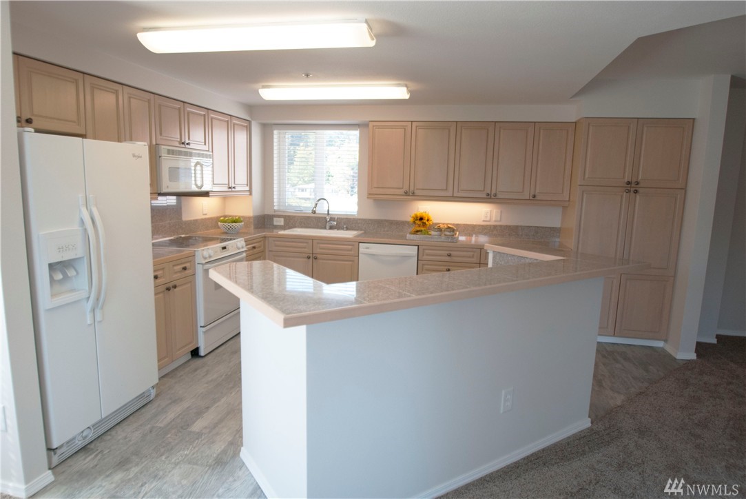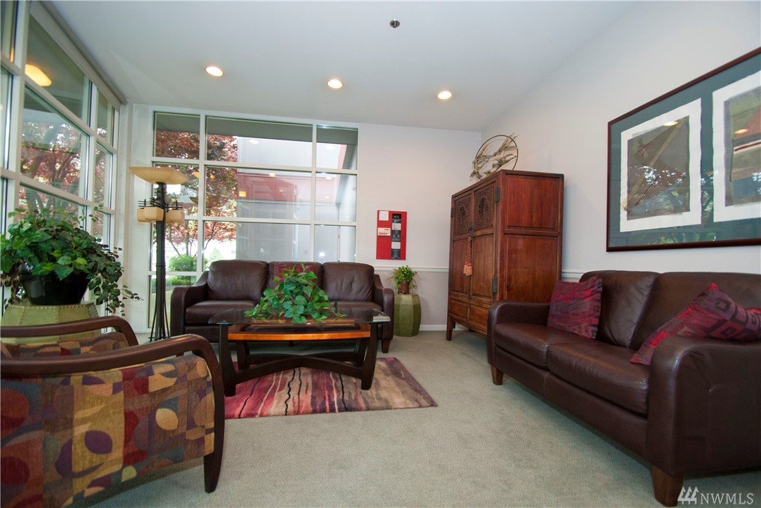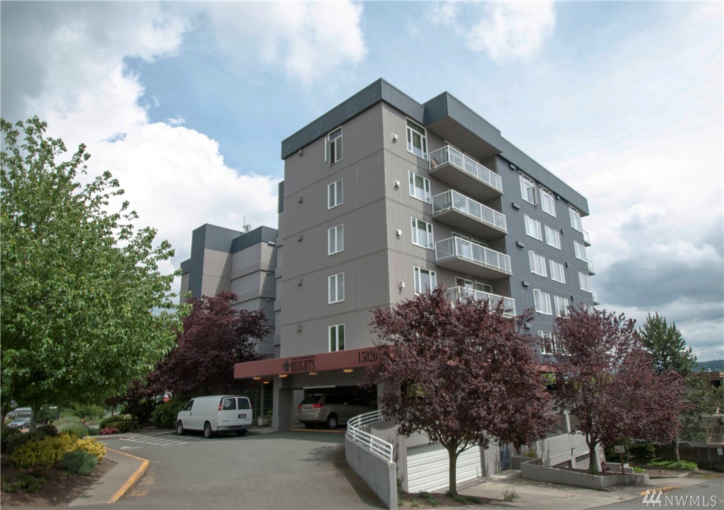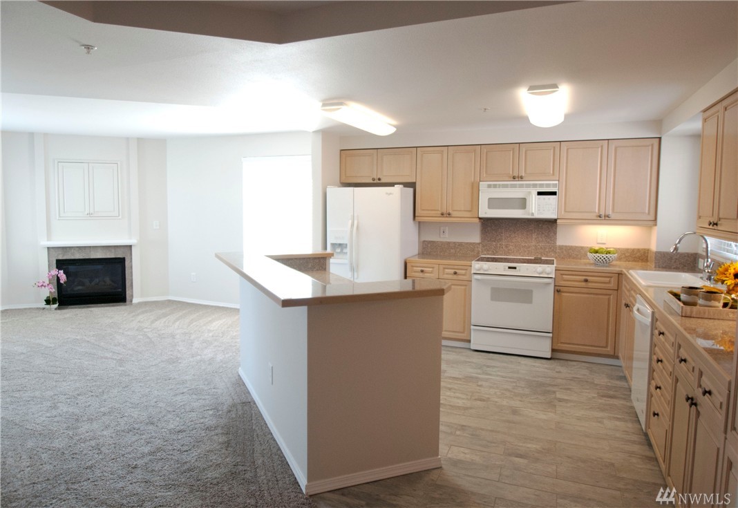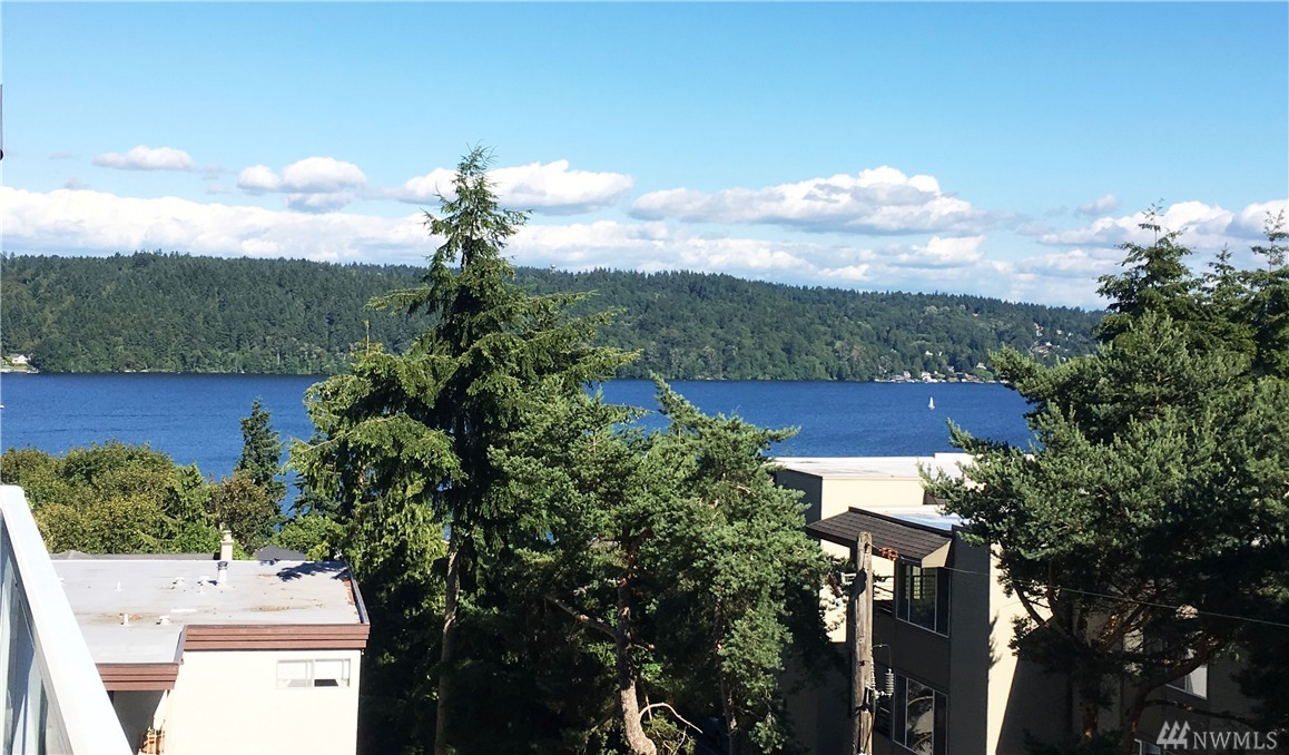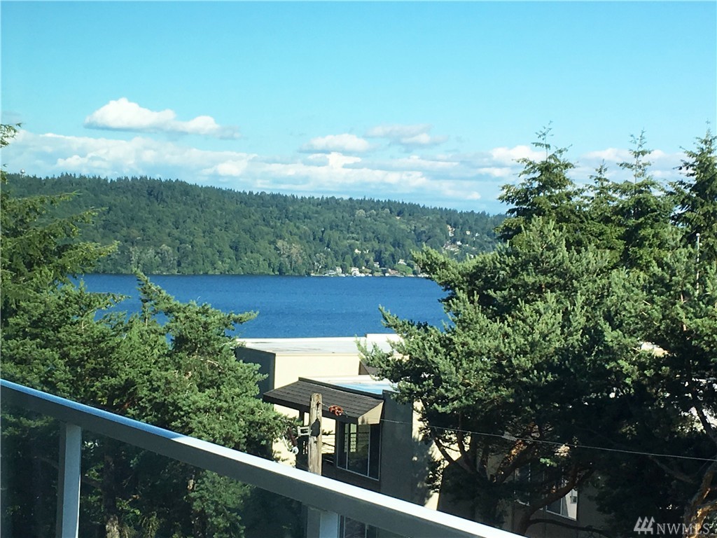 Beautiful home and great investment opportunity! Polished, freshly updated condo with water views from balcony, 2nd bedroom, & living room. Light-filled south-facing end unit w/ great room floor plan, gourmet kitchen, balcony & fireplace. Premier location 1 block from Burke-Gilman trail & 1 mile from LFP Town Center. Sophisticated & quiet, steel & concrete construction w/ elevator. New flooring, new paint. Newer appliances. 2 storage rooms. Garage parking. Handicap accessible.