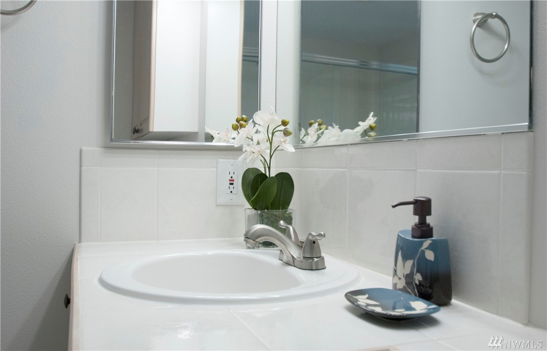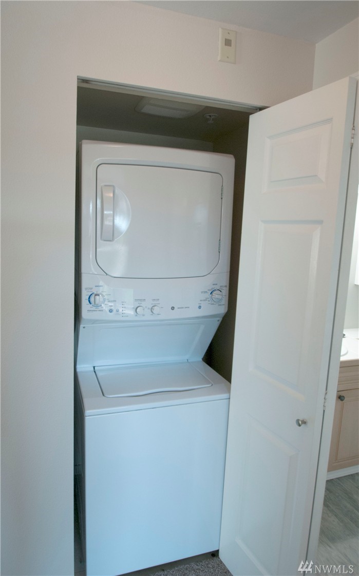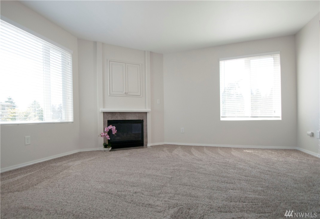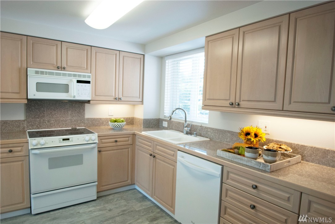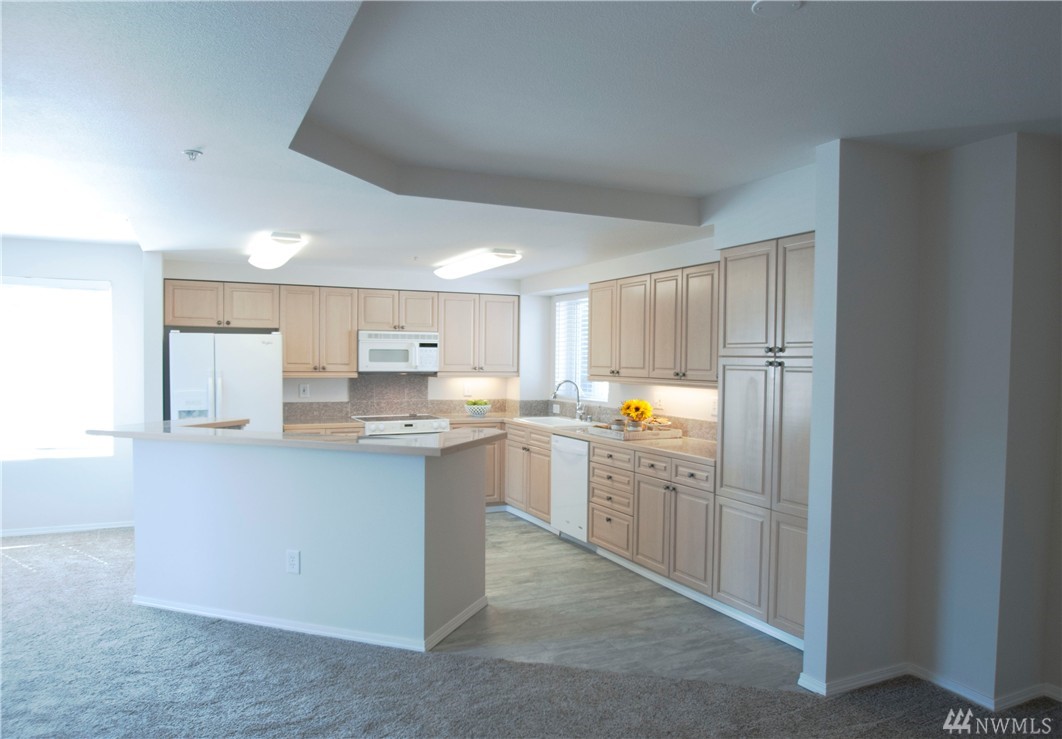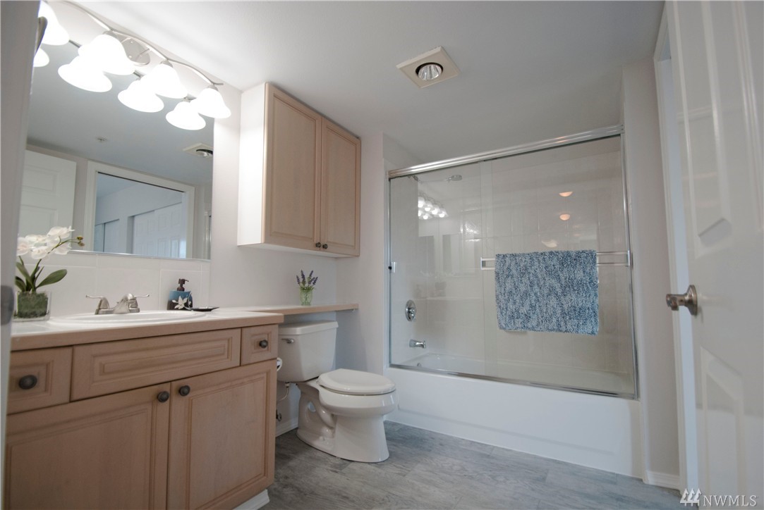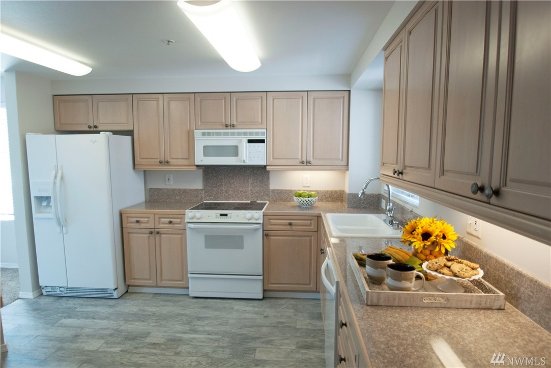 Beautiful home and great investment opportunity! Polished, freshly updated condo with water views from balcony, 2nd bedroom, & living room. Light-filled south-facing end unit w/ great room floor plan, gourmet kitchen, balcony & fireplace. Premier location 1 block from Burke-Gilman trail & 1 mile from LFP Town Center. Sophisticated & quiet, steel & concrete construction w/ elevator. New flooring, new paint. Newer appliances. 2 storage rooms. Garage parking. Handicap accessible.