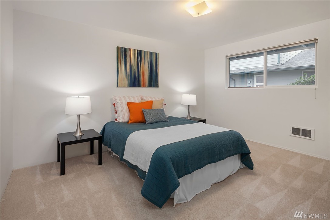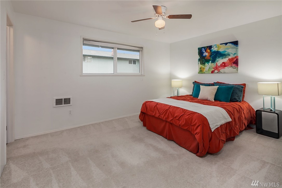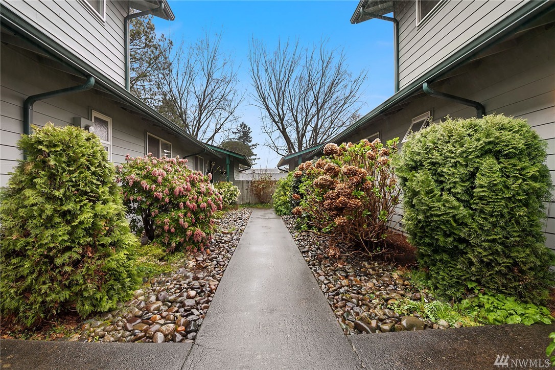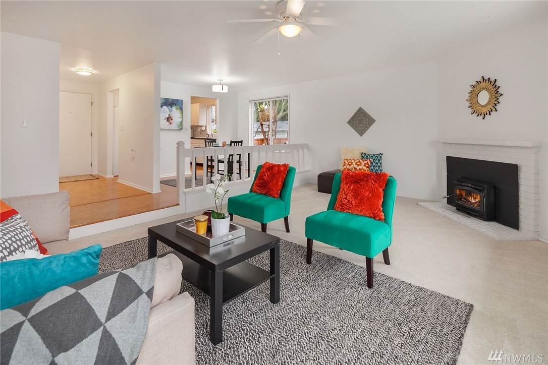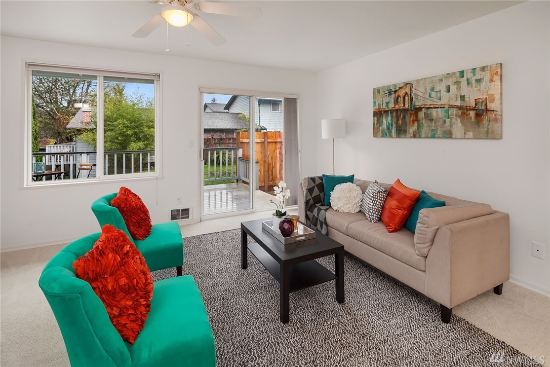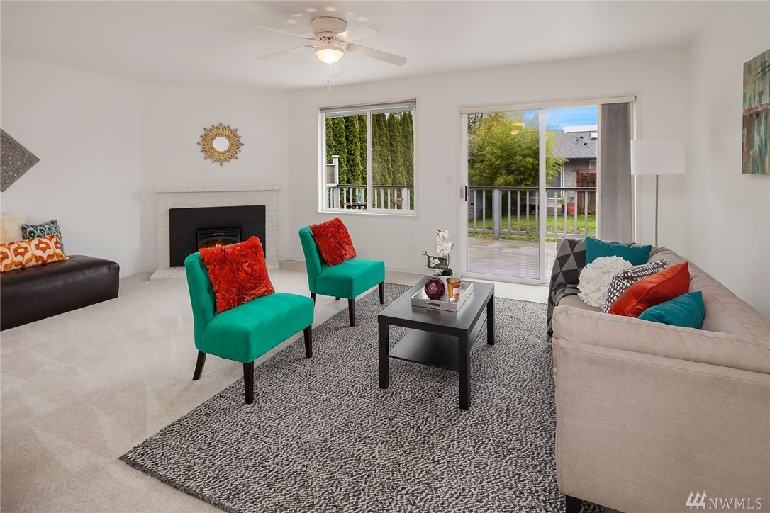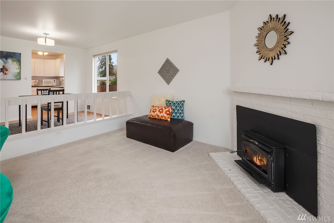 Retreat from the city in this charming & spacious 3-bed condo. End unit in quiet neighborhood. Hardwood floors throughout entry, hallway & dining room. Sunken living room w/ carpet & wood burning fire place. Glass sliders lead to private deck, patio & small yard. Guest bath has new shower/tub. Large bedrooms w/ windows allowing for natural light. Master bedroom offers ample closet space & fully renovated bath. Large 1-car garage & additional parking. Close to I5 & future light rail station.