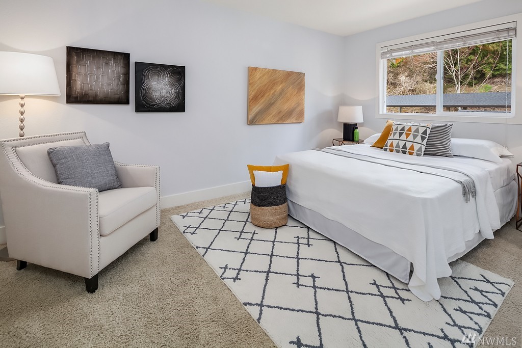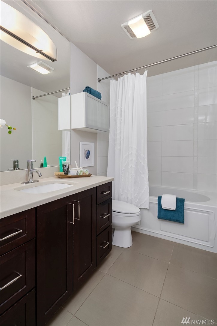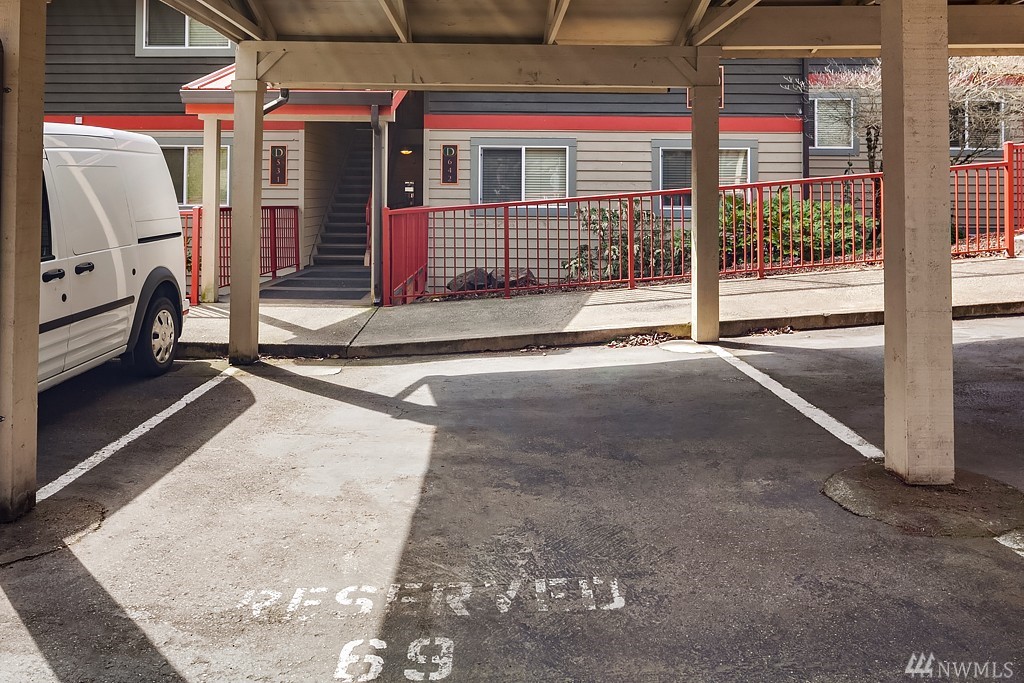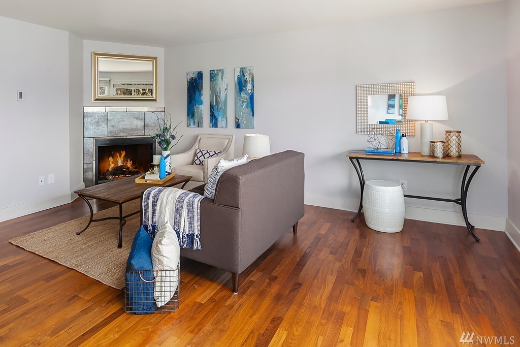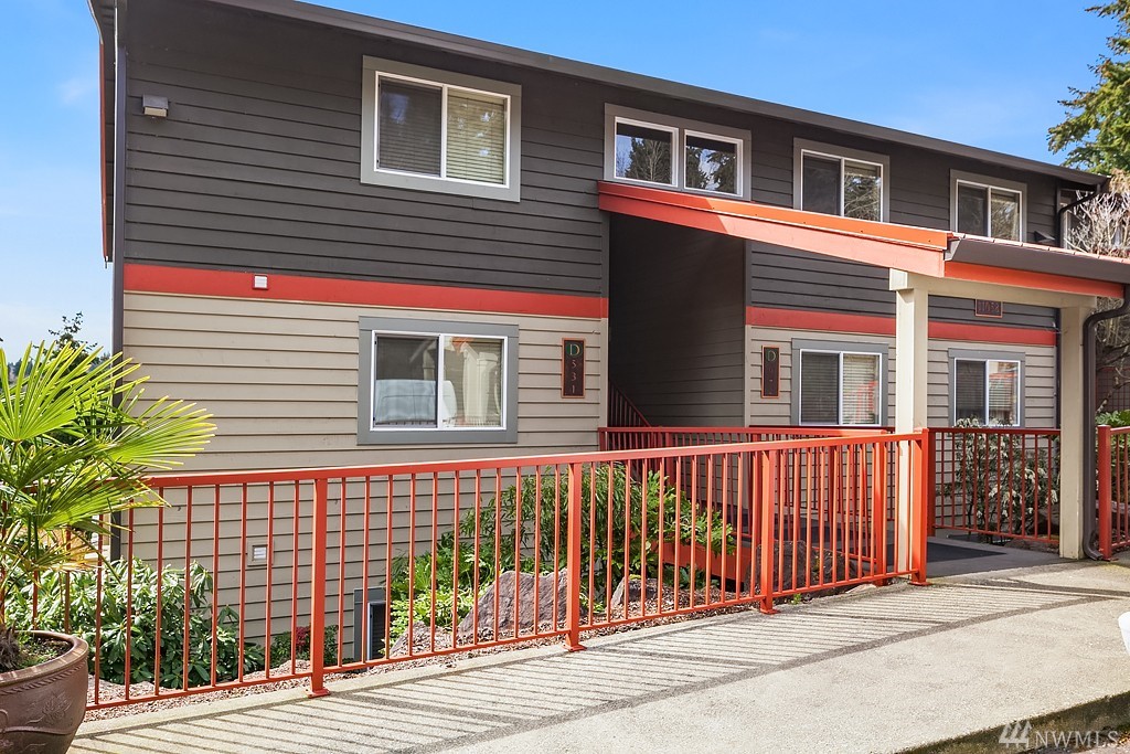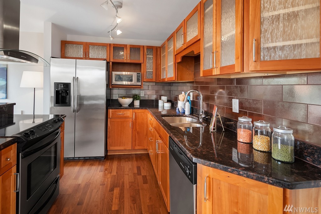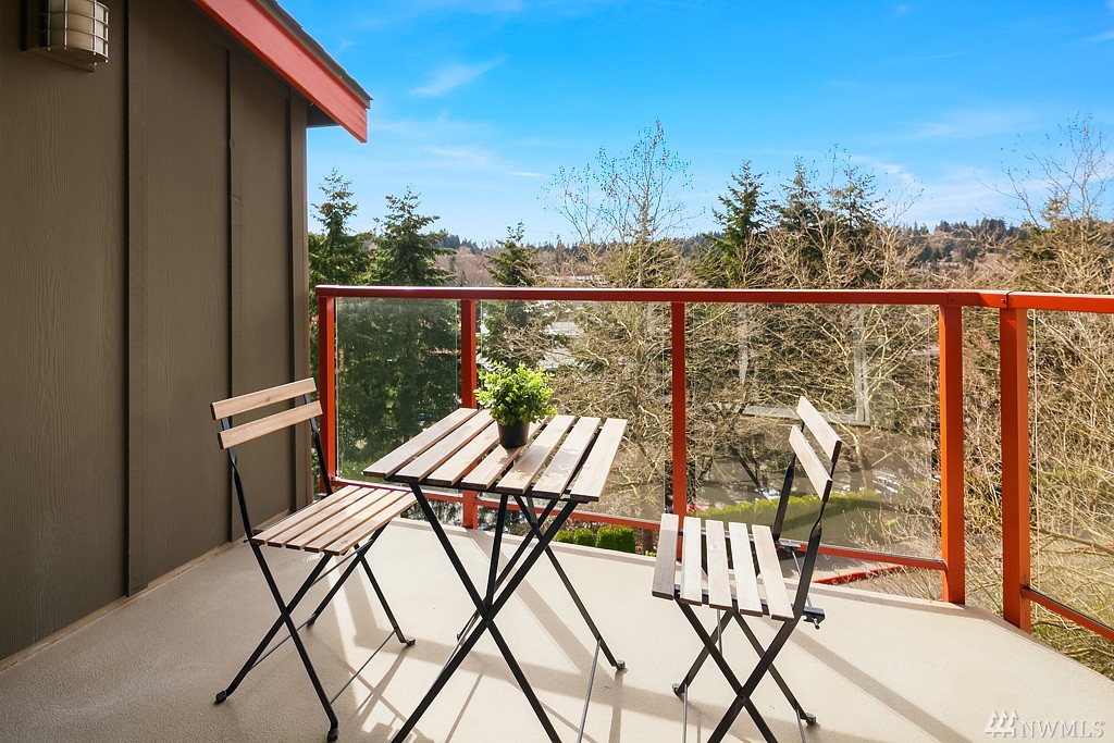 Highly desirable top unit! Stunning 2 bed, 1 bath condo perfectly situated just 2.5 miles from the NEW Spring District development via the Eastside Rail Corridor Regional Trail. Enjoy a gourmet kitchen with impeccable granite slab countertops, SS appliances, cherry cabinets and a breakfast bar. Luxurious hardwood floors, wood burning fireplace, tile in the bath & deck with storage provide the perfect place to relax. One covered parking spot. Close to bus lines and easy access to 405 & 520.