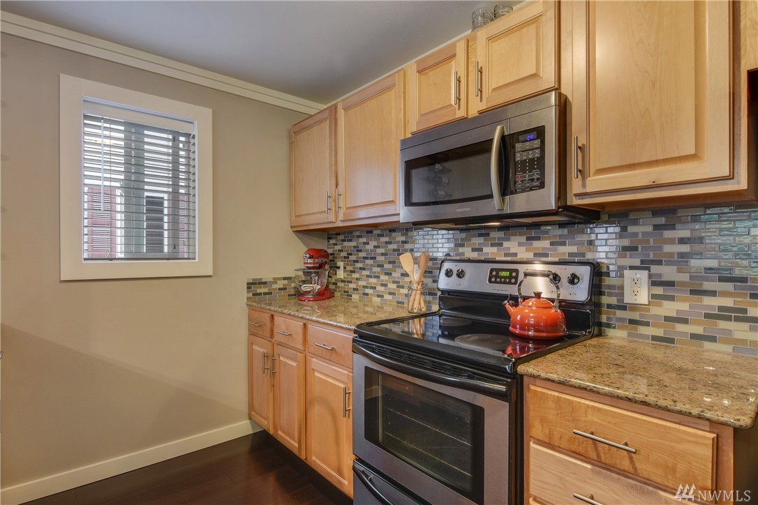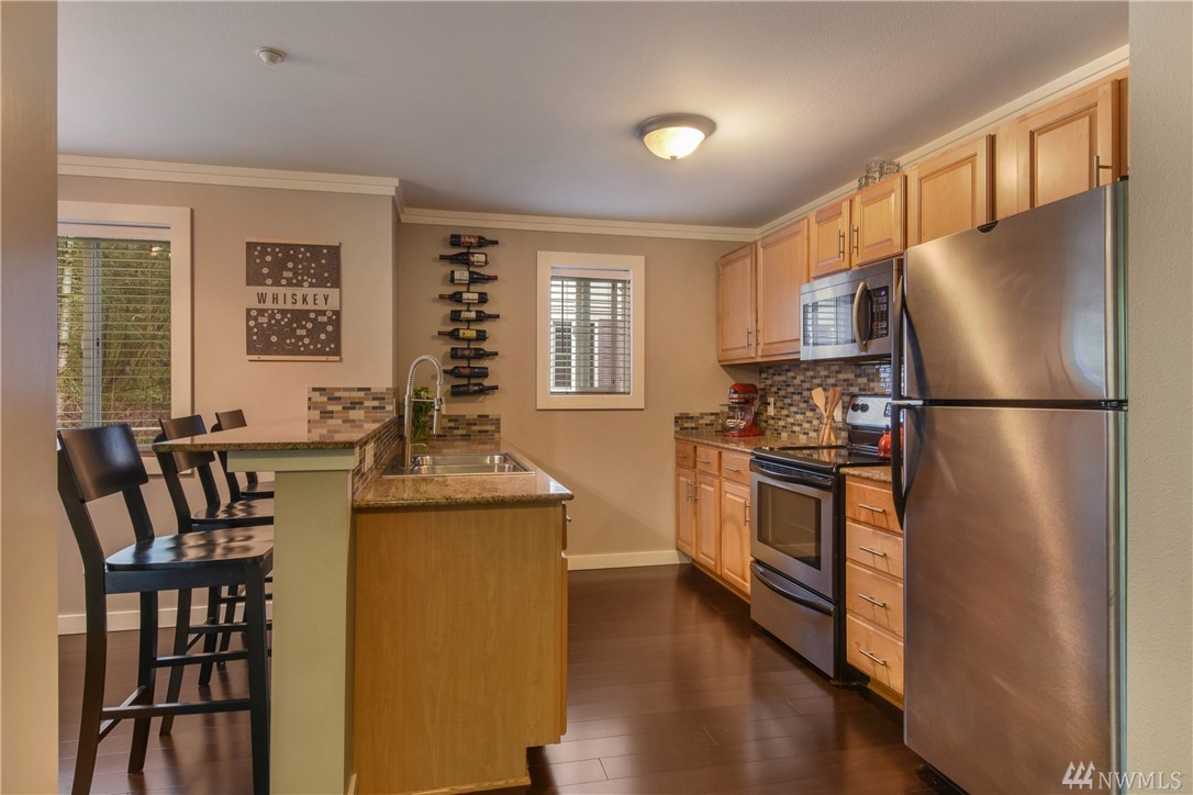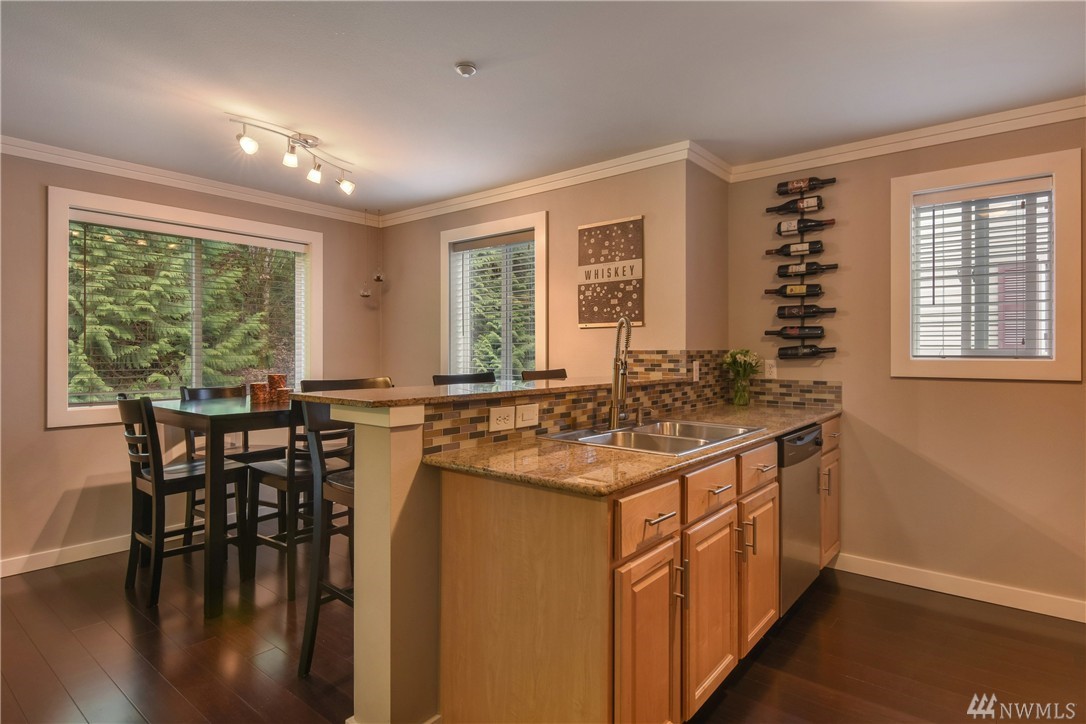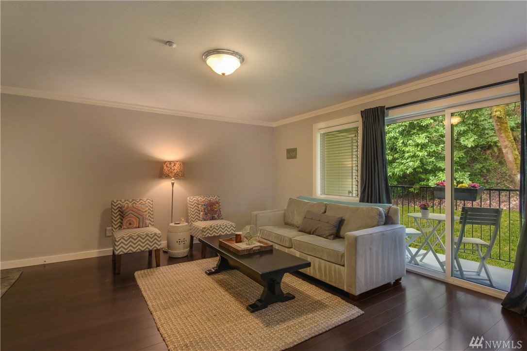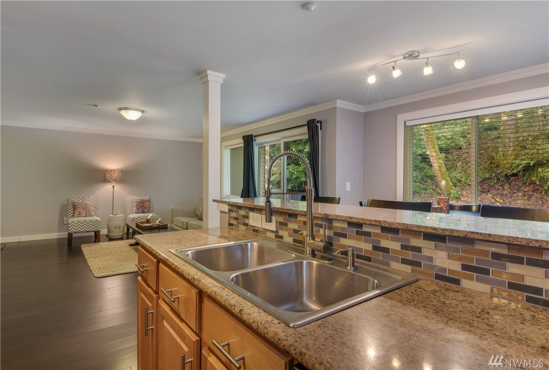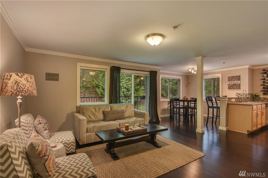 Beautifully redone, chic Issaquah condo boasts: solid bamboo hardwood floors throughout, open kitchen concept w/ bar, stainless steel appliances and granite counters. Custom paint & molding, plus gorgeous full baths, w/ slate flooring (master bath is heated). Enjoy morning coffee from your private deck that backs to a lush greenbelt, two car garage, plus ample storage inside & out. Close proximity to downtown shops, restaurants and more, sought after Issaquah school district and low HOA dues!