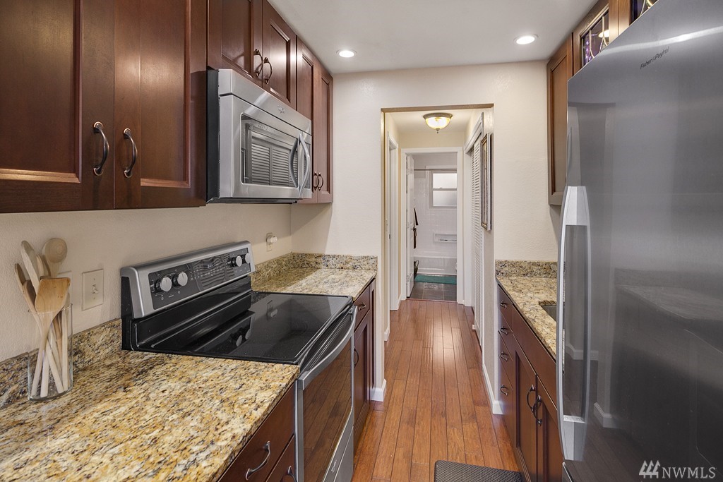 Rare offering - Renovated condo on great street in Ballard. Small, quiet building of exceptional condition. Hewn hardwoods thru out. Total remod kitchen w/newer cabs/appl/lighting, etc. Spacious bedroom w/good storage. Modern bath sparkles! Secure, common laundry just steps away. Secure storage locker. Off street parking. Pets Ok, with restrictions. Simple, elegant place to call home!