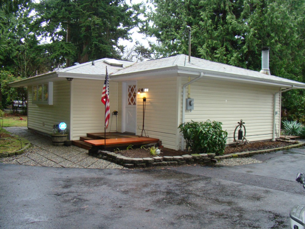 Nestled among towering evergreens this meticulously maintained home features:1bedroom,1bath with a steam shower & appx.800 sq.ft of comfortable living space,living room featuring a real fireplace,natural wood paneling and large windows that overlook the beautiful back yard,kitchen offers a large counter eating bar & newer appliances,1 car detached garage/work shop.The garden is like a paradise & offers a tranquil setting outdoors with a nicely landscaped double lot filled with trees & shrubs.