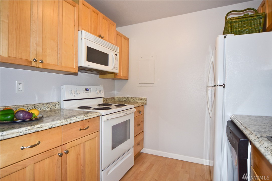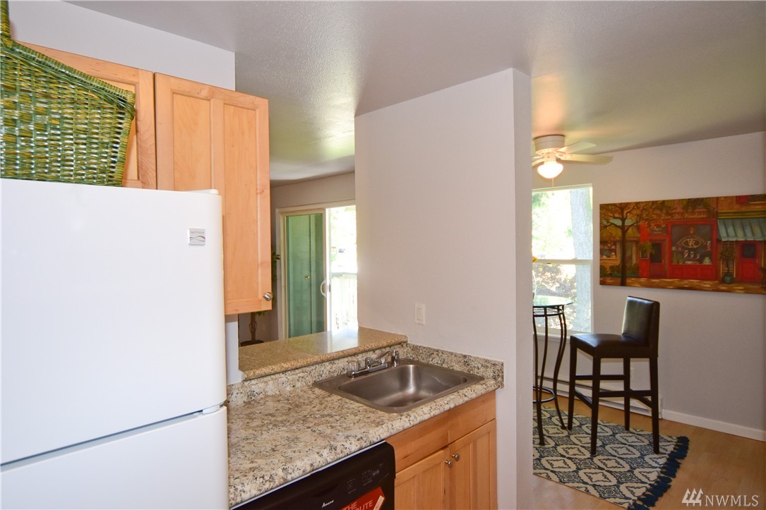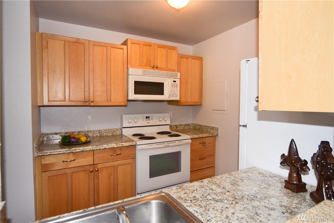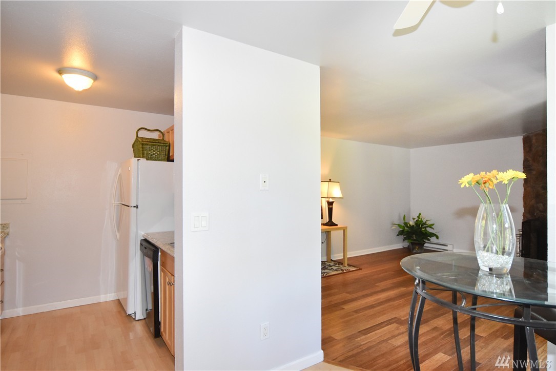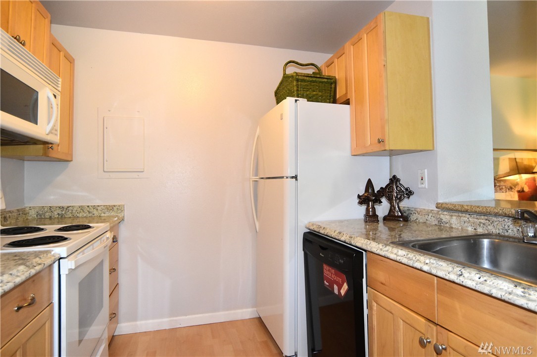 Move-in ready, cute & updated 2bed condo available at center of Federal Way! Top floor, Tile entry, view of community yard, Fresh paint, Hdwd flr through out, updated bathrm w/tile flr, Master has walk-in closet, Living rm w/a cozy fireplace(surrounding deco larva stone up to ceiling), Kitchen w/accent granite countertop, Dining rm, slider to deck & storage, All appliances stay, W/D in unit. Outdoor pool, club house & athletic court. Close to Hway, shopping, park & community centers. Must see!