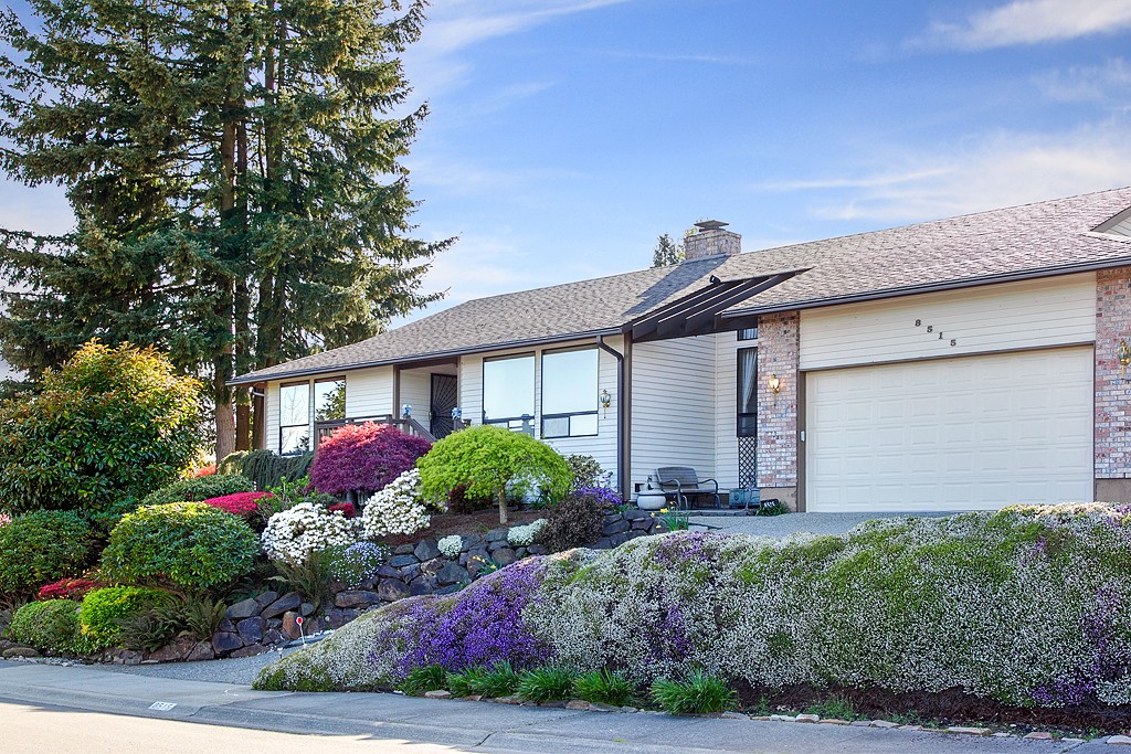 Issaquah School District! A resort in your backyard perfect for this time of year. Bask in the sun on your entertainment sized deck & enjoy the soothing sound of the beautiful waterfall. Hard to find larger one story home w/ Mount Ranier and territorial views. Vaulted ceilings, substantial brick fireplaces, windows that invite the sun in, open formal spaces & warm casual spaces. Extra large master suite & two good sized bedrooms. Expansive corner lot/professionally landscaped. Fabulous location!