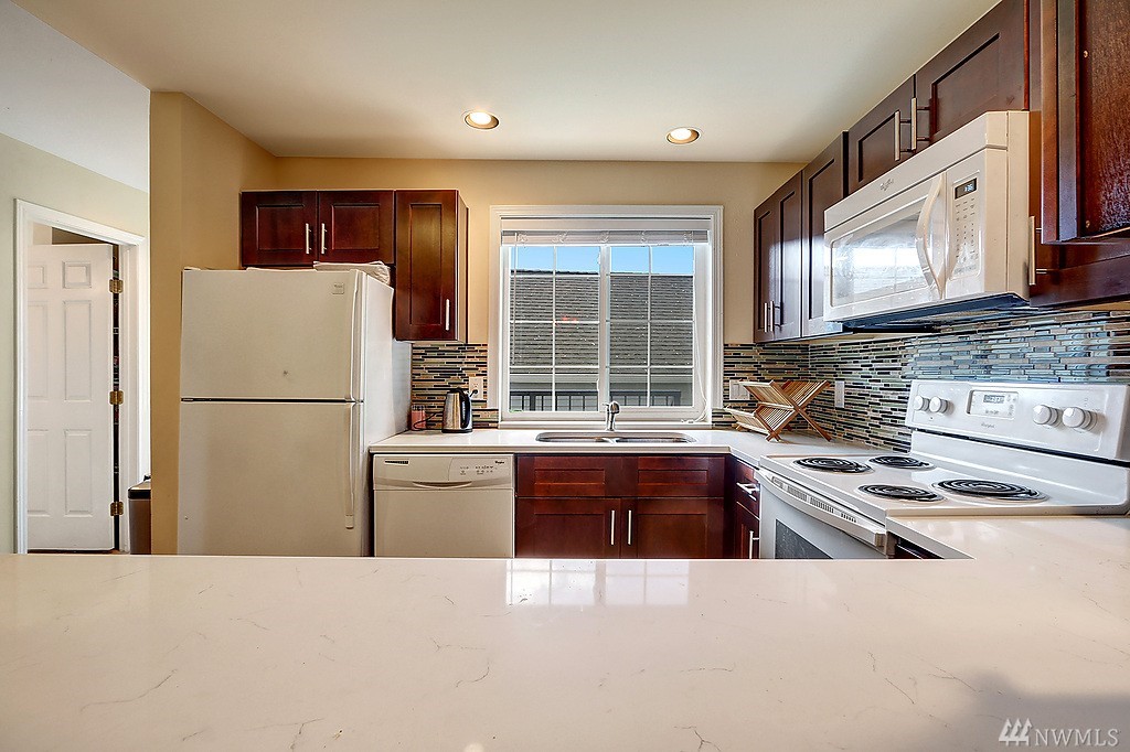 Relax in the peaceful beauty at Millers Pond. End unit townhome style condo. New roof, siding and windows. Inside boasts a remodeled kitchen with quartz countertops and tiled backsplash. Enjoy the tranquil park-like setting from your balcony off the living room. Upstairs boasts 2 master suites, one with a walk in closet. Full size laundry located between the bedrooms! All appliances stay. Plenty of storage as well as a detached garage and reserved parking space. Security system & tv go w/seller