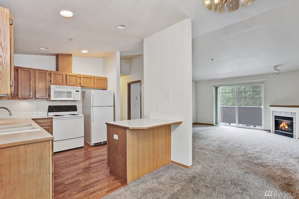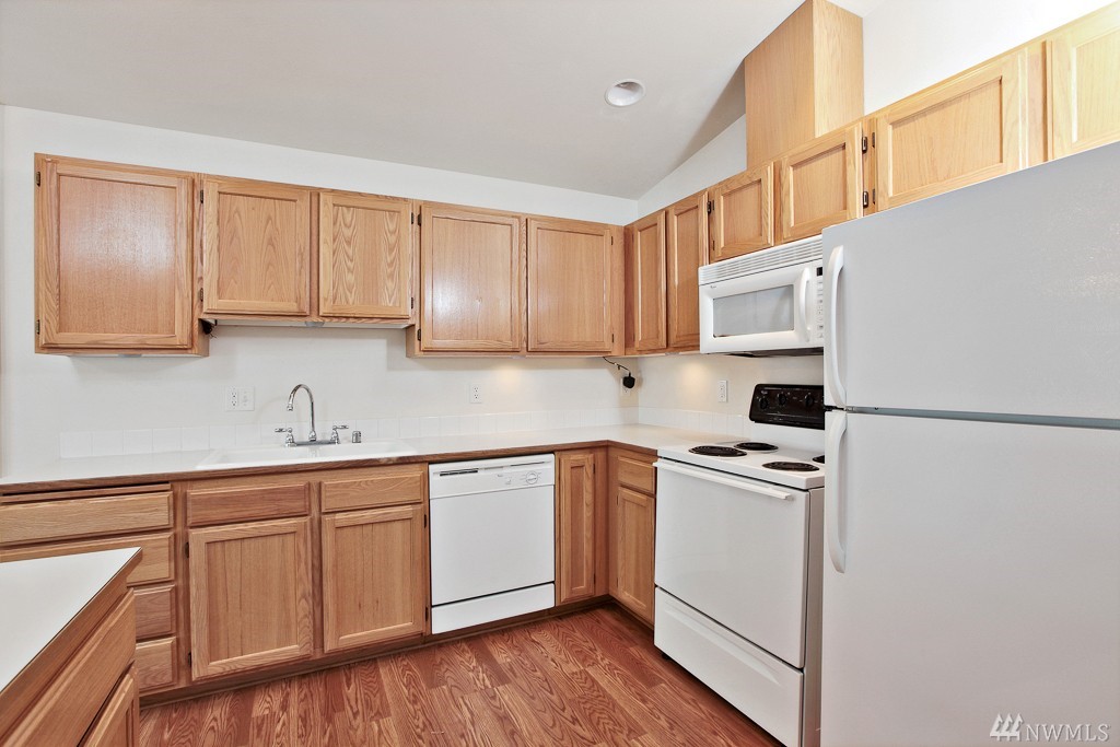Well maintained end unit condo on top floor of 2 story building. Newer carpet, vaulted ceilings, cozy gas fireplace w/spacious kitchen and dining room. Master bed with 3/4 bath and large closets. Two more bedrooms, with full bathroom. Washer and Dryer in unit. 1 assigned parking spot, PLUS garage. Gated community, with sport court, cabana, Mukilteo schools, close to everything, community transit & school bus stop out front! Price to sell now! FHA APPROVED COMPLEX!