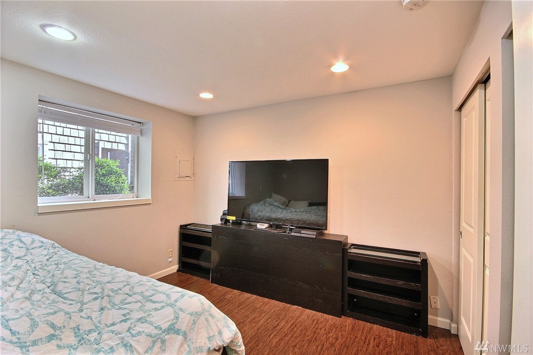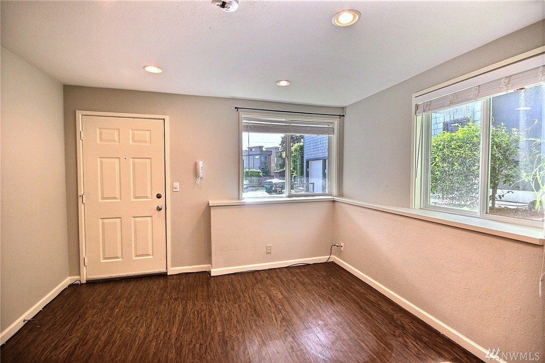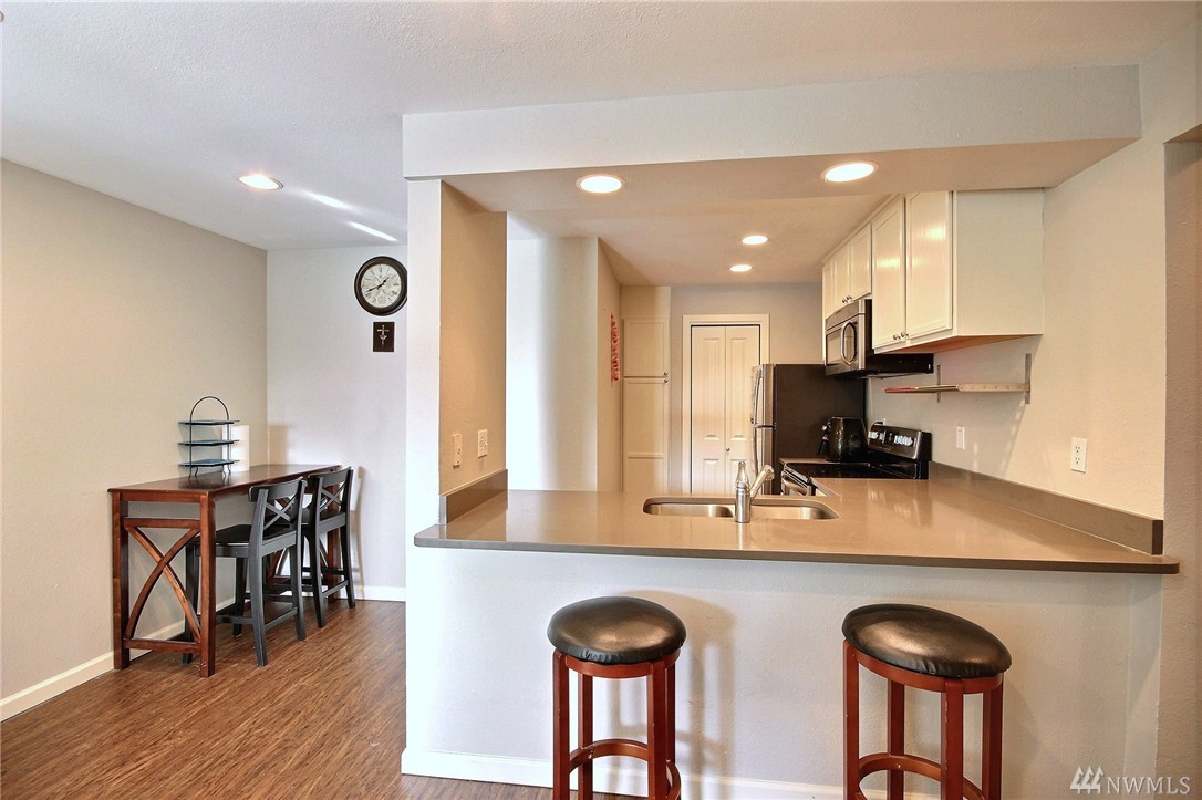 Spectacular Location! This lovely quiet ground floor condo features 1 bedroom plus den/office with closet (possible 2nd bedroom) & 1 full bathroom, double-pane windows. Open kitchen has been updated with quartz countertops & undermount sink. This condo is just minutes away from the beach, parks & restaurants. Easy to commute to freeways and DowntownSeattle!
