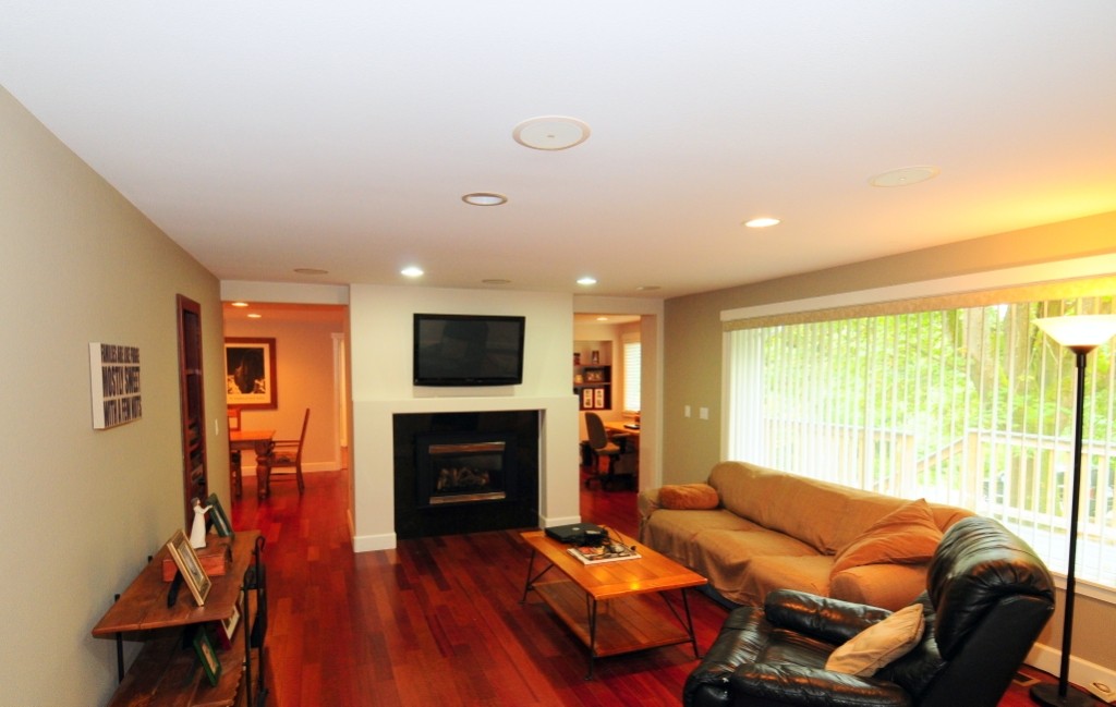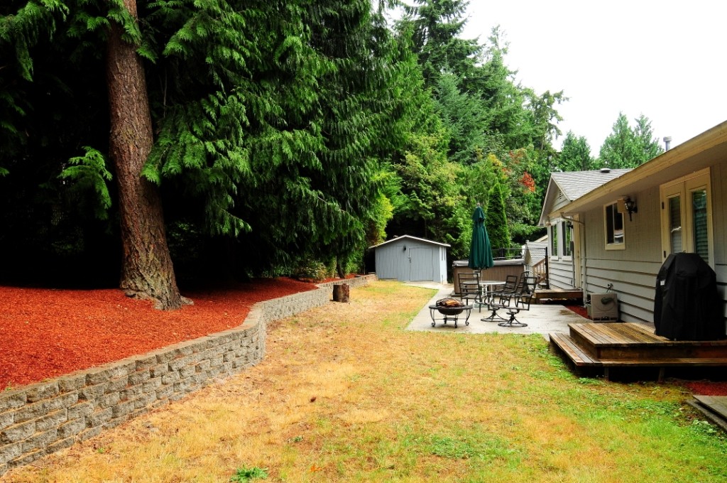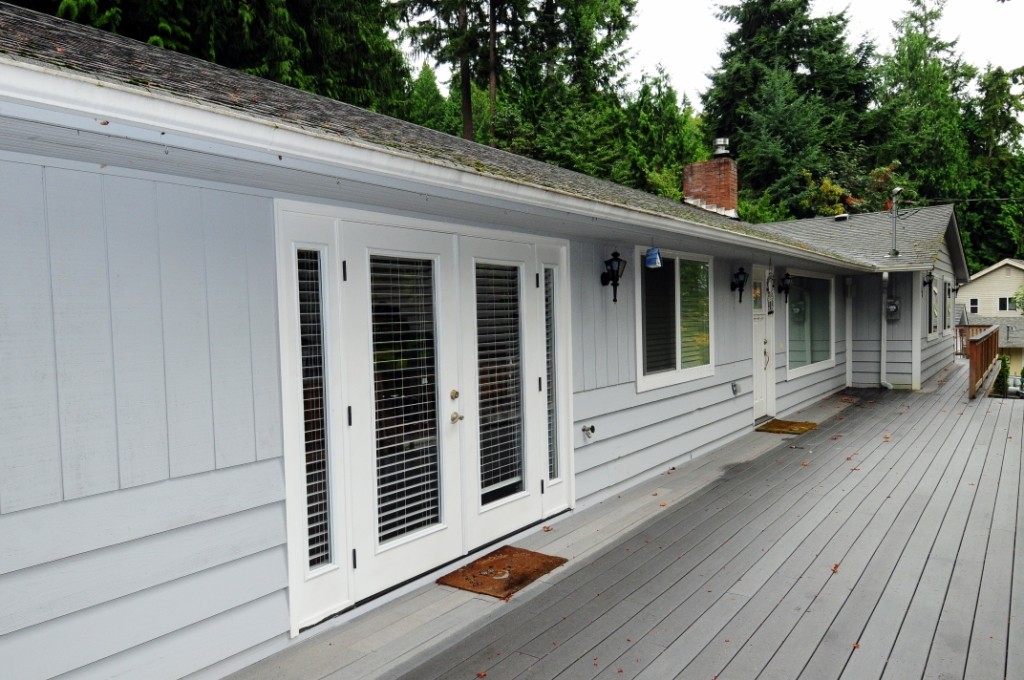 Sammamish Seclusion! Convenient location with quiet privacy & lake view, Complete remodel to studs 4Br 1.75Ba open rambler, Extensive list of features; Brazilian cherry hardwoods & slab granite throughout. Kitchen boasts custom cabinets, dbl oven, 5 burner range, lg pantry, recessed lighting, AC, new electrical, plumbing & windows. French doors in master lead to wrap around deck, mature landscaping & pvt patio w/hot tub, Automatic Generator, fenced yard. 2 car garage, RV parking, beach rights