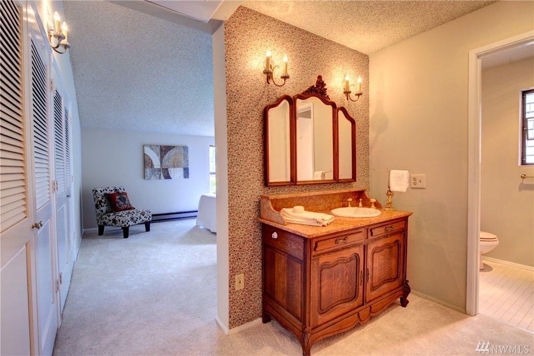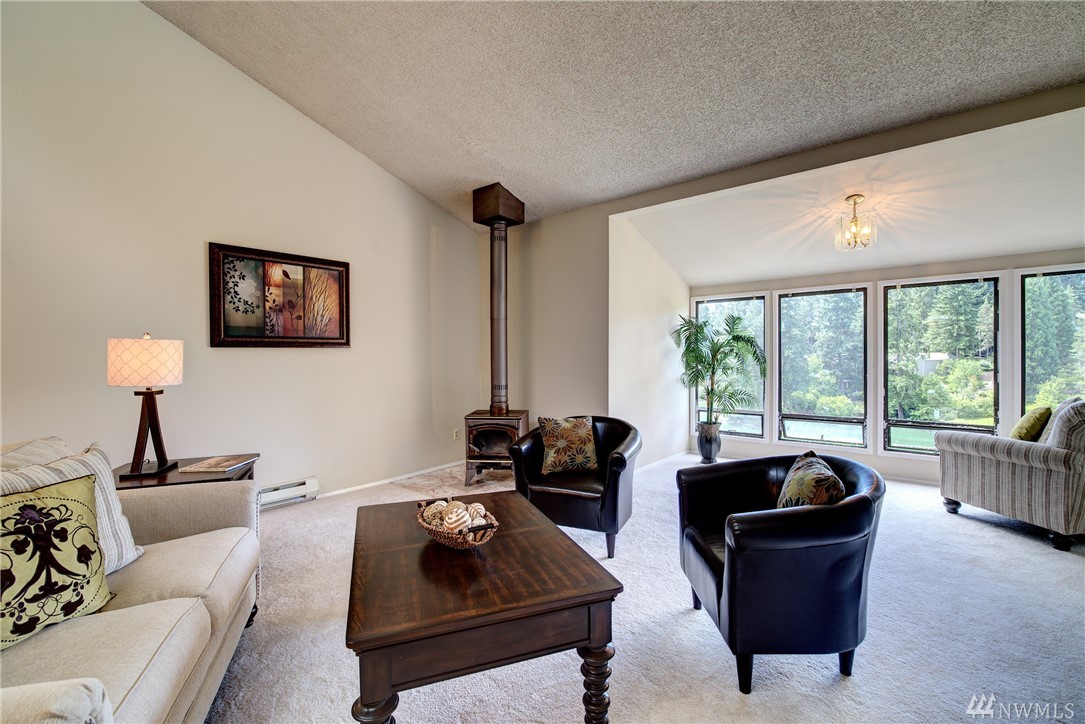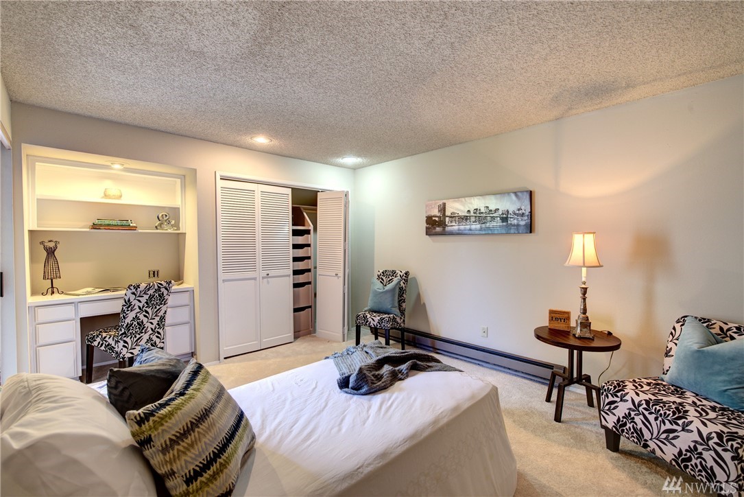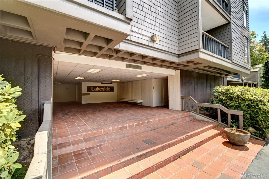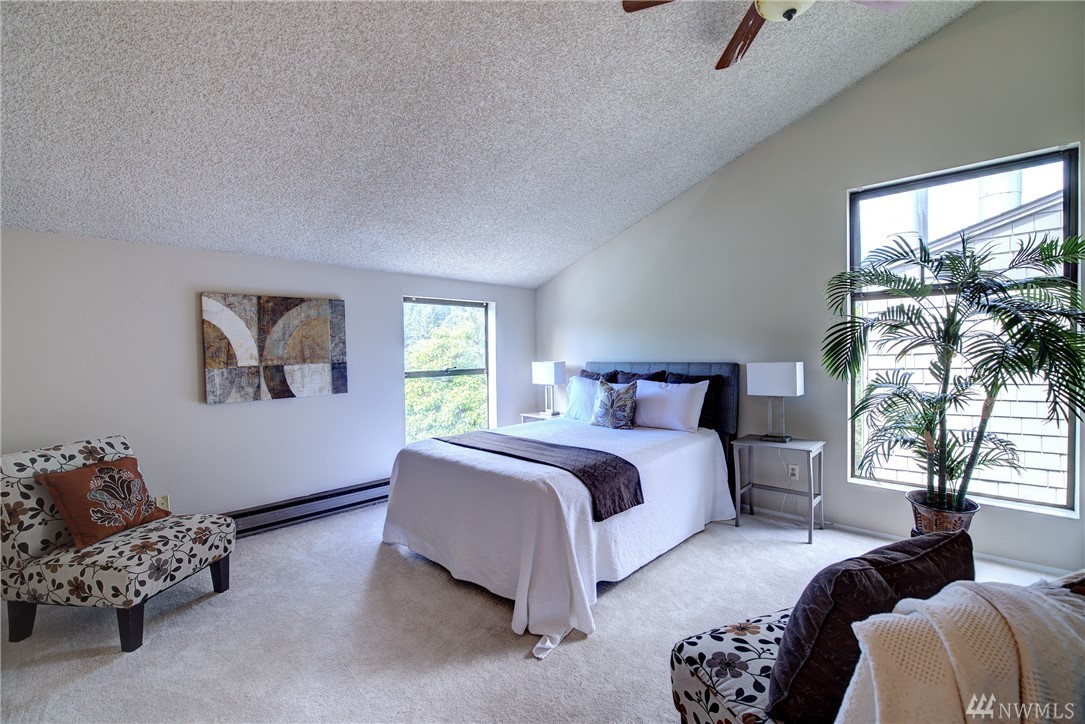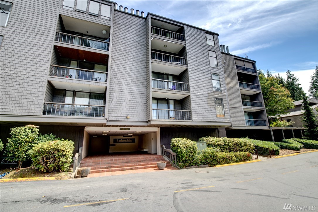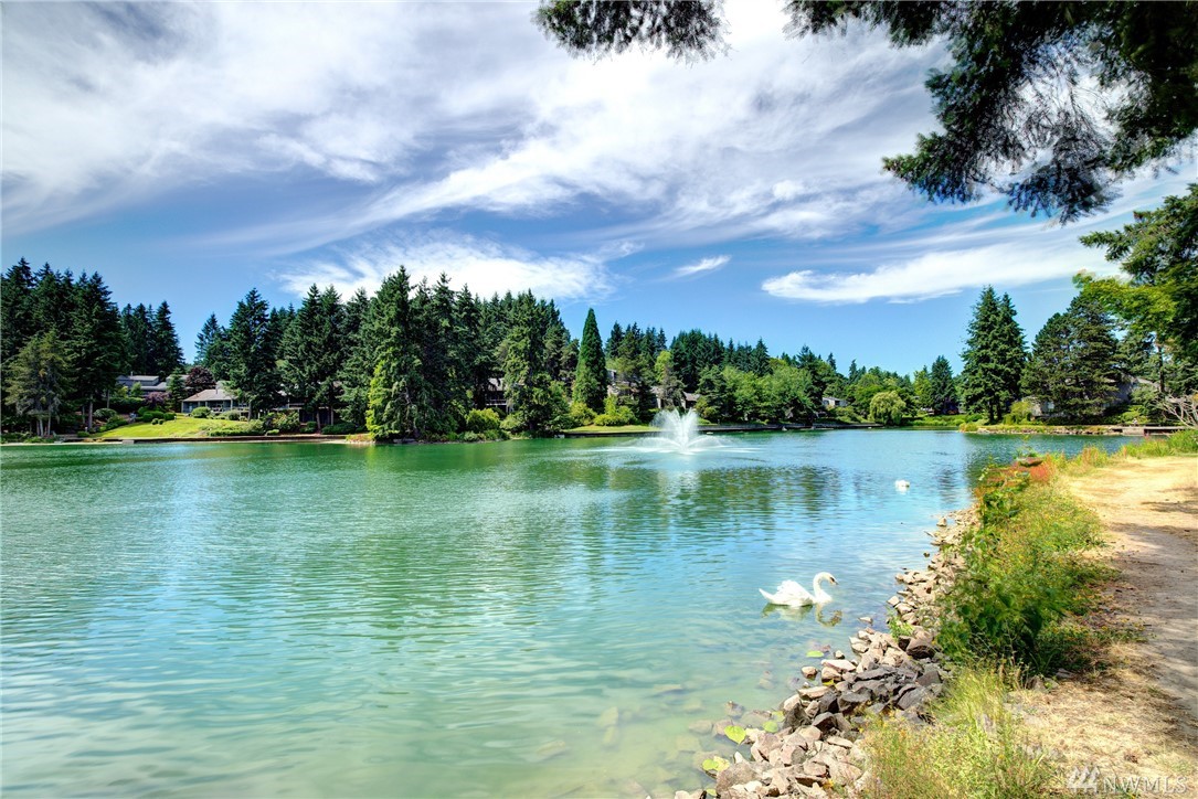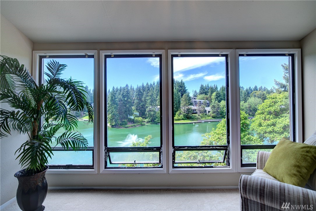 Enjoy Serene Lake Views from your living room in this large top floor condo, mins from Microsoft & Google. Kitchen w/ tile backsplash, hardwoods & eating bar. Open concept living & dining rm with vaulted ceilings, expansive windows & wood burning stove. Repainted & new carpet throughout. Vaulted ceilings continue into Master which features spacious closets w/ built-ins, loft & en-suite. Large 2nd bedroom w/ balcony & built-ins. Gated community w/ clubhouse, pools, tennis courts & fitness center.