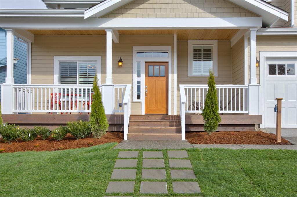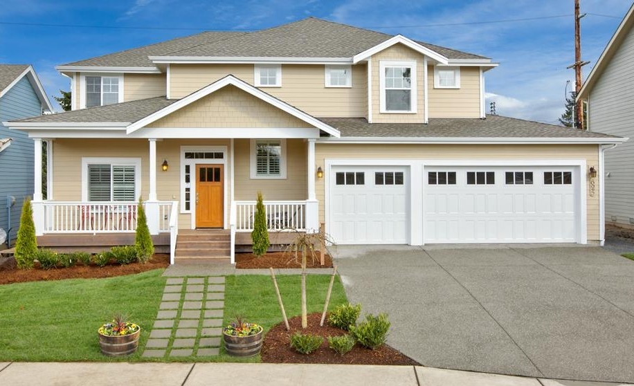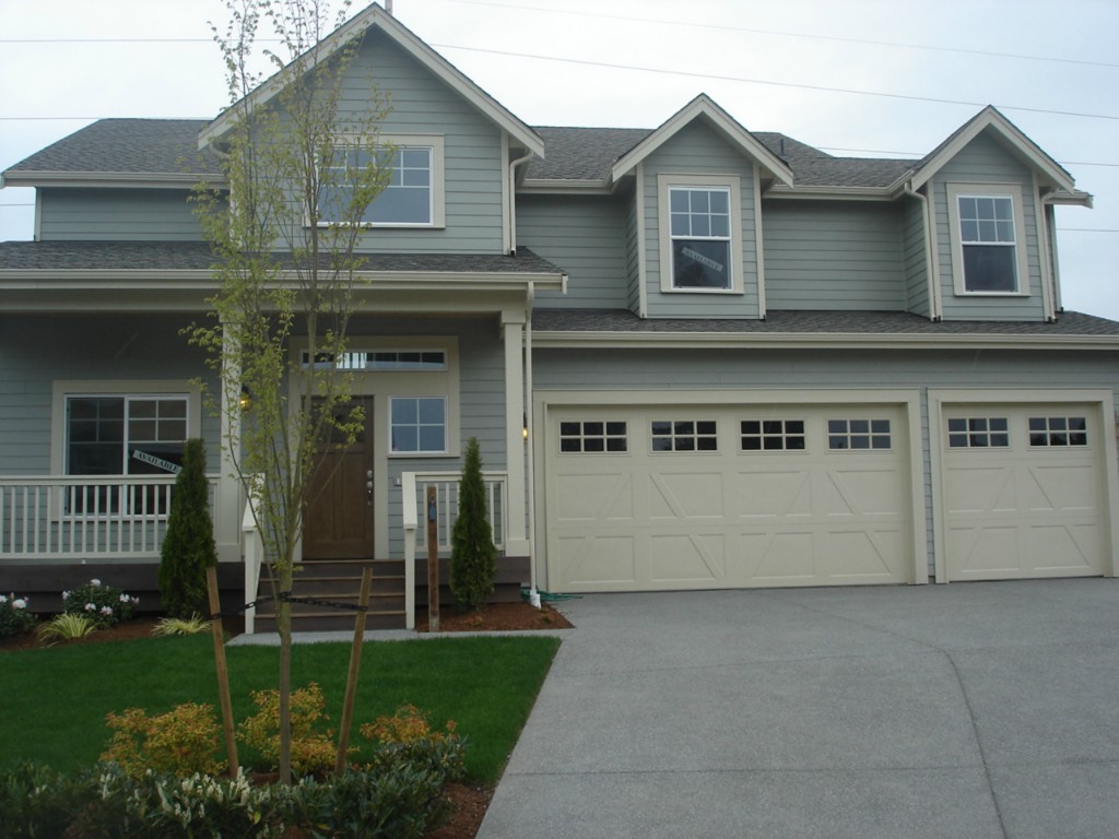carriage style doors, covered front porch w/ picket railings, enclosed roof eaves &