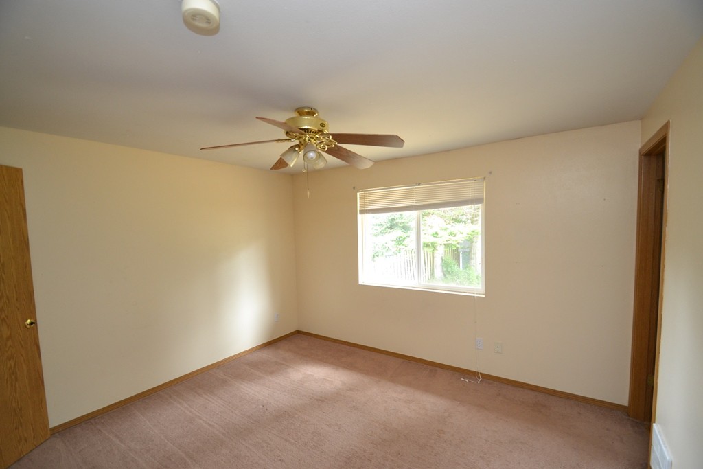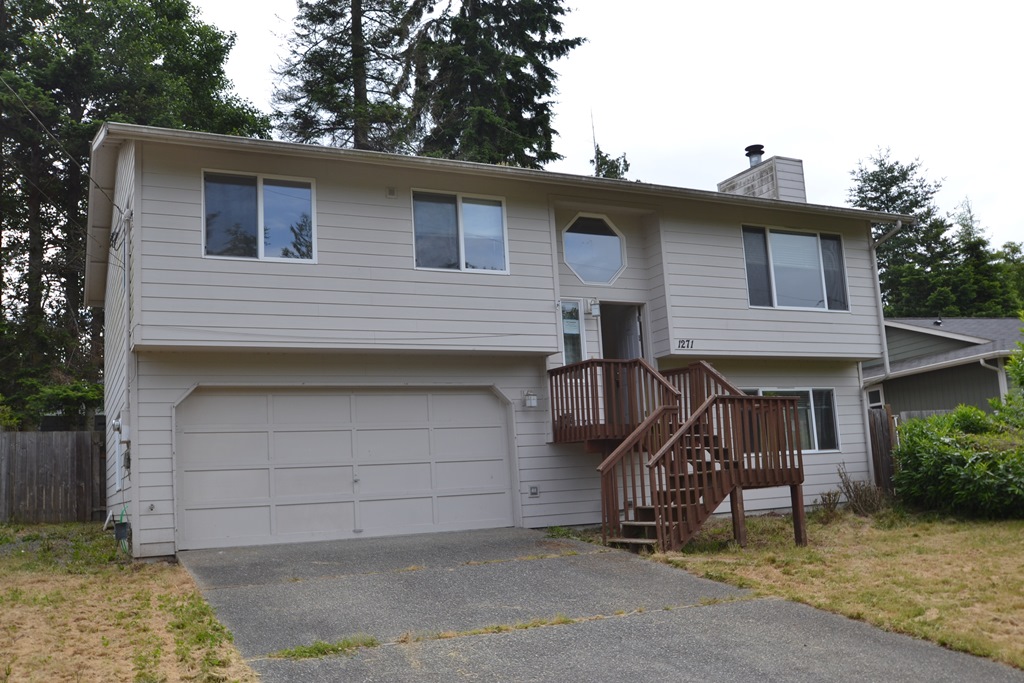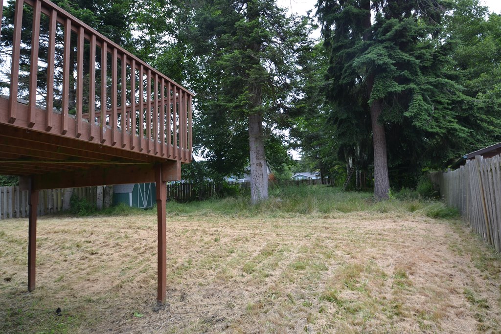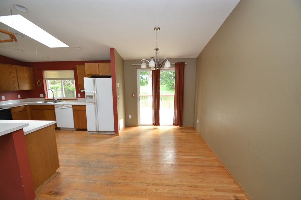 Split level home features vaulted ceiling, fireplace & picture window in the living room–loads of light. Open kitchen has suspended hooks for pots and hardwood floors. Slider off the dining area leads to deck & back yard w/room for grilling. Master bedroom has large walk in closet. Sizeable downstairs bedroom is bright and has large full bath laundry combination. Back yard features large trees, tree house, & storage shed. Bring your imagination and make this home yours. Sold As Is.