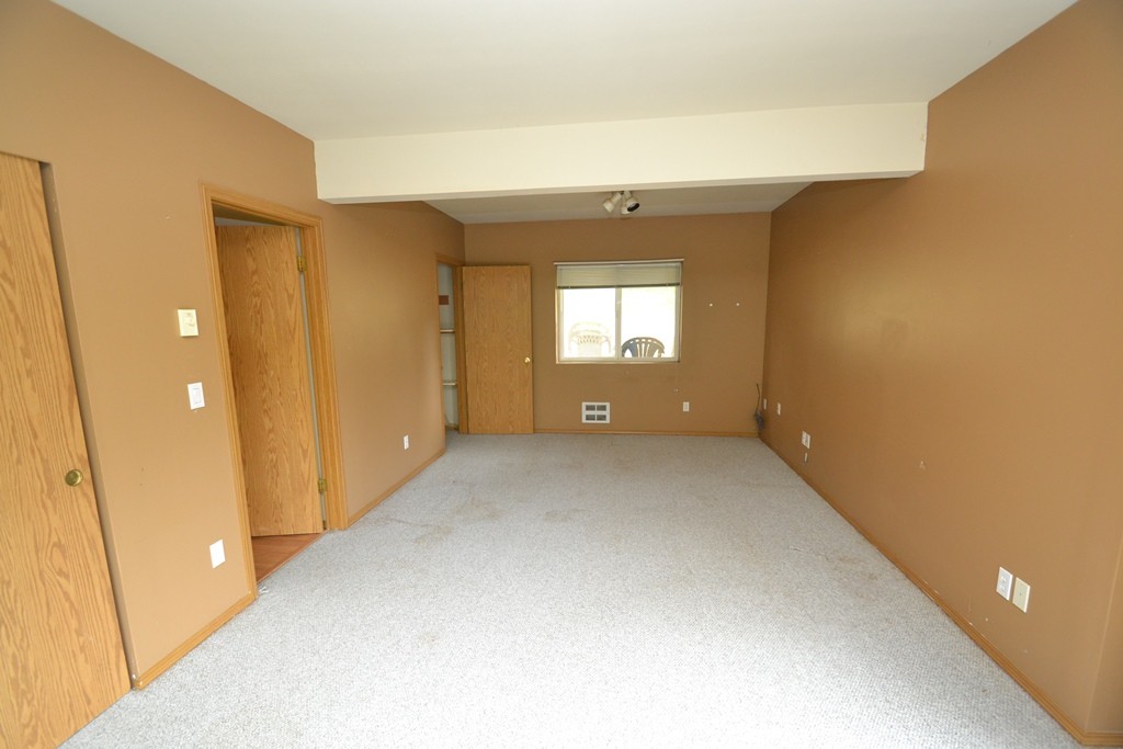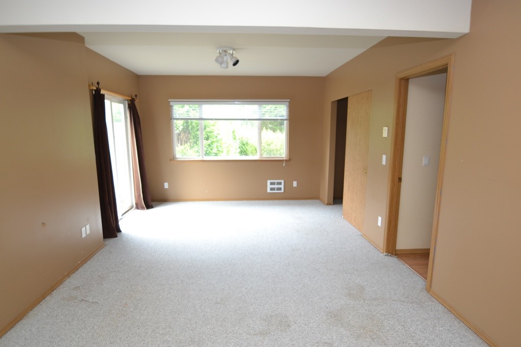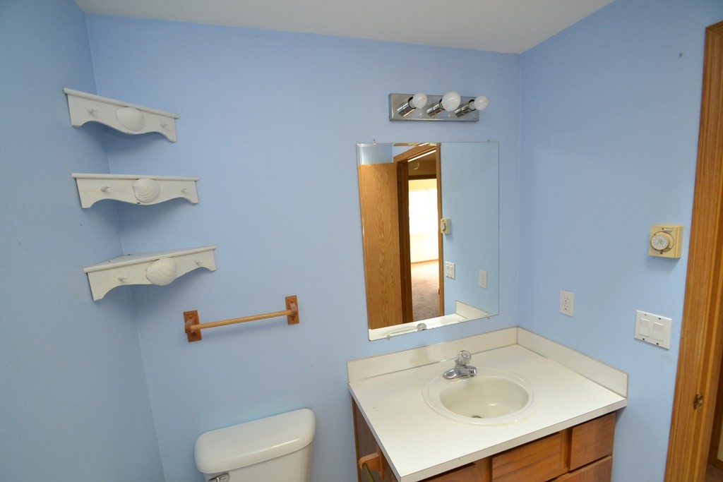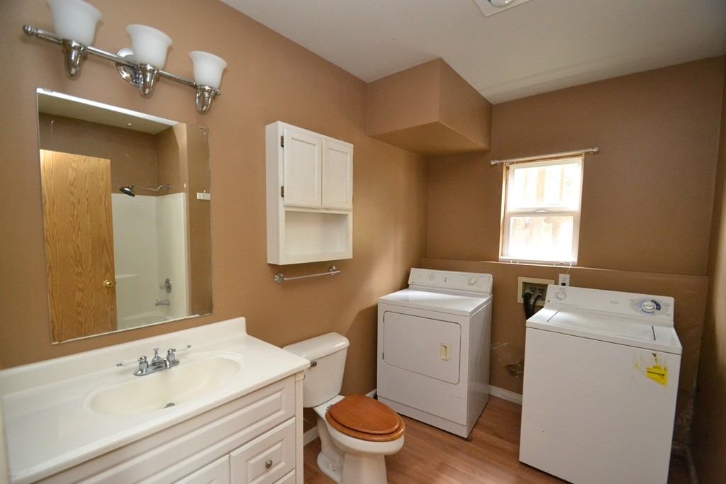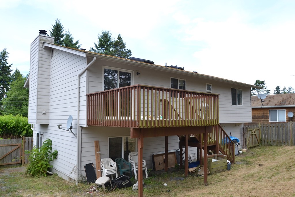 Split level home features vaulted ceiling, fireplace & picture window in the living room–loads of light. Open kitchen has suspended hooks for pots and hardwood floors. Slider off the dining area leads to deck & back yard w/room for grilling. Master bedroom has large walk in closet. Sizeable downstairs bedroom is bright and has large full bath laundry combination. Back yard features large trees, tree house, & storage shed. Bring your imagination and make this home yours. Sold As Is.