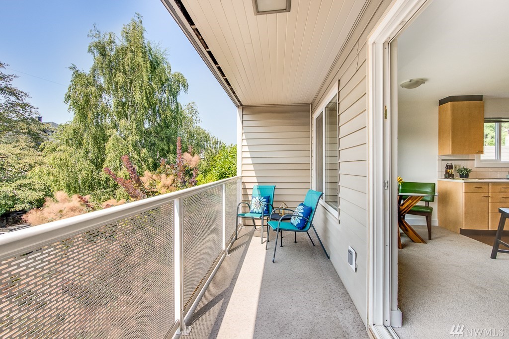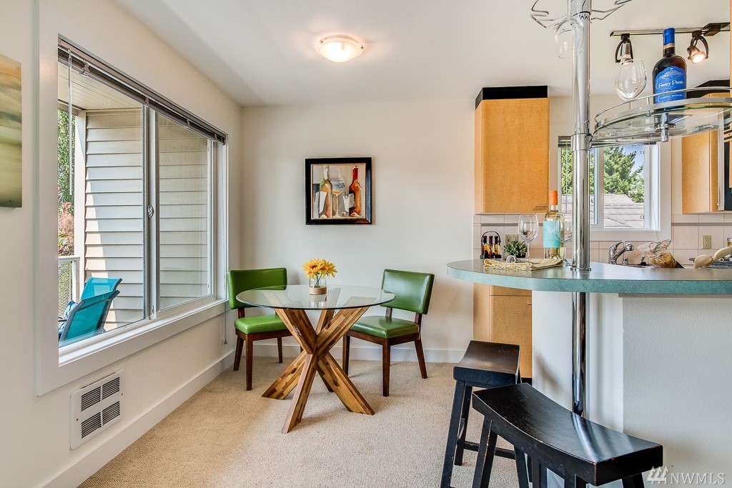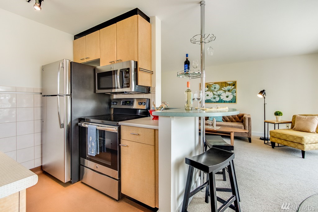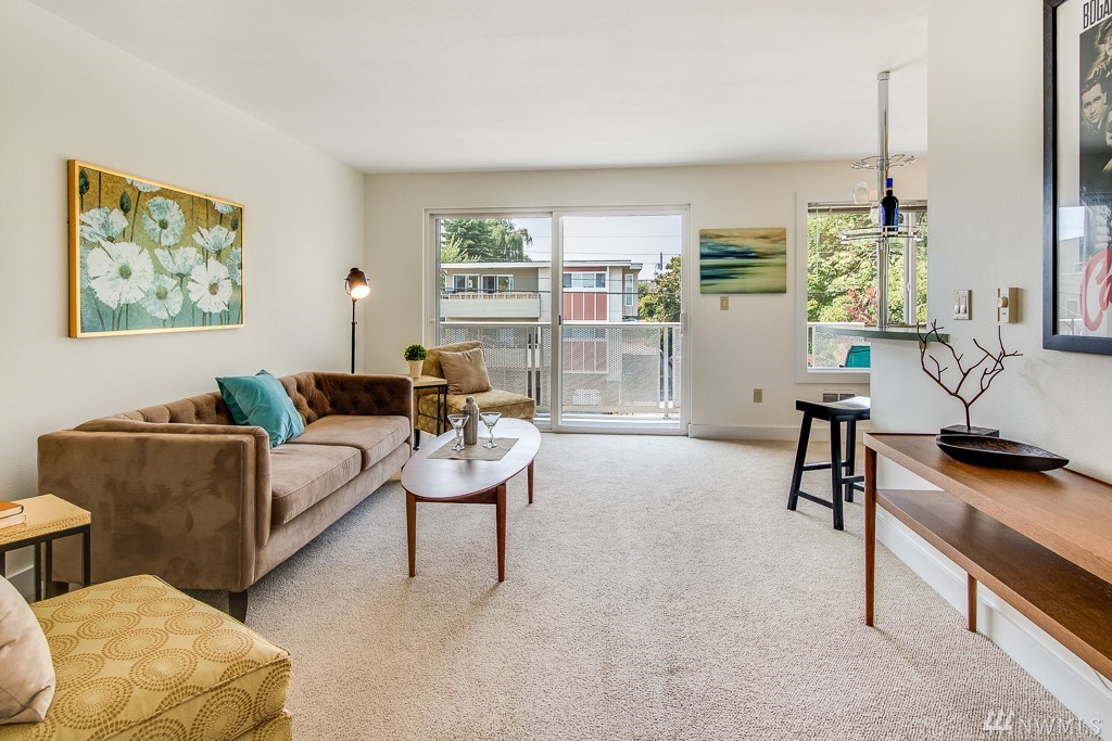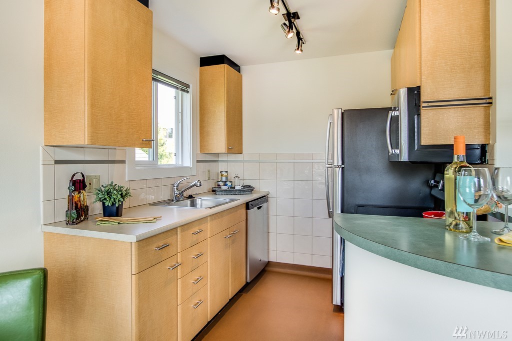 Excellent Fremont Location! Top floor corner unit, West facing, light filled 1 bedroom condo with large deck. Updated, retro-inspired kitchen with elliptical martini bar, cork flooring and new appliances opens to eating area & large living room.New interior paint! Wonderful deck spans width of condo! Updated full bath. In-unit laundry. One parking space, storage unit and common garden area.Live the Fremont lifestyle - Walk to parks, eateries & shops!Easy access to transit, I-5, 99 and downtown.