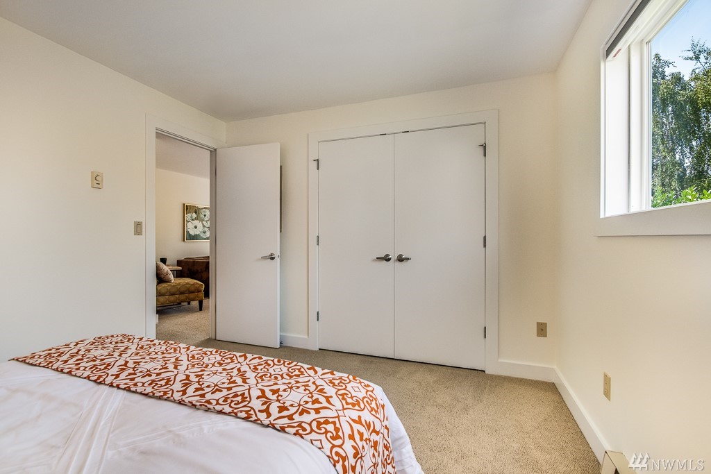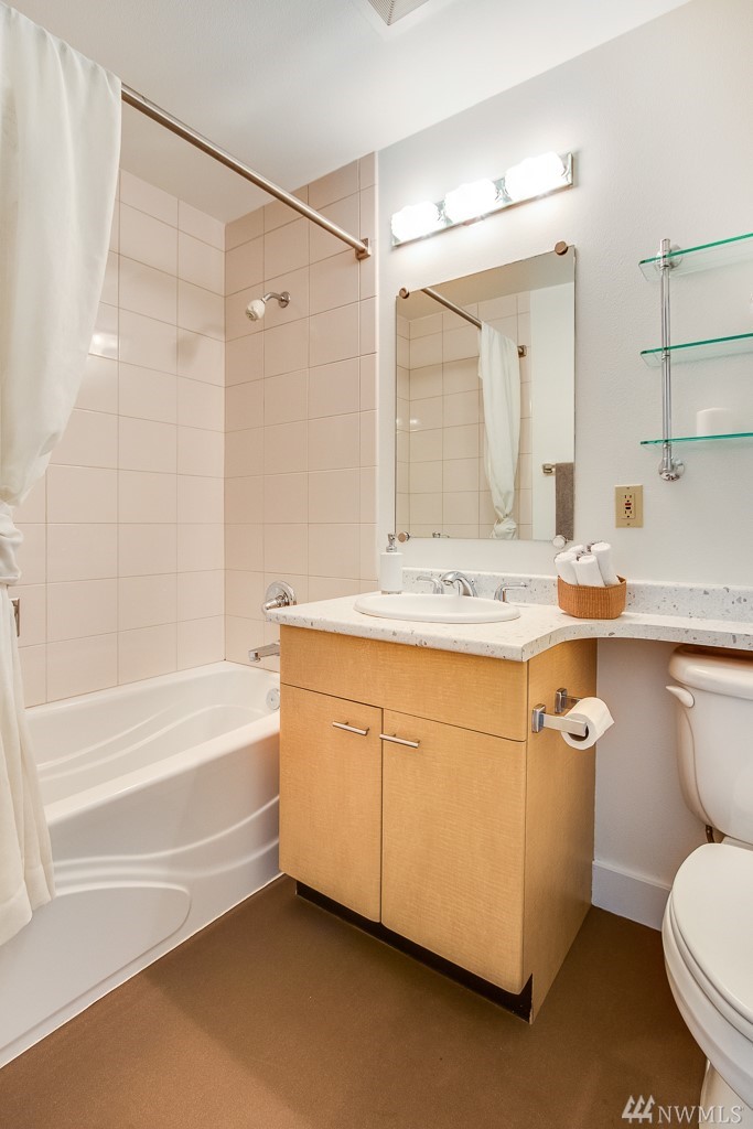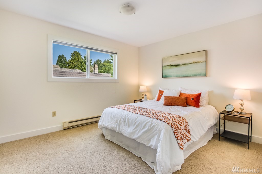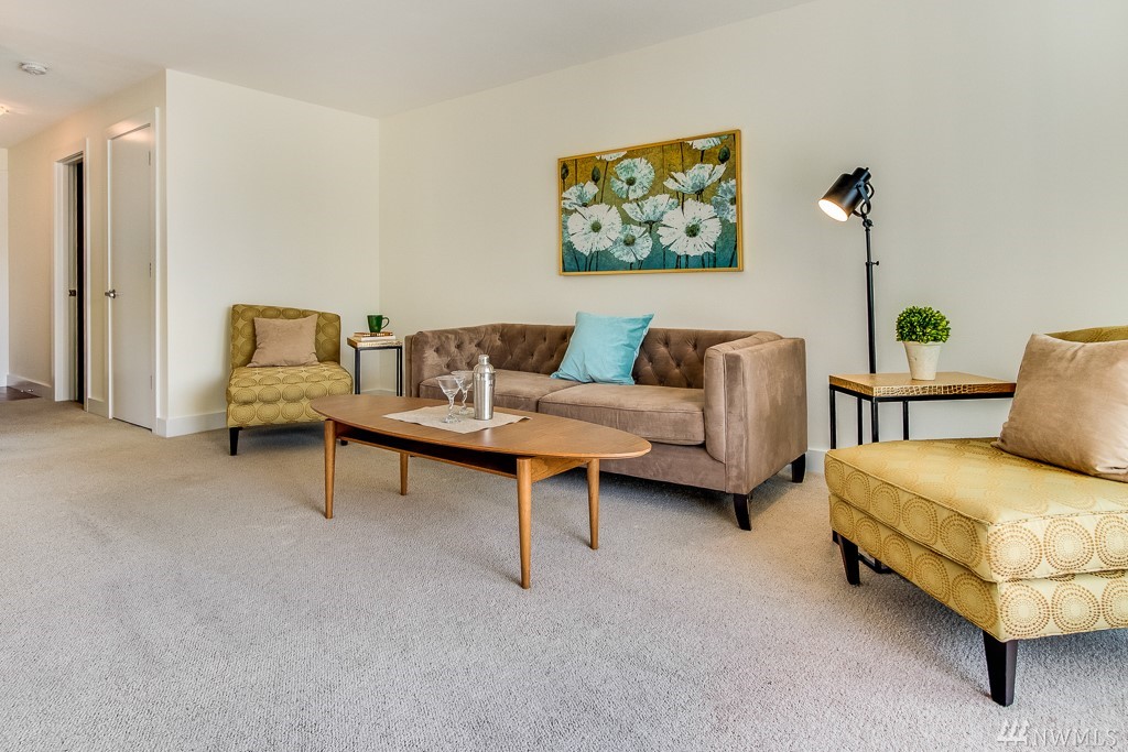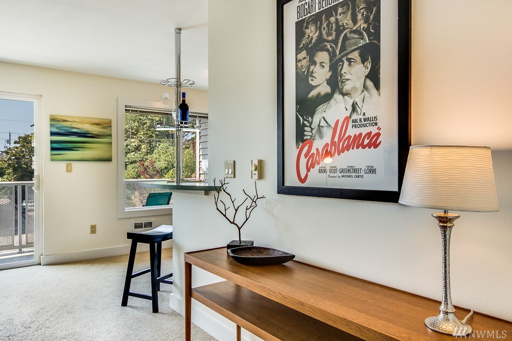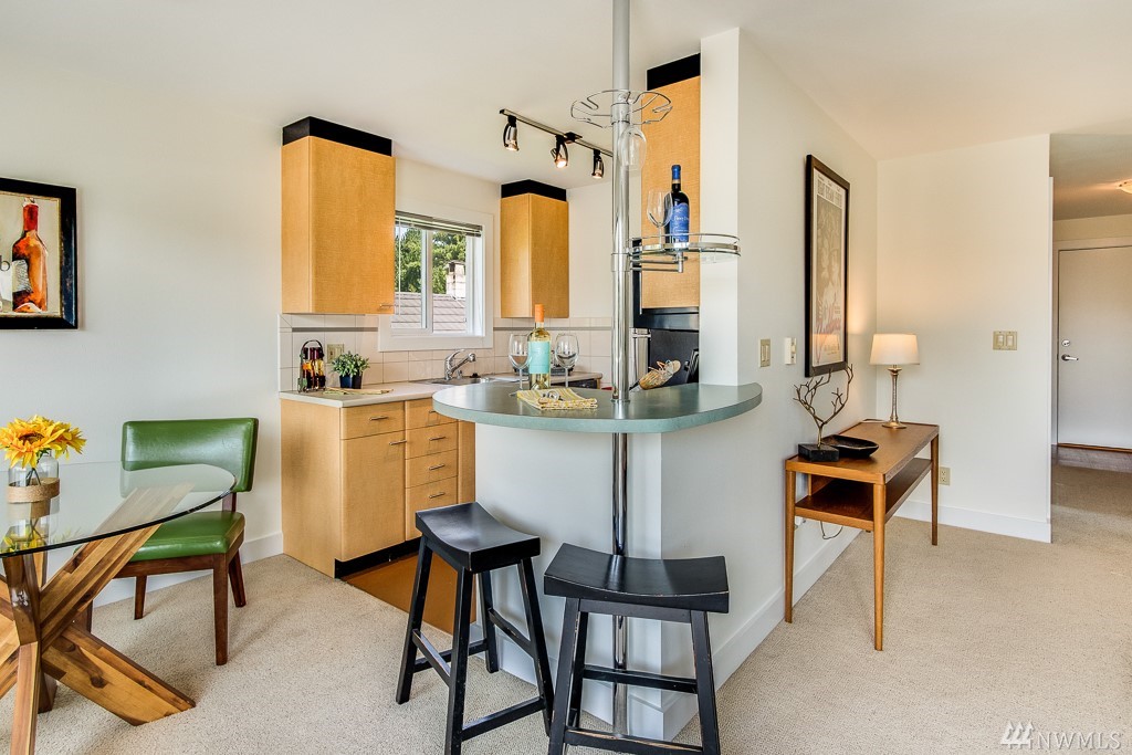 Excellent Fremont Location! Top floor corner unit, West facing, light filled 1 bedroom condo with large deck. Updated, retro-inspired kitchen with elliptical martini bar, cork flooring and new appliances opens to eating area & large living room.New interior paint! Wonderful deck spans width of condo! Updated full bath. In-unit laundry. One parking space, storage unit and common garden area.Live the Fremont lifestyle - Walk to parks, eateries & shops!Easy access to transit, I-5, 99 and downtown.