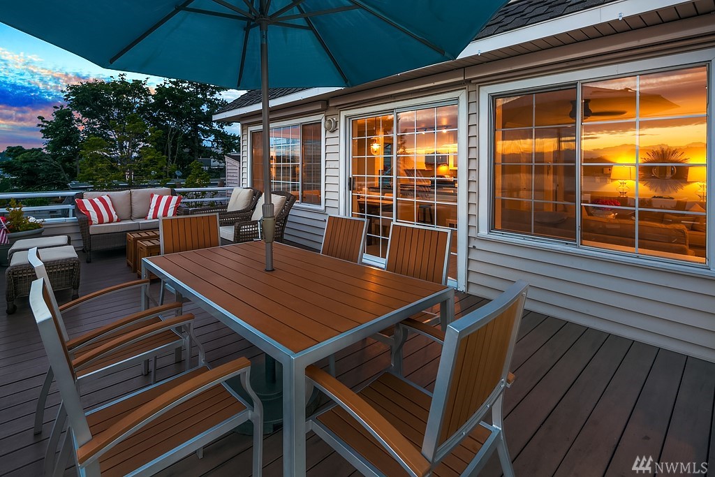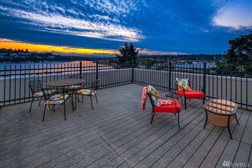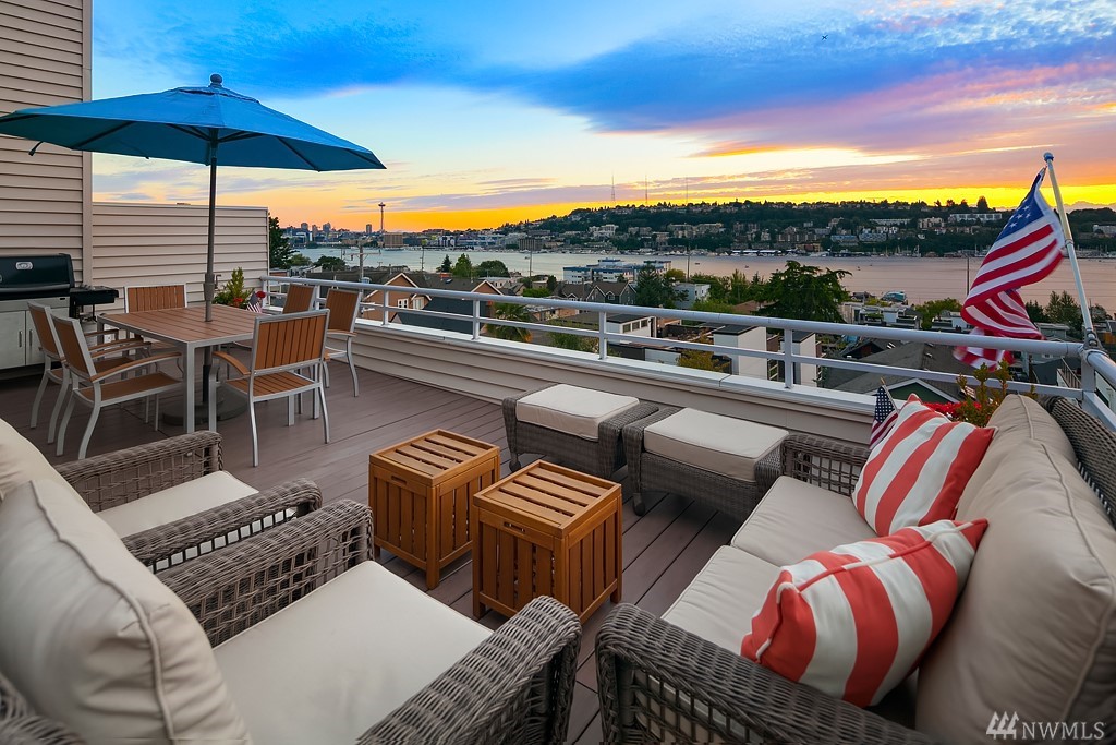 Protected, Unobstructed Western-Facing Views.Top-Floor Unit completely renovated in 2015 with Designer style and materials. Custom SunShades, Built-ins and lighting make this 2 bedroom one bath luxury condo one of a kind. Enjoy your private 300 sqft deck with Views of the Seattle Skyline, Lake Union, Gasworks Park, QA, the Olympic Mtns and more. Seamless indoor/outdoor lives large, steps from Eastlake restaurants/bars/bus. Minutes from SLU/Amazon/FB. 1 parking spot, 60 sqft private storage unit.