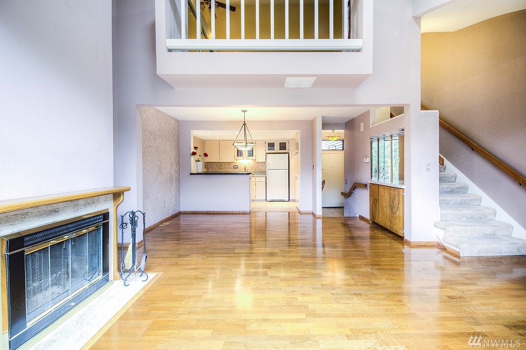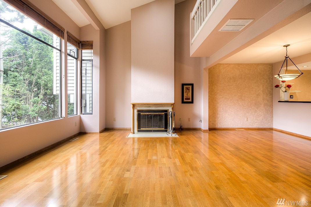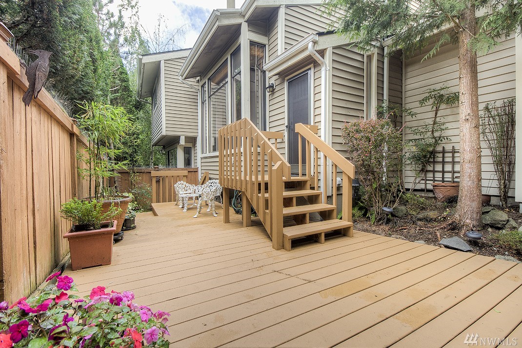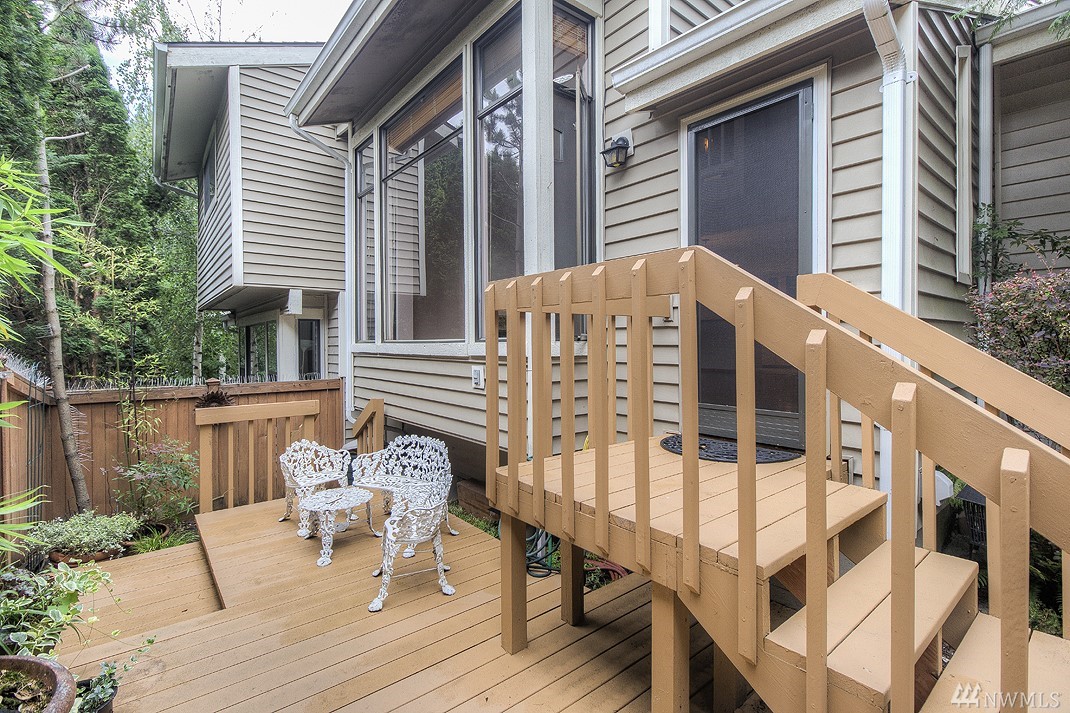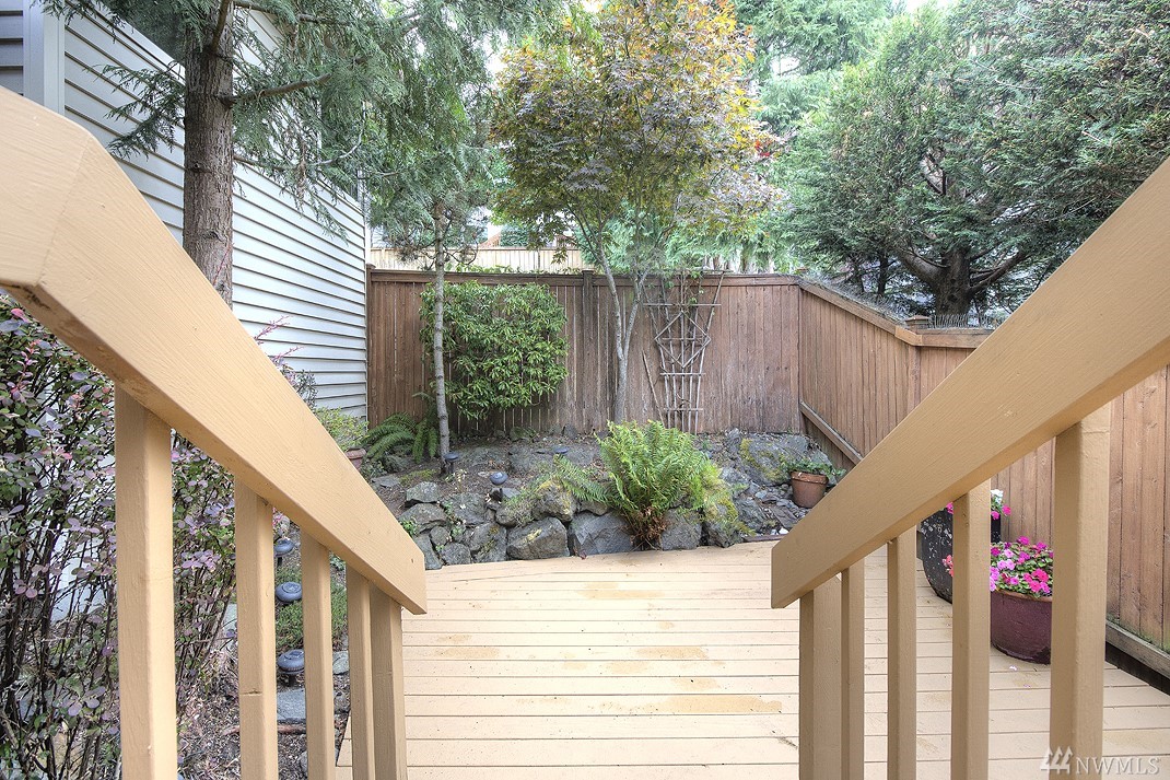 This 15 unit townhouse with 1,374 sq. ft. is located down a lane & is in the back of the complex. Very Quiet.Two car garage with storage Backyard has large deck, small planting area, is private & totally fenced. The living room has large windows, high vaulted ceilings, fireplace & hardwood floors. There are 2 bedrooms & 2 bathrooms upstairs & a small office. Kitchen is adjacent to Living & dining rm. Main level has 1/2 bath. Located close to I 90, schools & downtown Bellevue. Low HOA Dues