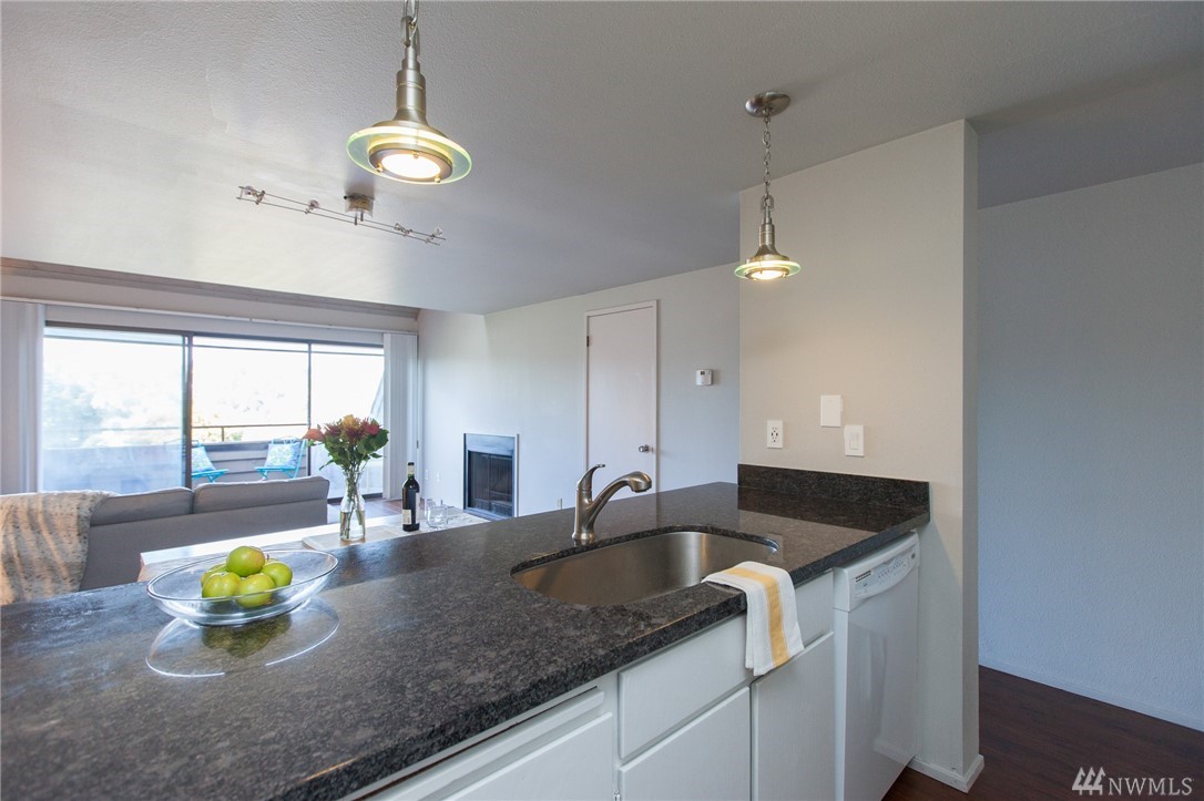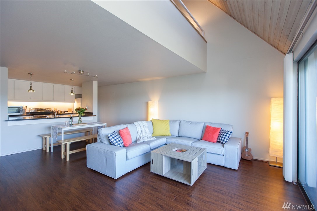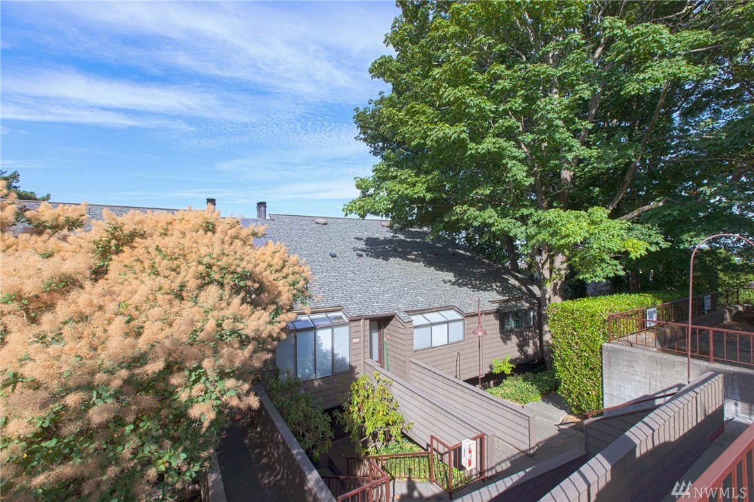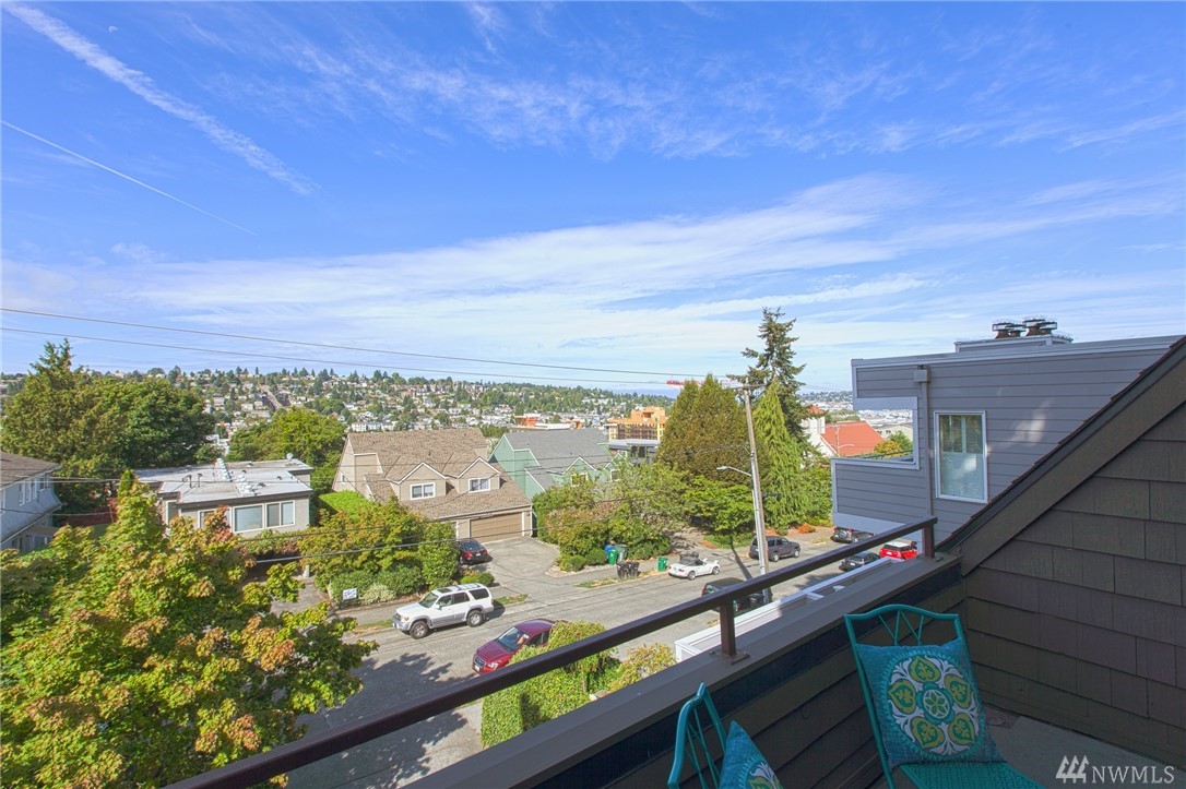 Enjoy beautiful panoramic westerly views from this top floor Queen Anne Condo! Updated 2 bedroom/ 1.75 bath with a spacious floor plan and 'loft style' master suite. Main level is welcoming with vaulted entry, open layout & a private large deck for entertaining. Along with a one car garage & storage unit, this condo has an impressive amount of storage space! Amazing location! Walking distance to Rapid Ride & easy access to Ballard, Fremont, Downtown & City Center. No rental cap. Low HOA.