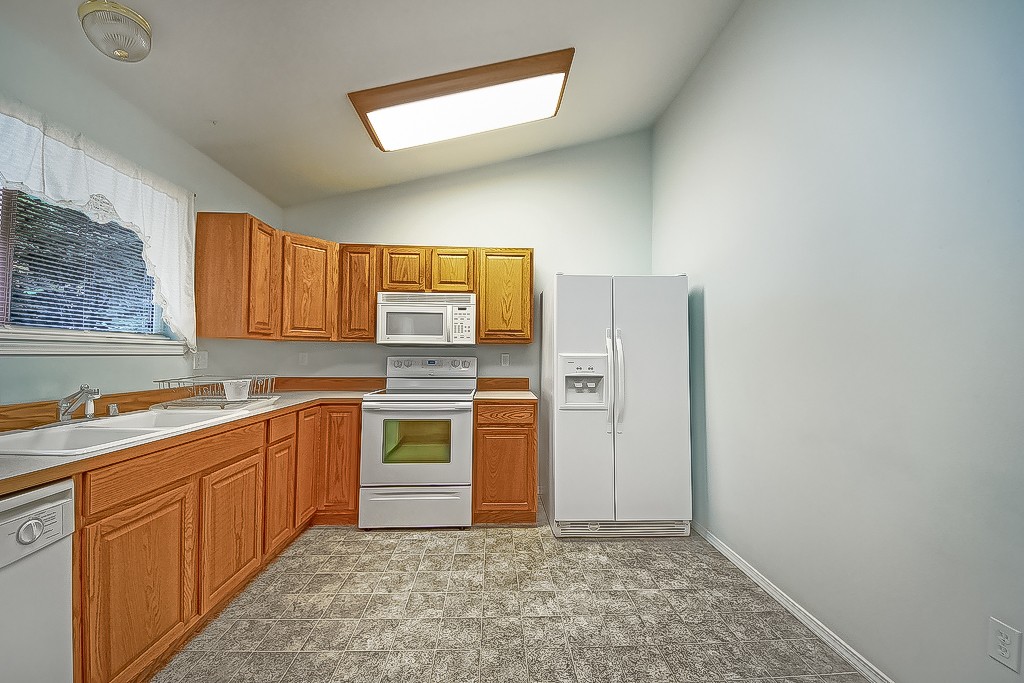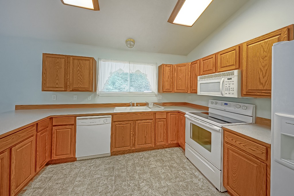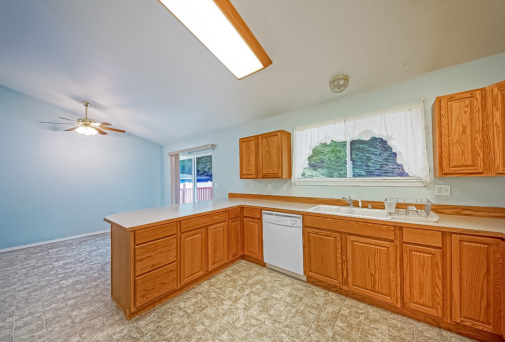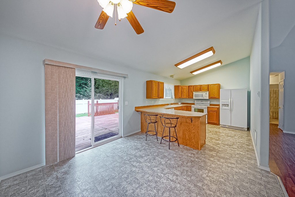 You will love this 2005 rambler with unobstructed views of Trails End Lake and the park across the street. Move in ready with 3 bedrooms and 2 fulls baths including the master with double vanity sinks. Spacious kitchen with all appliances and eating bar. Big living room with easy care laminate flooring. Access to full length back deck and fully fenced. Laundry includes washer/dryer. Big attached 2 car garage. Access to two community parks and lake stocked with trout. 3 minutes to Mason Lake