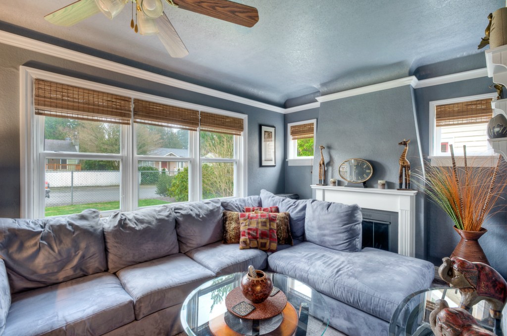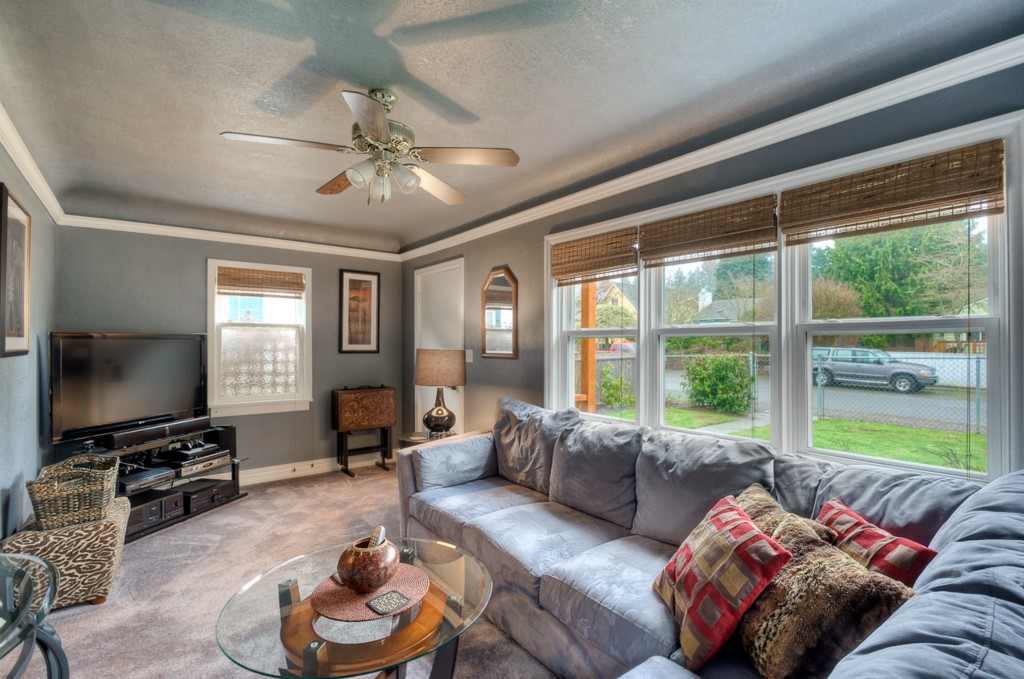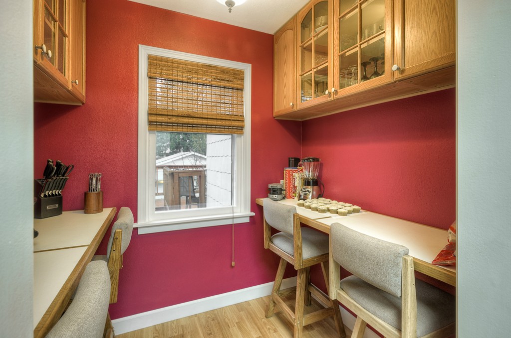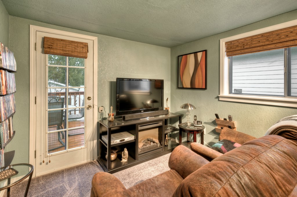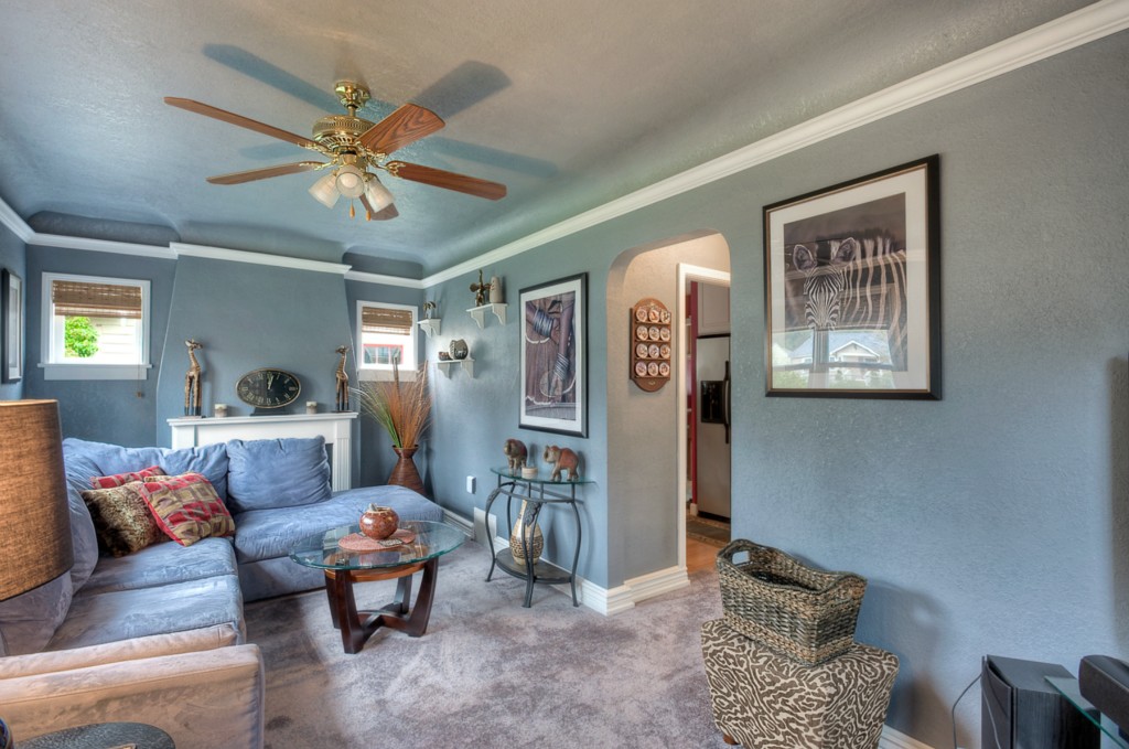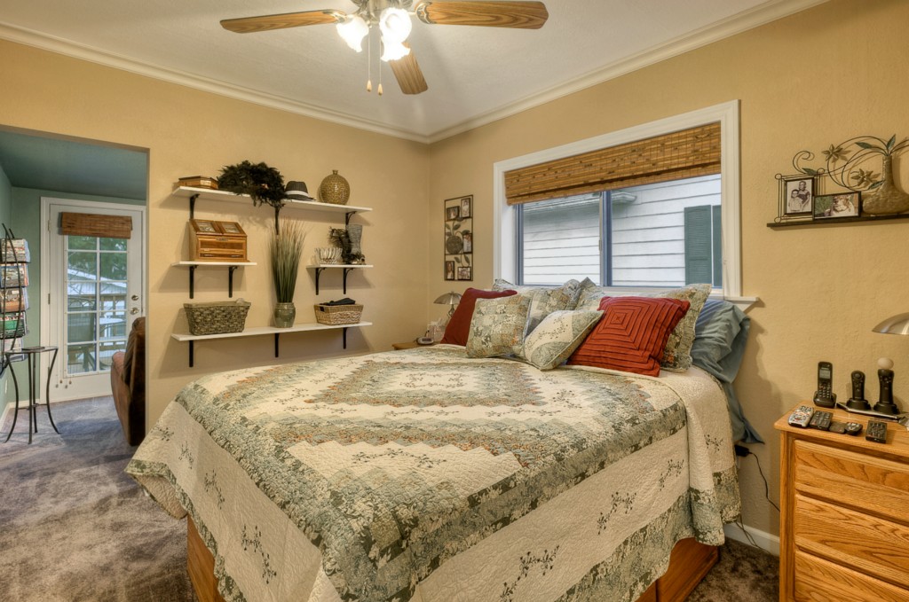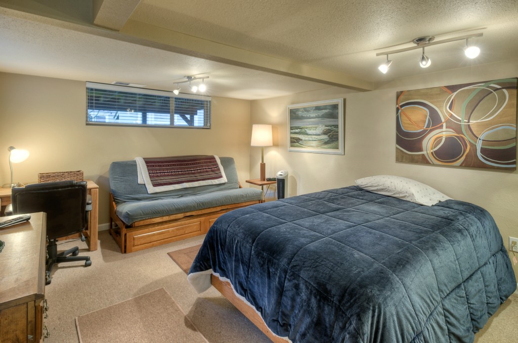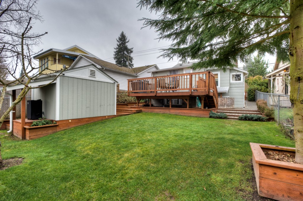 Beautiful home well maintained and updated. Coved ceilings, crown molding and wide baseboard trim. Rich colors, built in shelving, and custom window blinds add to the charm of the home. Kitchen with newer cabinets and eating nook. Main floor has a master bedroom and a den/office that leads to the private deck. Lower level is accessed from an outside entrance and has a large bedroom, half bath, laundry room and workshop. Large newer detached garage with alley access.