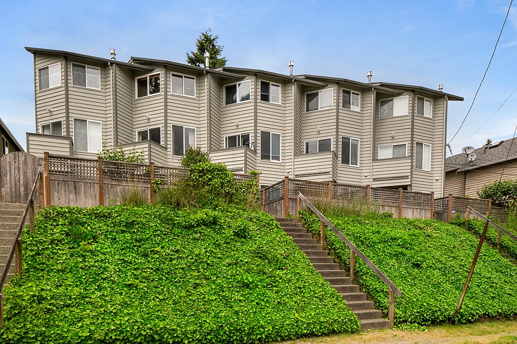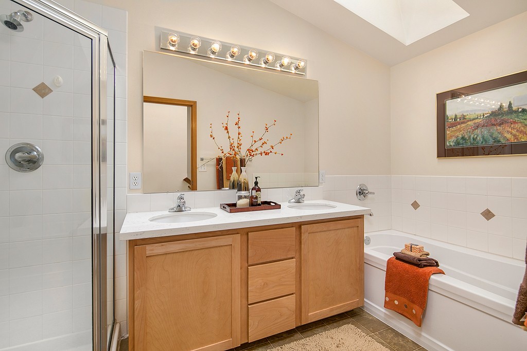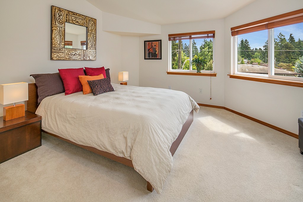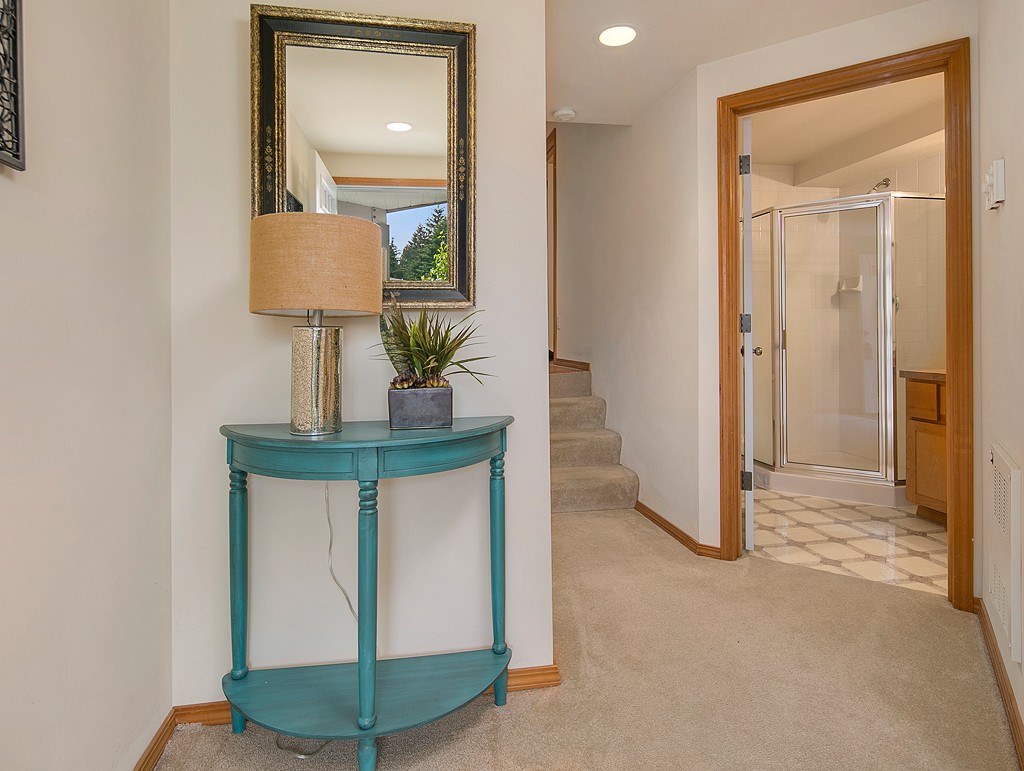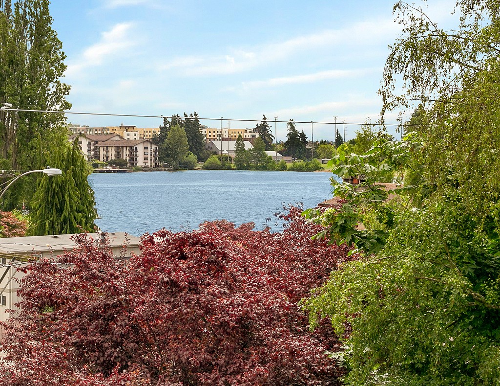 Exceptionally large, airy home, w/a flexible multi-level floor plan & lake view. Remodeled kitchen w/new quartz counters, SS appliances & gas range. Living room boasts a gas FP. Two decks. Two large bedrooms upstairs include the master w/a 5-piece bath and a new quartz counter. Skylights & cathedral ceilings. First floor bedroom has it's own 3/4 bath for guests/roommate. Great storage/closet space. Efficient radiant heat. Oversize garage and x-tra parking. Quiet, elevated complex. No HOA dues!