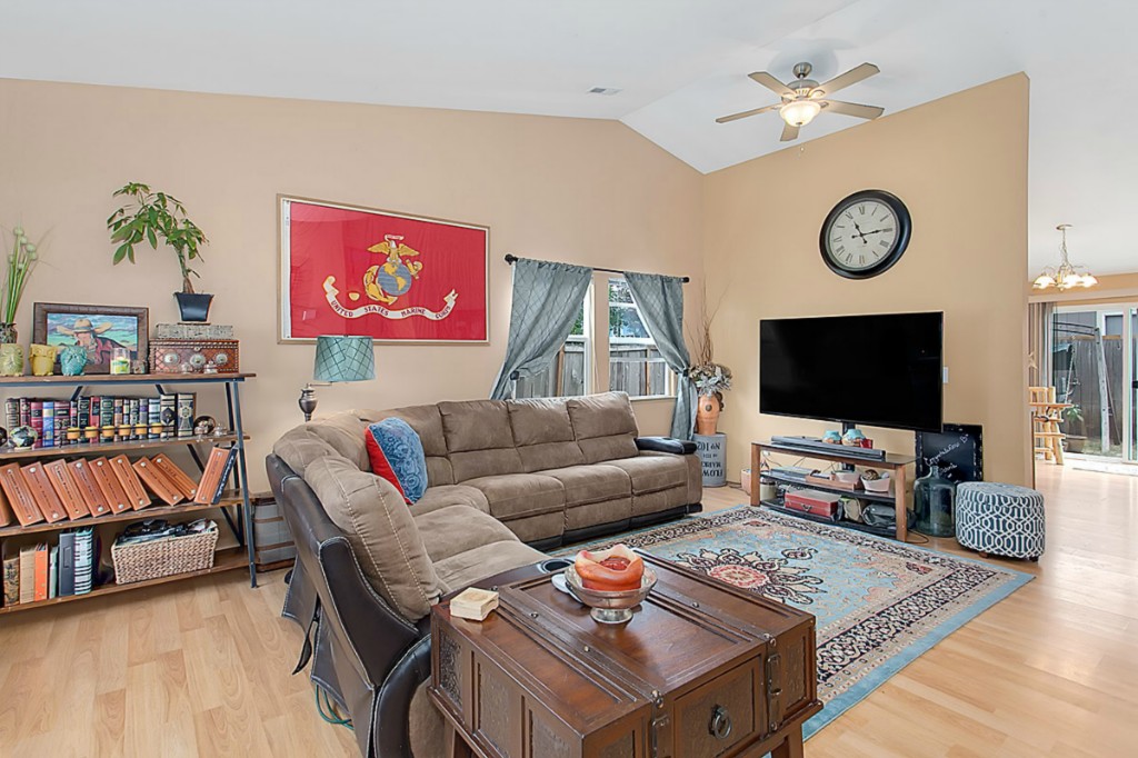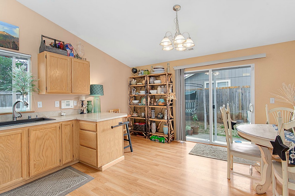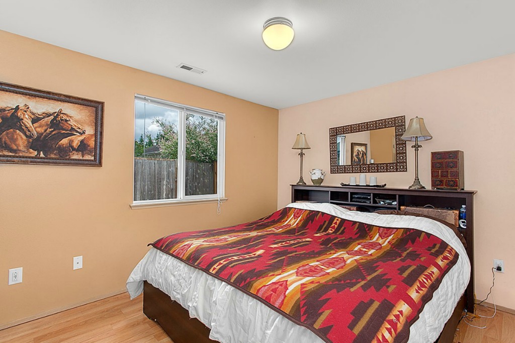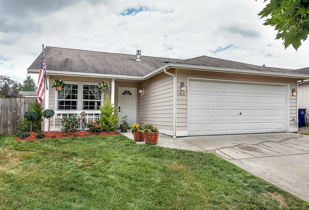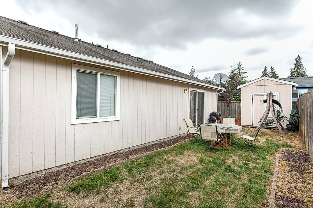 Heartland Estates! Bright and open floor plan with vaulted ceilings. This 3 bedroom,2 full bath home, has a gas fireplace and offers a covered front porch and fully fenced back yard with garden shed. Walk in closet off Master with custom built ins. 2 Car garage. Shopping within minutes and close access to I-5. Short walk to community playground!