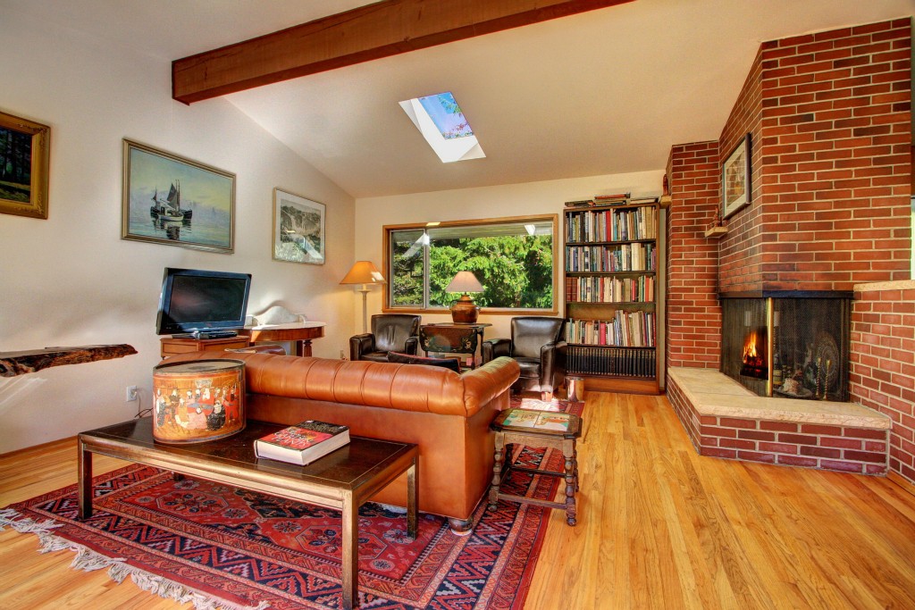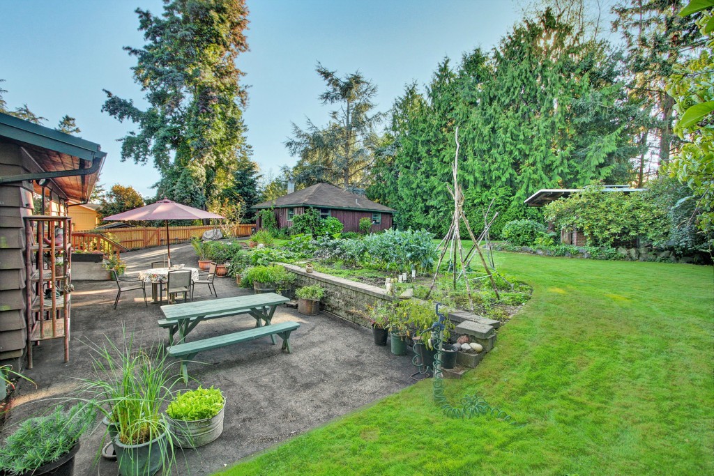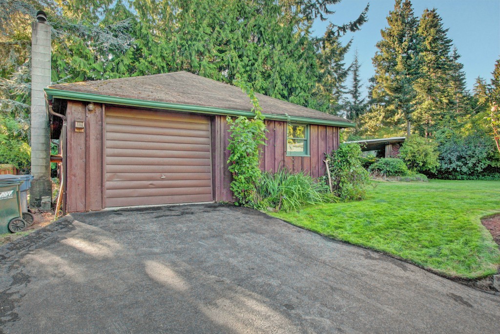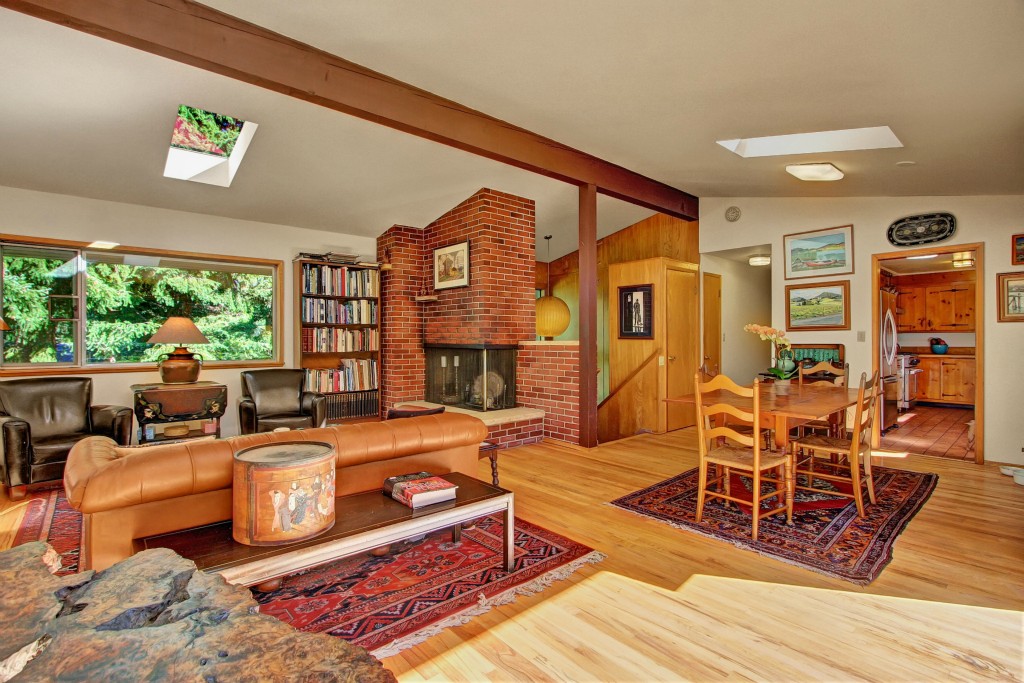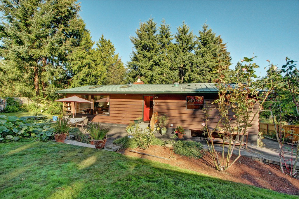 This solid 1950's house was updated in 2009 w/metal roof, skylights, landscaping & sprinkler system. Living room has floor to ceiling windows to bring the outdoors in. The large lot offers privacy & outdoor fire shed to enjoy those Seattle evenings. The light bright lower level has recently been updated w/new drywall, paint & carpet. Move in ready! The orig 1 bd/1 ba house has new roof as of Nov2014. It has been converted to garage/storage, but with work could qualify as guest house, not rental.
