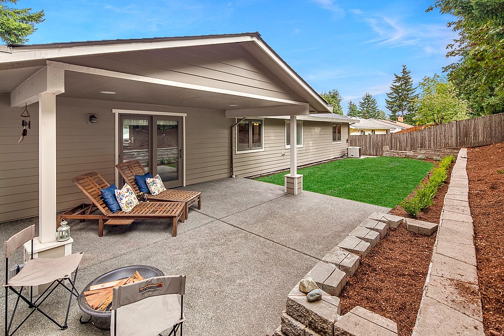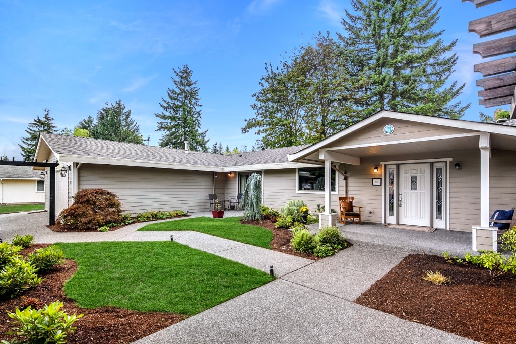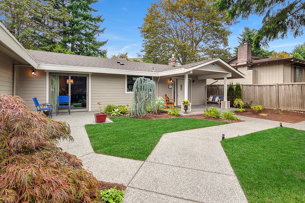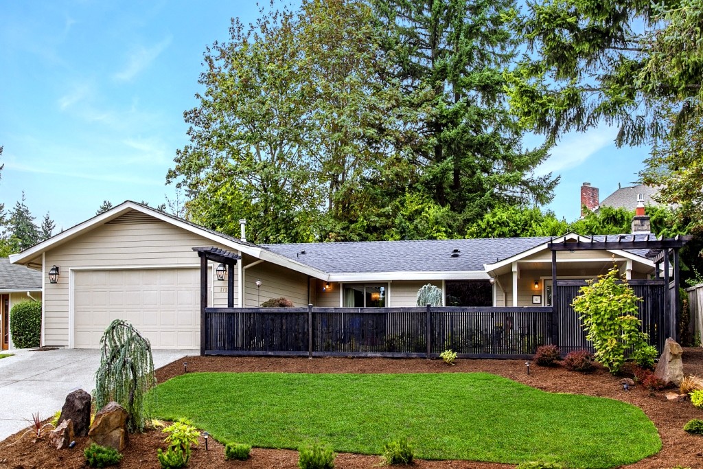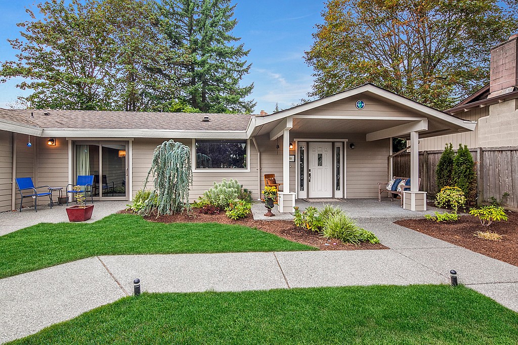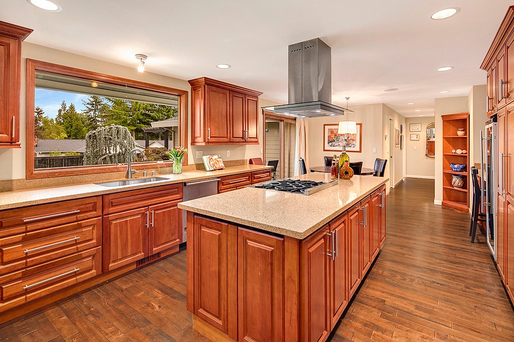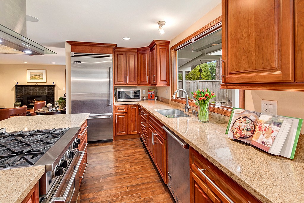 Beautifully remodeled in 2013, this Bellevue rambler is close to Microsoft & downtown.Desirable open plan great for entertaining,features gourmet kitchen w/stainless appliances,slab granite,custom cherry cabinets.Great Room has oversized gas fireplace & access to covered outdoor patio.Large master suite with walk-in closet,luxurious bath, his/hers vanities. Espresso-stained hardwood throughout;integrated audio, security;Pella triple paned wood windows w/screens & blinds; new walkways and patios.