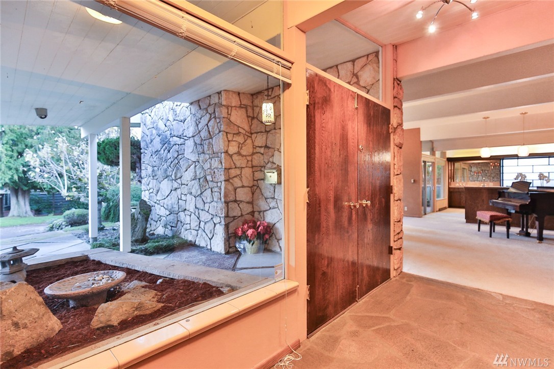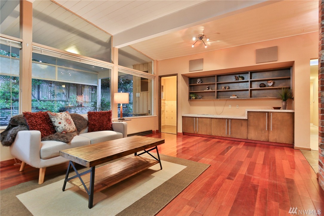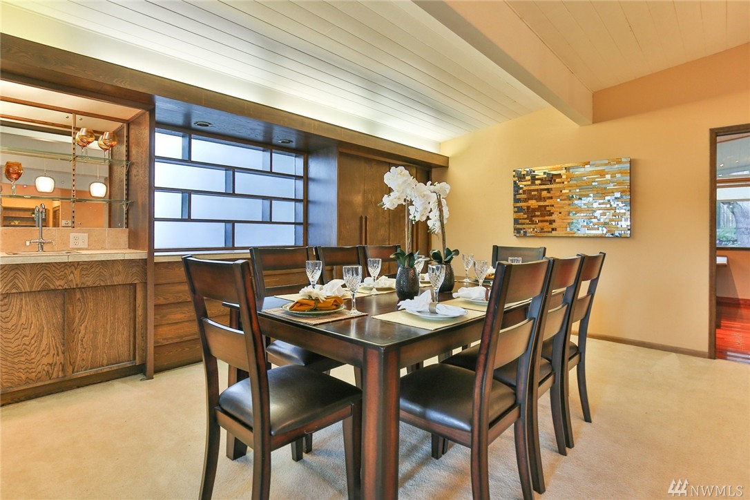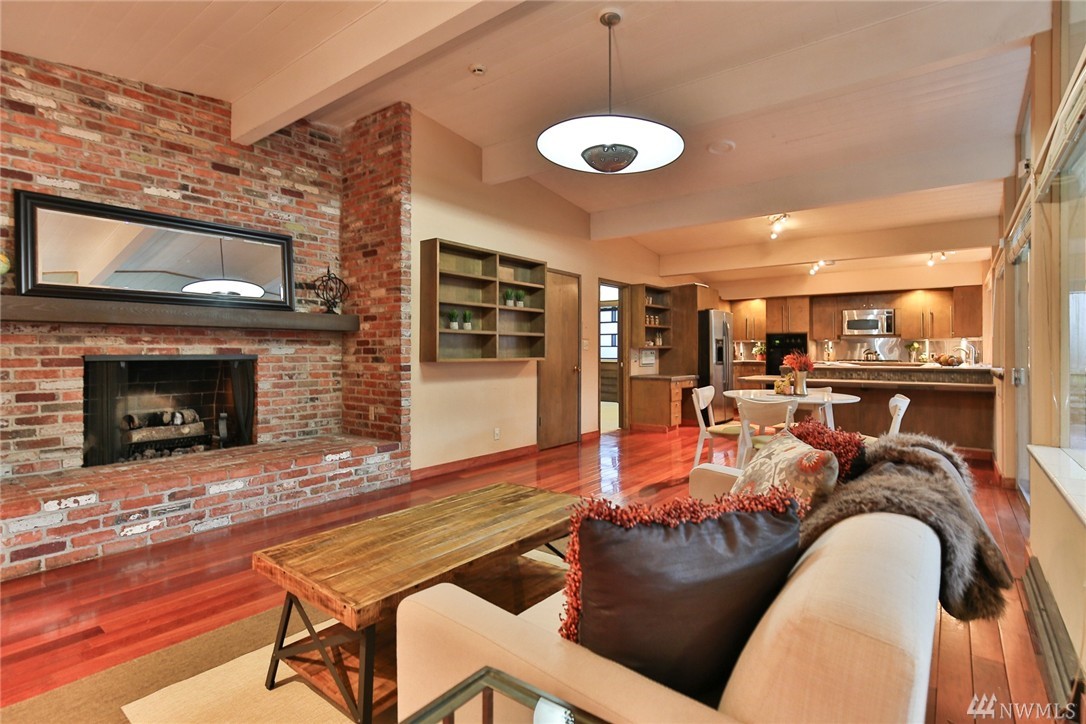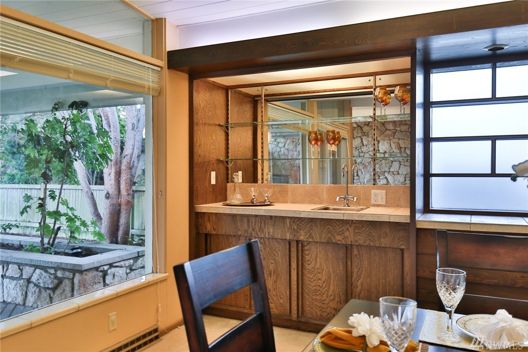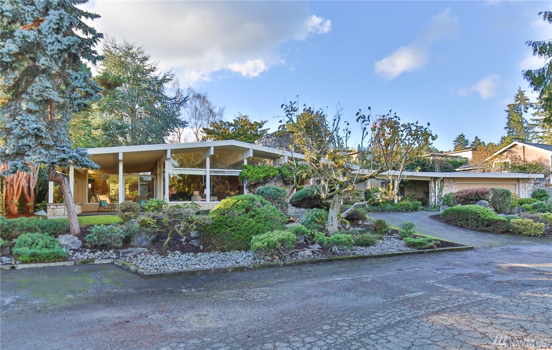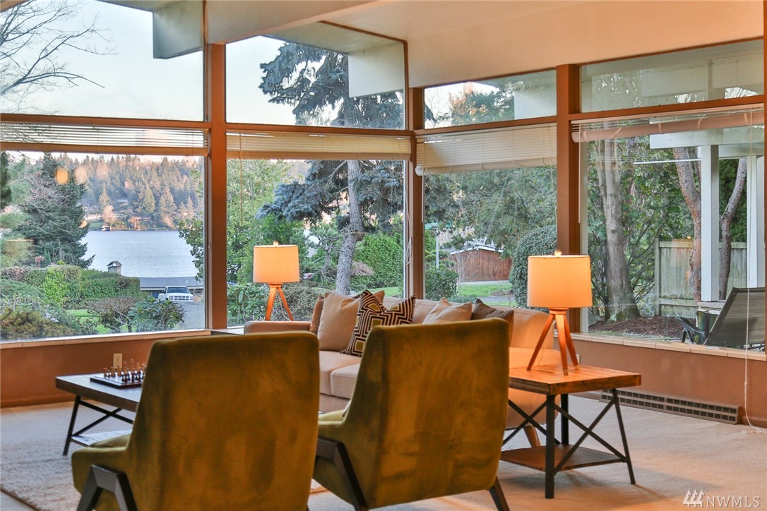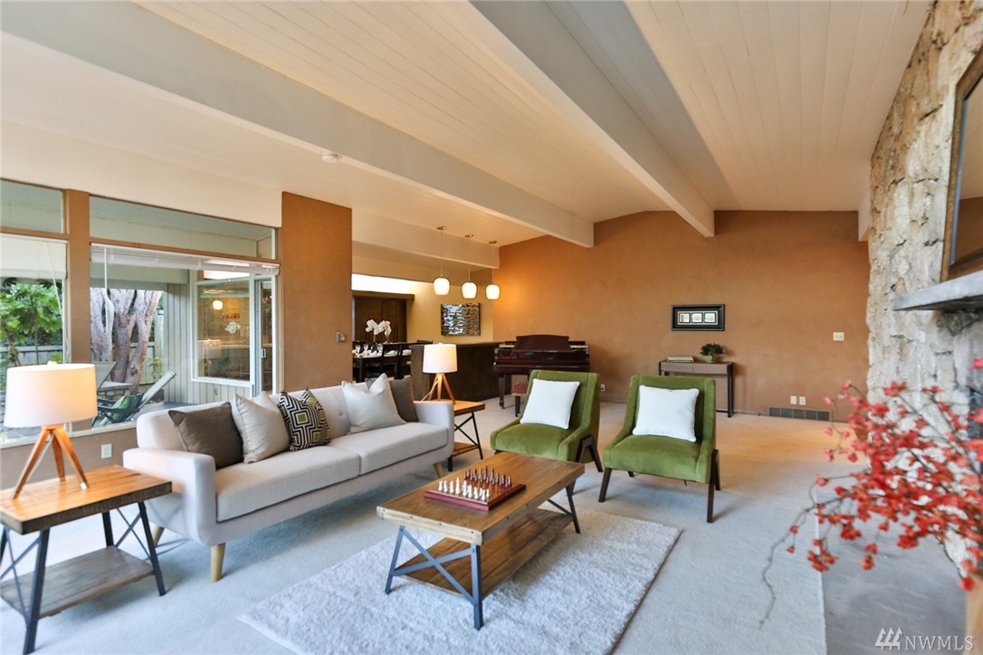One of a kind custom built (for U.S. District Court Judge) mid century modern, one level, on quiet, dead end street. Exterior Montana Rock walls. Xtra lg. liv and din rms with vaulted, wood, beamed ceilings, rock firepl, wet bar, built-in's, view of lake. Walls of windows, open floor plan. Lg kit, ideal for gatherings. Huge fam rm off kit with gas firepl. Perfect home for entertaining inside or out (covered patios front/back). Mstr bedrm w/ walk in closet and built-in vanity.