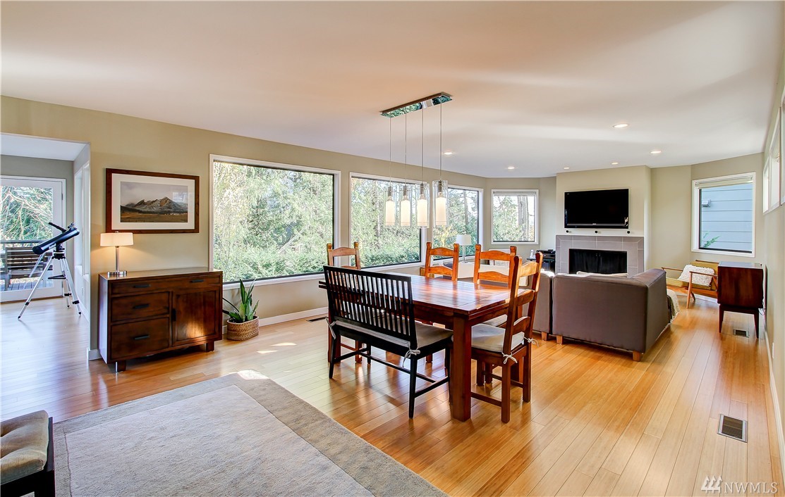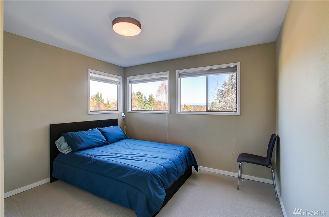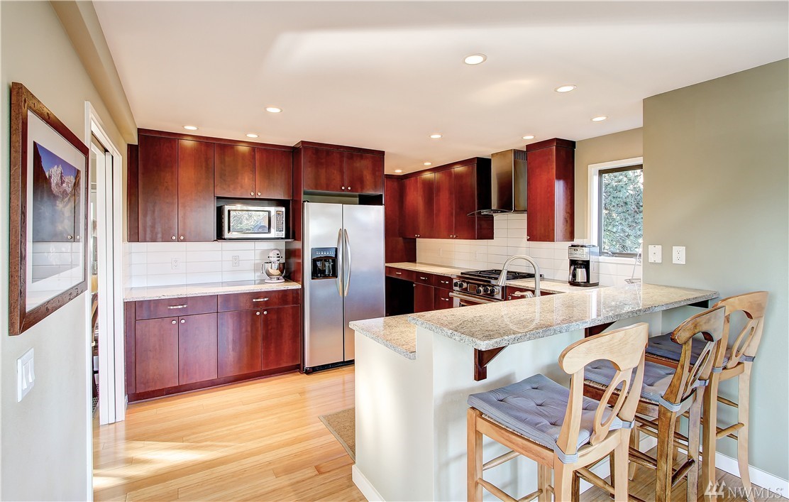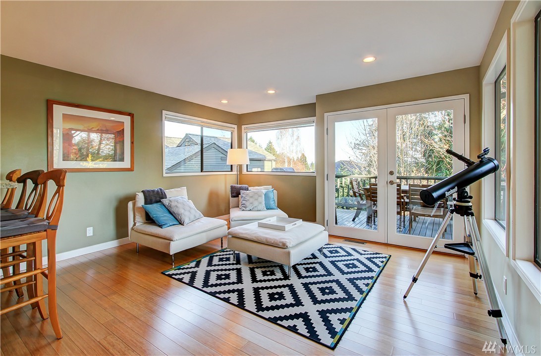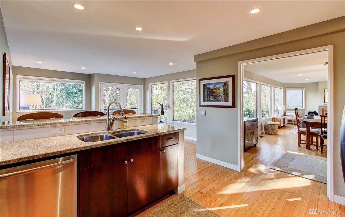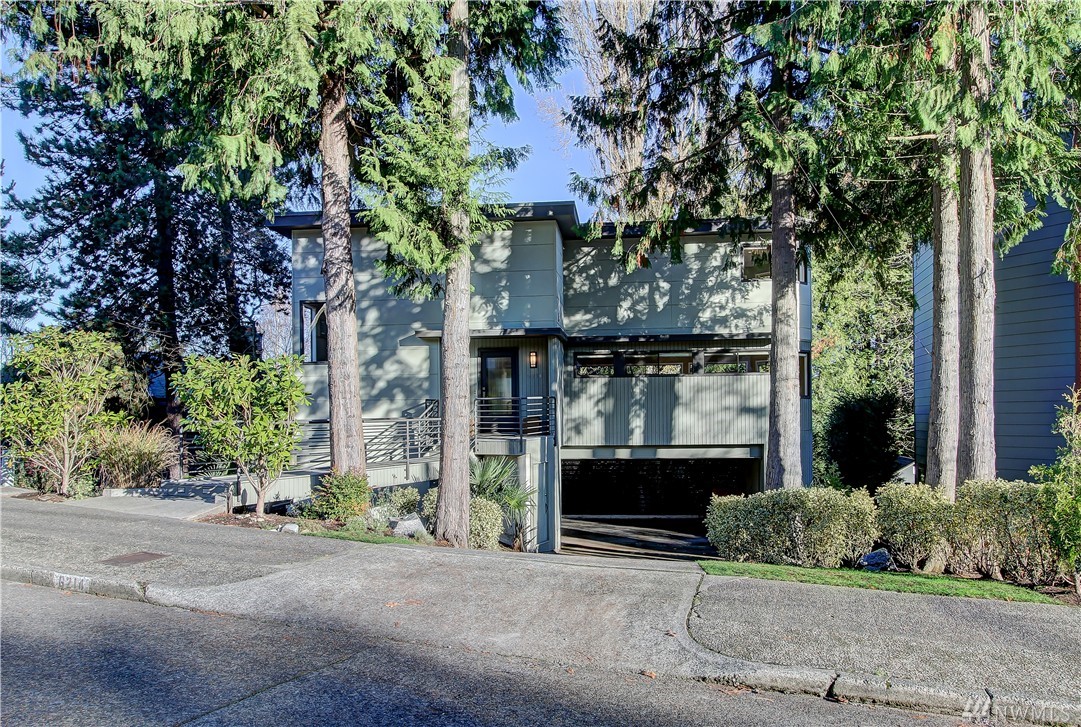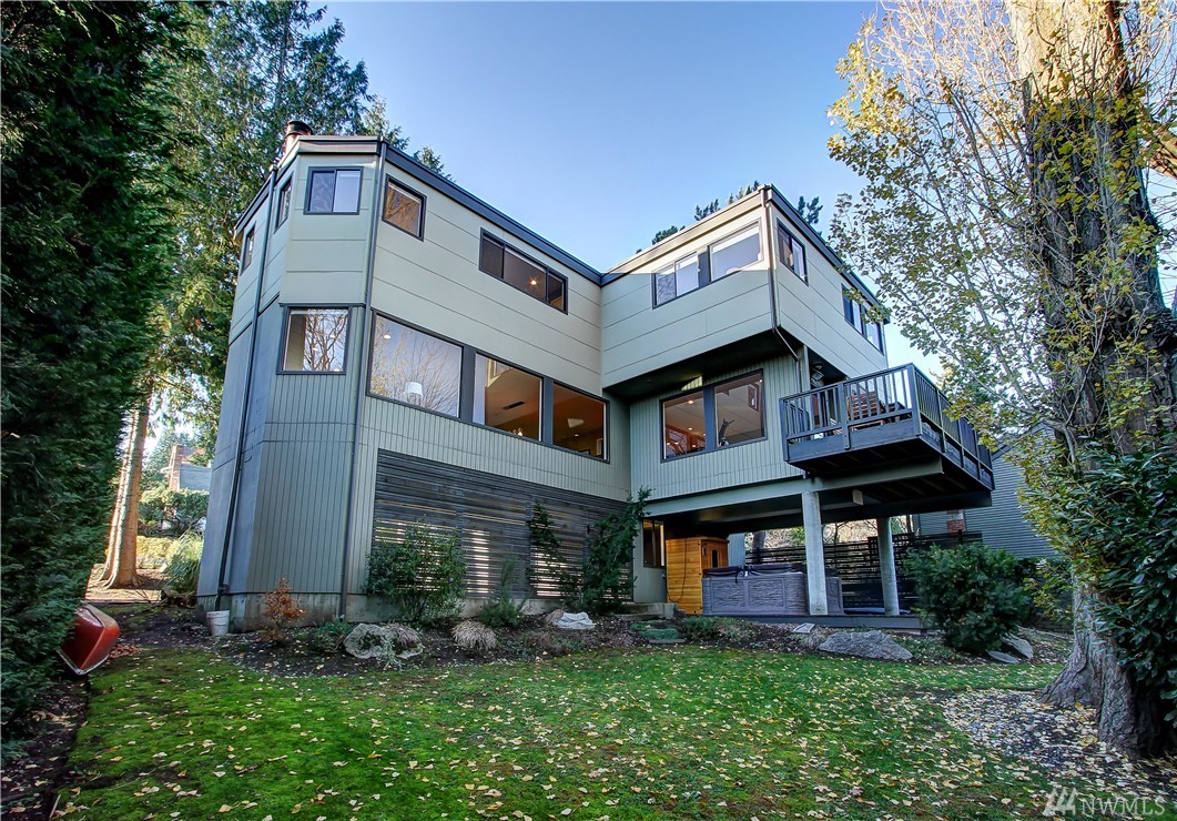 Hawthorne Hills Contemporary: loads of natural light yet mature trees provide privacy & tree house-like view. Main floor has open floor plan with bamboo floors, wood burning fireplace, updated kitchen w/ granite slab counters, stainless appliances, family room, deck, Cascade views, and 1/2 bath. Convenient laundry, 3 beds, full bath, and a master suite with 3/4 bathroom up. Rec room on the lower level, access to yard and 2 car car-port. Great access to lake/Magnuson Park and U-Village.