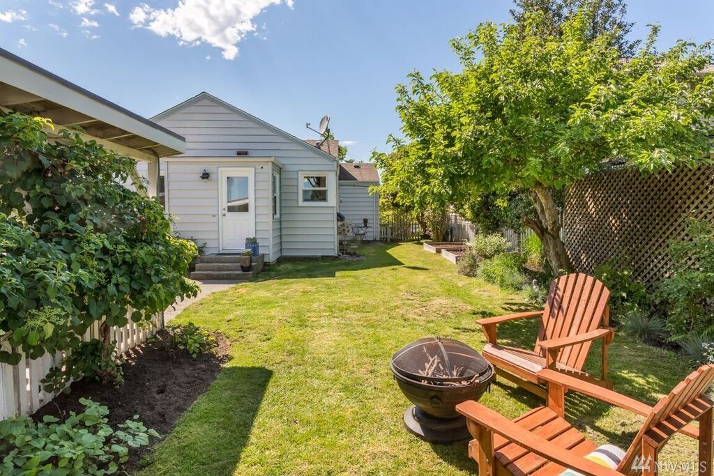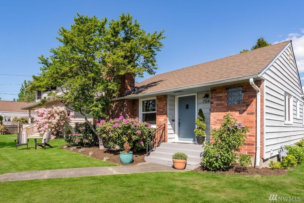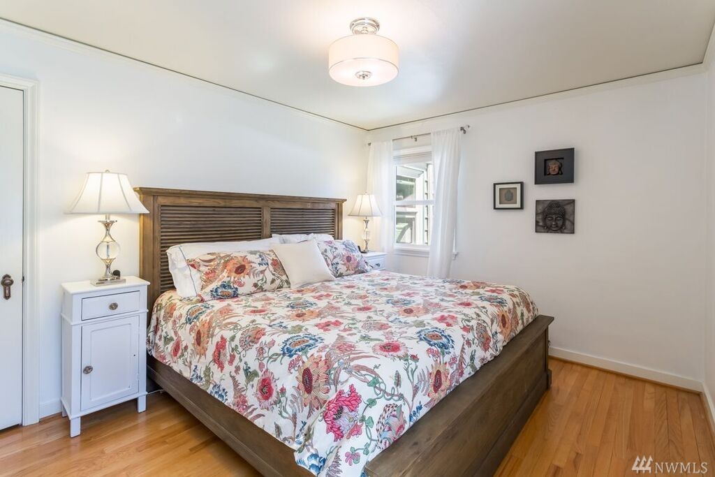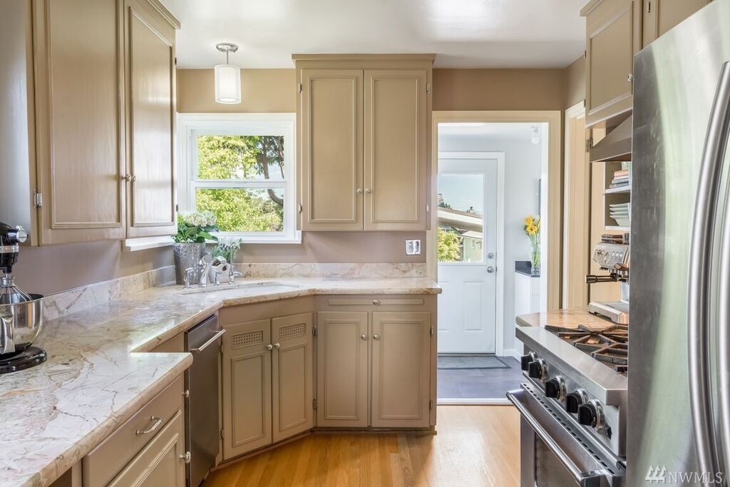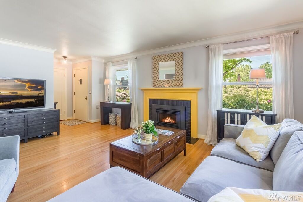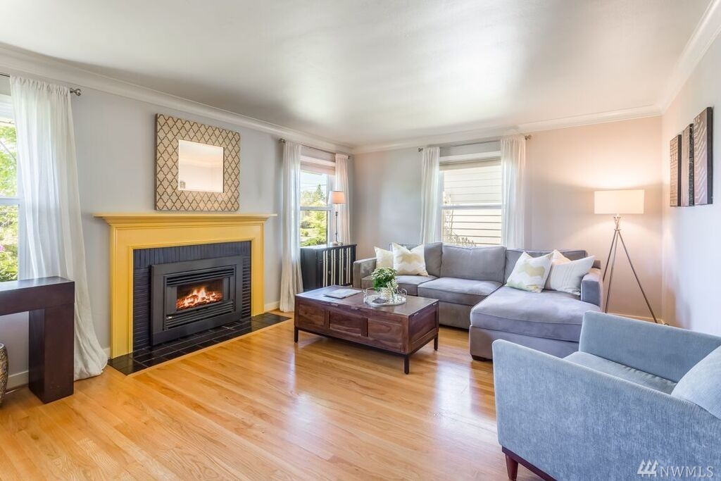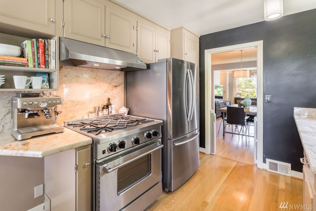 Charming Sunset Hill Cape Cod on one of the most coveted streets in Ballard. Main floor hardwoods, gas fireplace, updated windows, newer roof. Marble counters in kitchen with new stainless appliances including a Blue Star gas range. Lower level family room, bdrm, 3/4 bath, new carpet, laundry and an abundance of storage. Private backyard fully fenced, covered patio, raised beds and a mature apple tree providing buckets of apples PLUS peek-a-boo view of Mt Rainier. 1 car garage, covered carport.