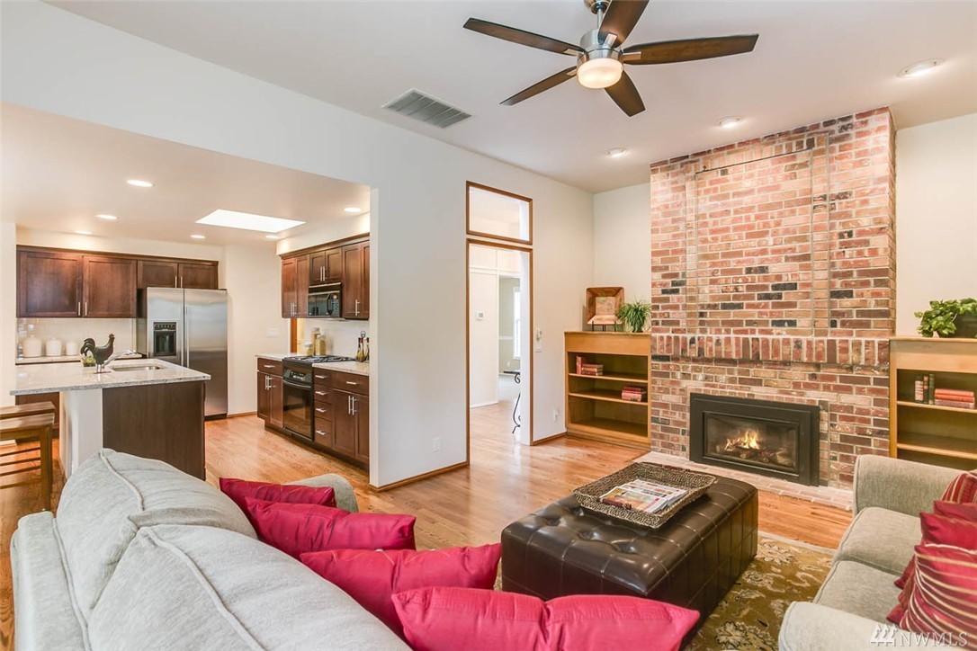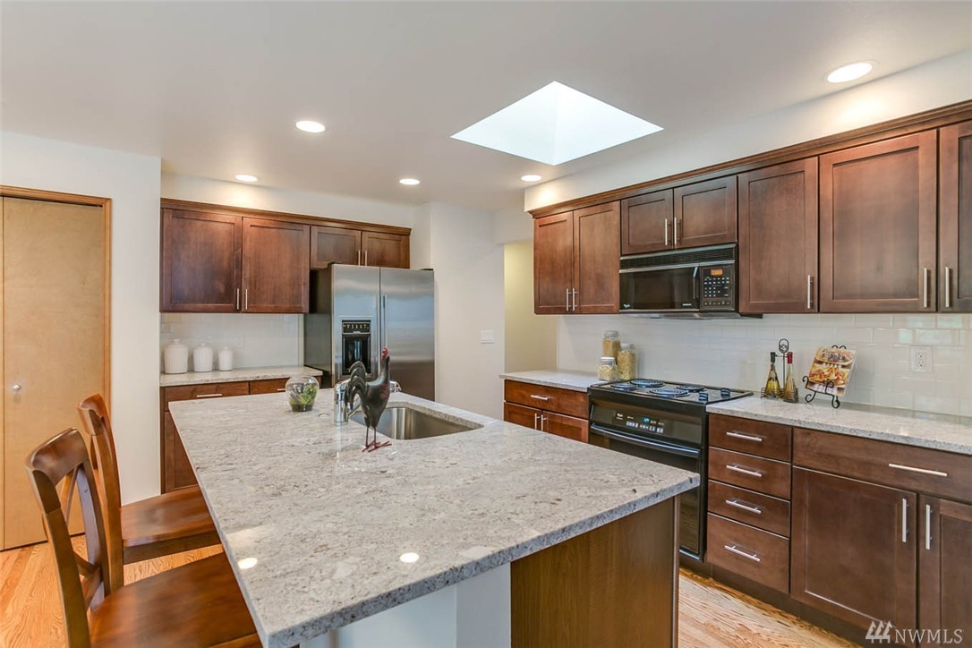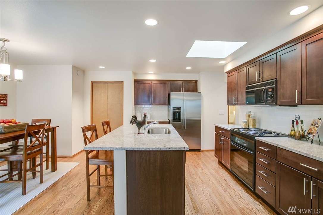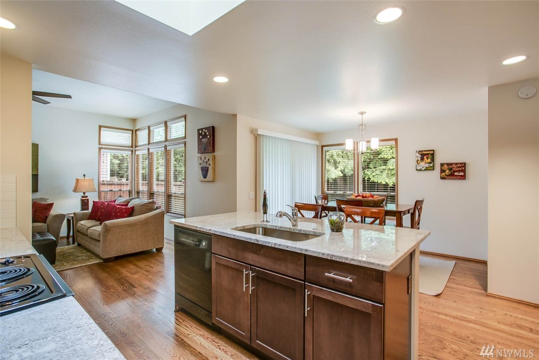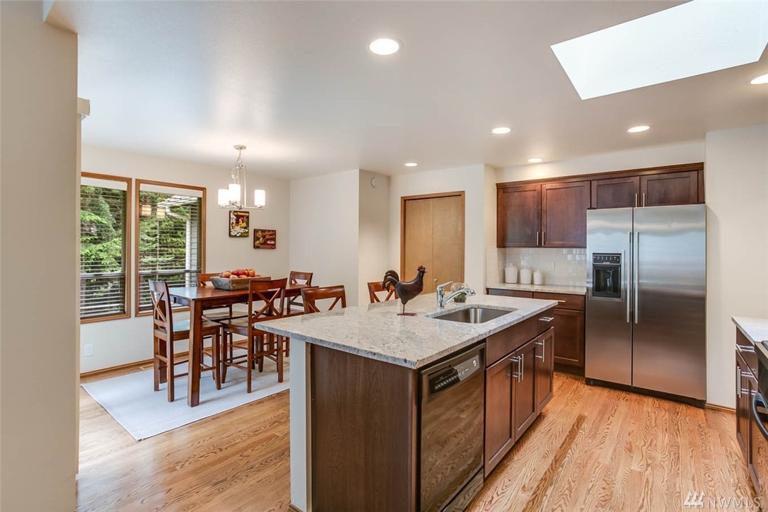 Stylishly remodeled and updated one level home in the heart of Sammamish. Stylish modern flair begins in new kitchen with espresso cabinetry, slab granite, beautiful hardwood floors, and large skylight. Master Suite with soaring ceilings and french doors to back patio, 2 remodeled bathrooms featuring new cabs, tile, and granite. 2 fireplaces, brick and marble faced, both gas. Architectural composition roof. Backyard w/large patios and private backyard. Close to Shopping, Freeways. Iss SD!