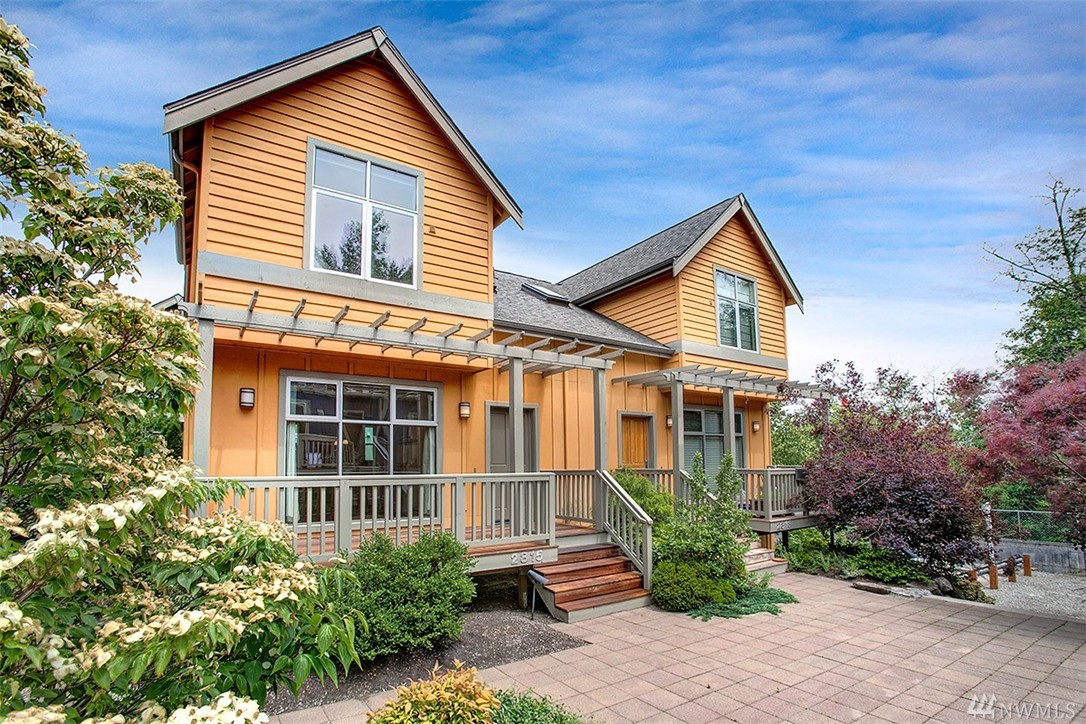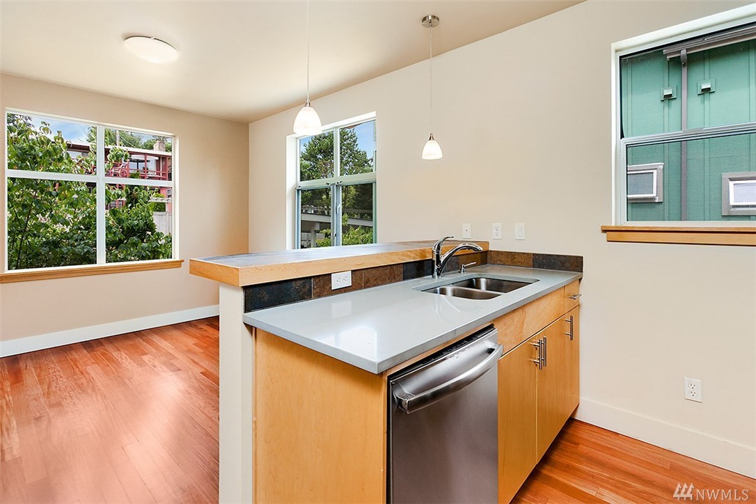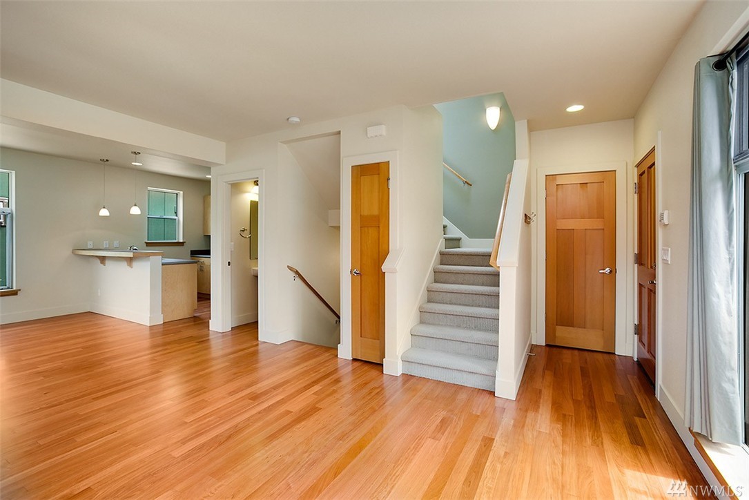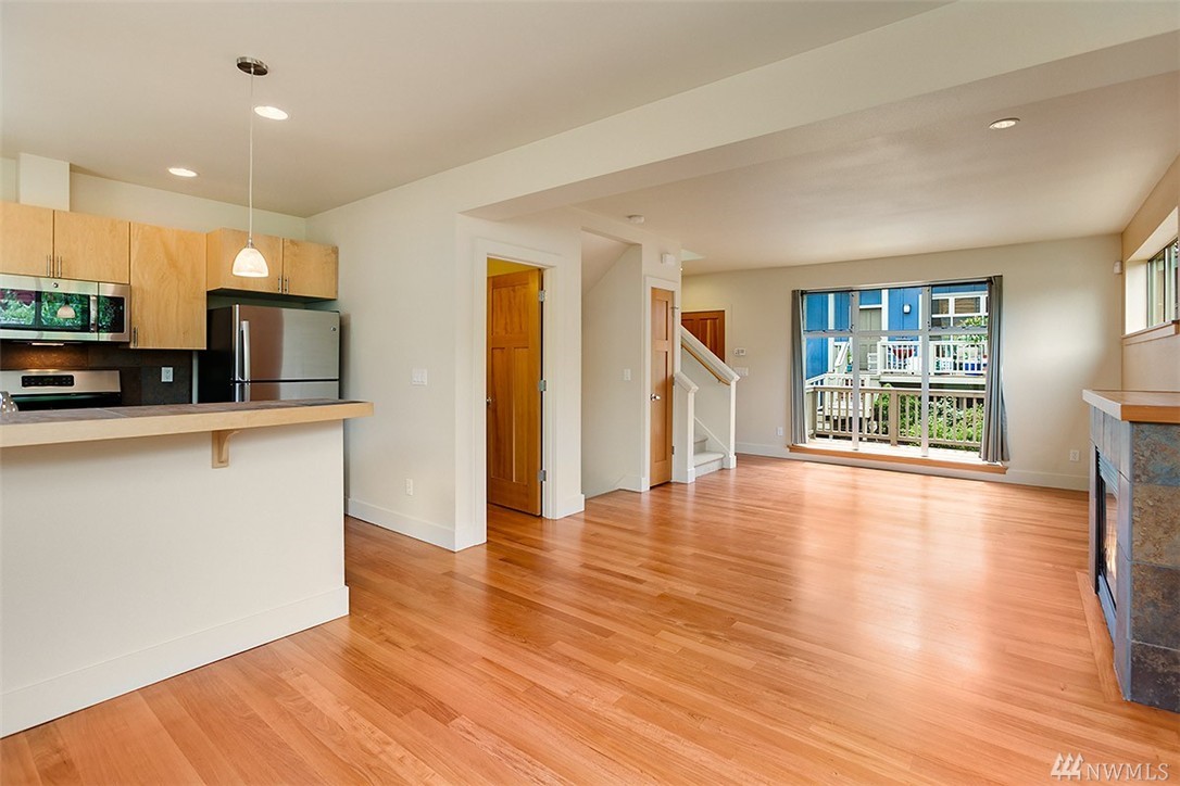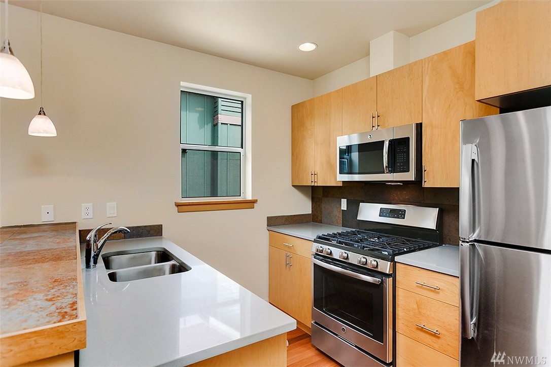 Nestled next to city greenbelt. This home features beautiful natural materials, Patagonia Cherry hardwood floors, maple cabinetry, Asian Fir doors. New Berber carpet. Brand new SS kitchen w/gas cooking. Quartz countertops. Cathedral ceilings. Skylights & tall windows bring natural light into interior spaces. Furnace rated gas fireplace heats entire main floor. Appealing Ironwood deck focuses on lush landscaped common courtyard spaces. Cedar beveled siding. Mins to Mt.Baker Sound Transit station.