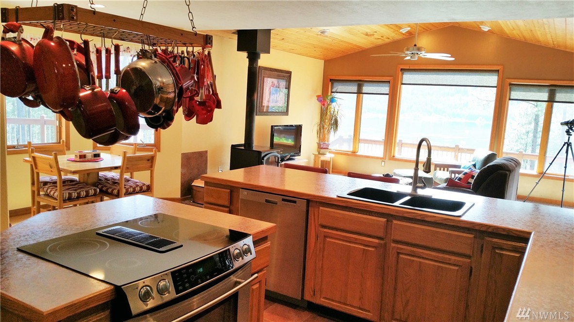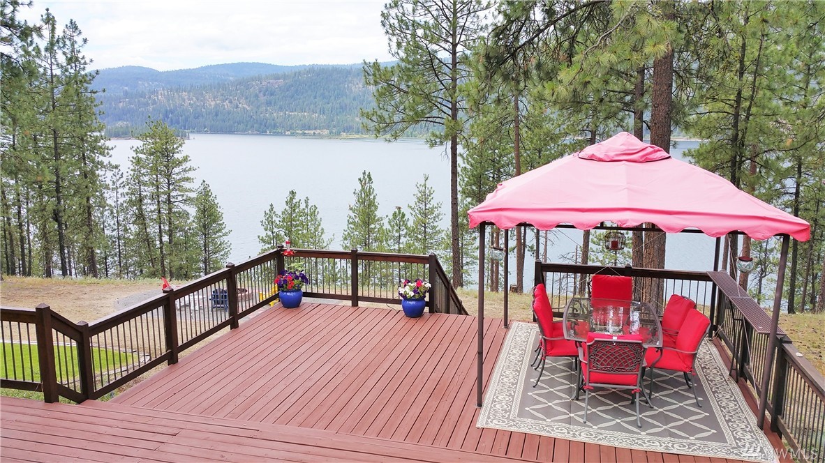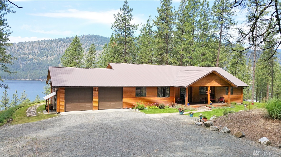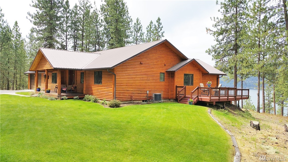 VIEW HOME ON LAKE ROOSEVELT! Enjoy quiet living in this 4 br/2ba, 1 level home situated on 6.54 secluded acres & 300' of waterfront to the 1310 line. 1700 s/f of deck overlooking the lake as well as a covered entry deck with porch swing to enjoy your morning cup of coffee. Kitchen with breakfast nook & pantry that opens into family room. Walk-in tiled shower & large soaking tub. Multi-fuel wood burning stove or central forced air heat & A/C. New 40x60 drive thru shop, 24x36 det gar, 2 car att