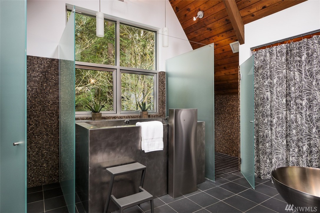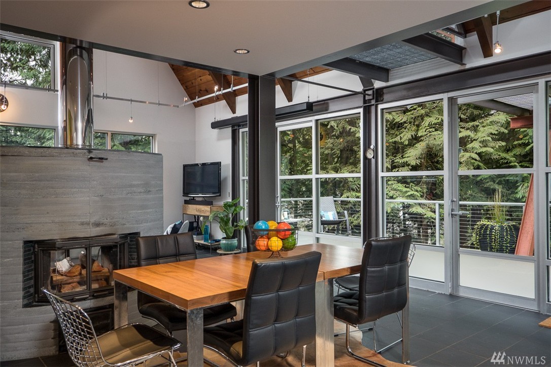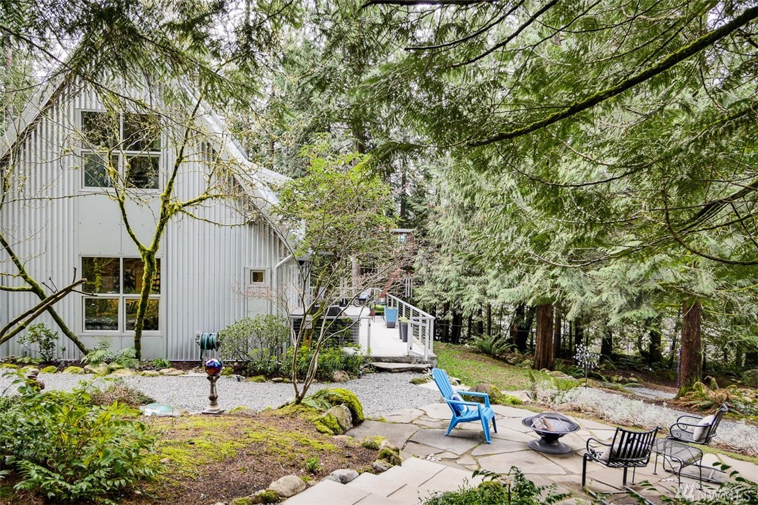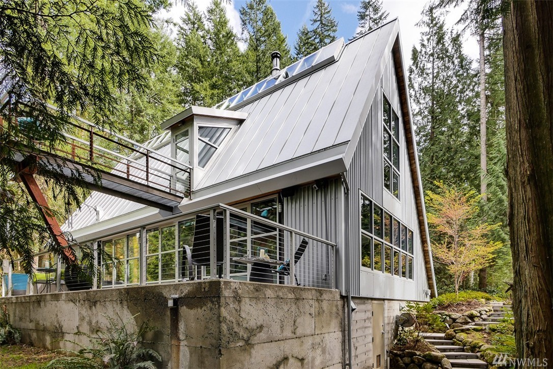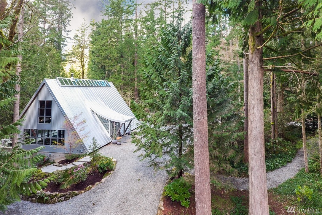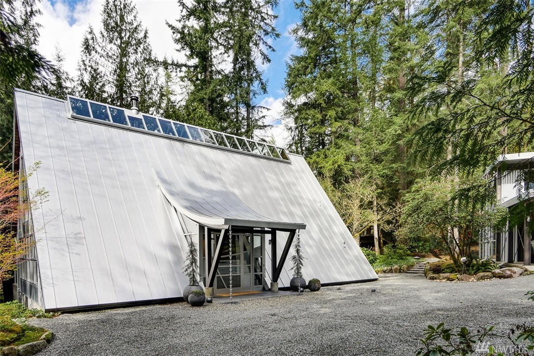A dramatic chalet made of steel and glass. Designed by Sandler-Kilburn Architects, it is awe inspiring in its exquisitely modern reincarnation. Custom walnut cabinets frame the kitchen, a Tulikivi soapstone fireplace separates the space, a stainless steel Japanese soaking tub anchors the master suite. For the car aficionado or artist, the steel and glass garage is a delight and has a separate meter for gas and water. Set on just over an acre of natural wooded beauty adjacent to Mirrormont.