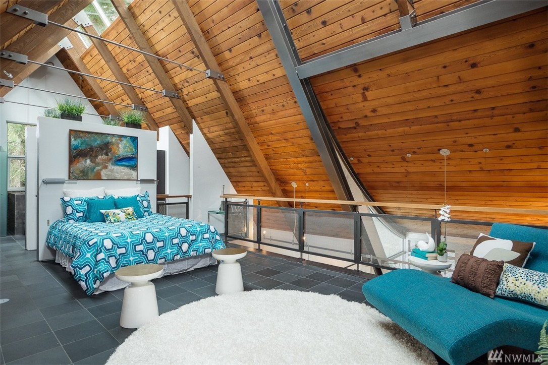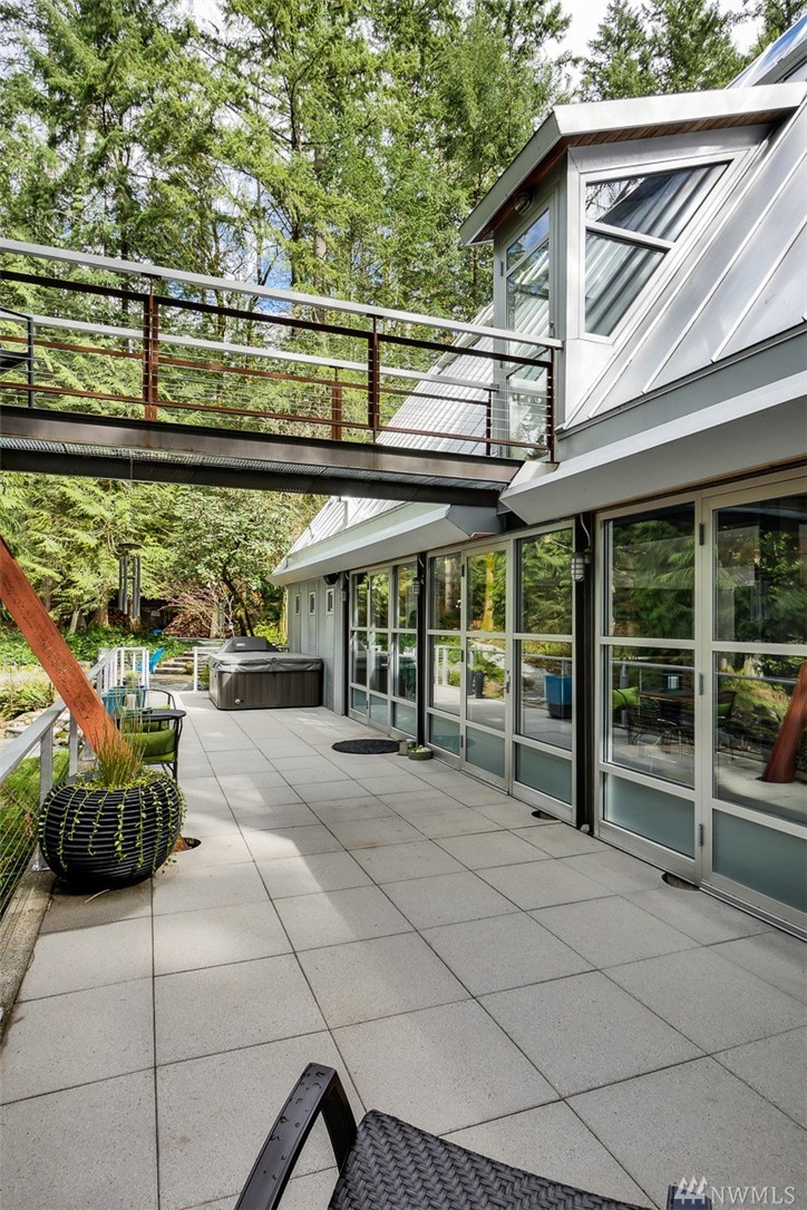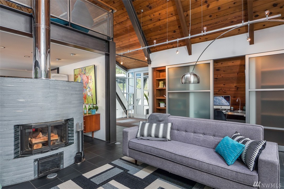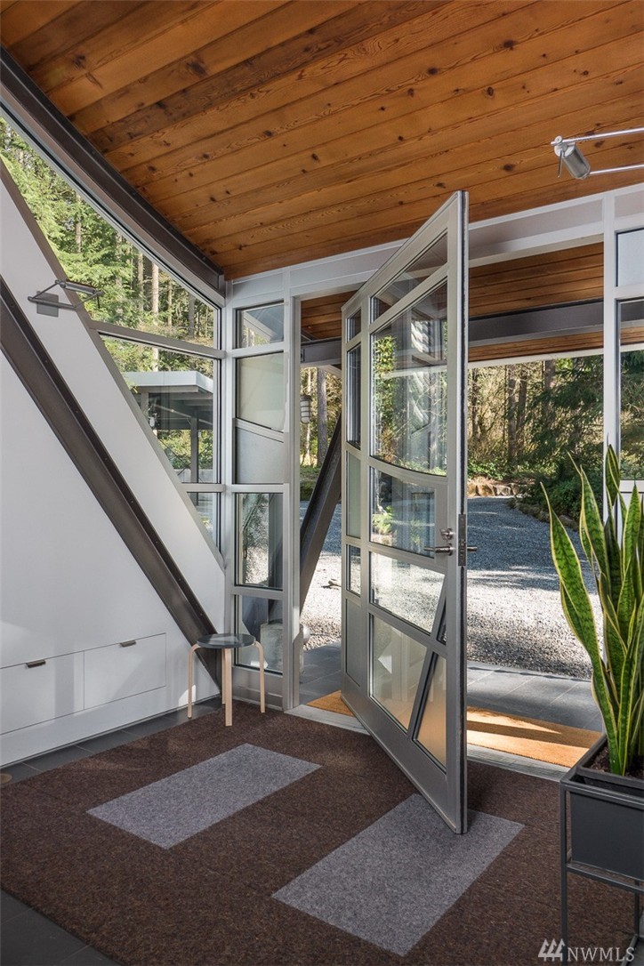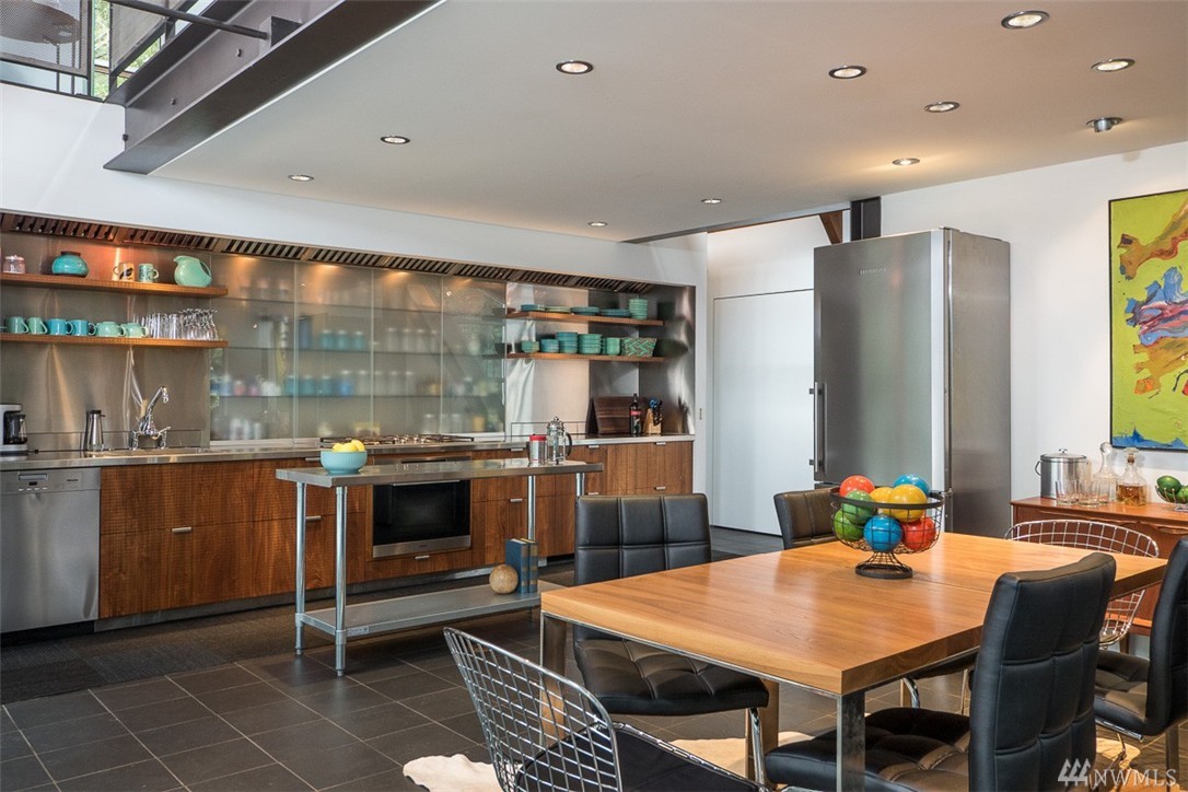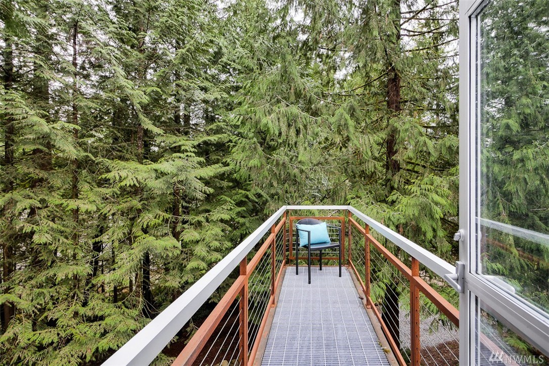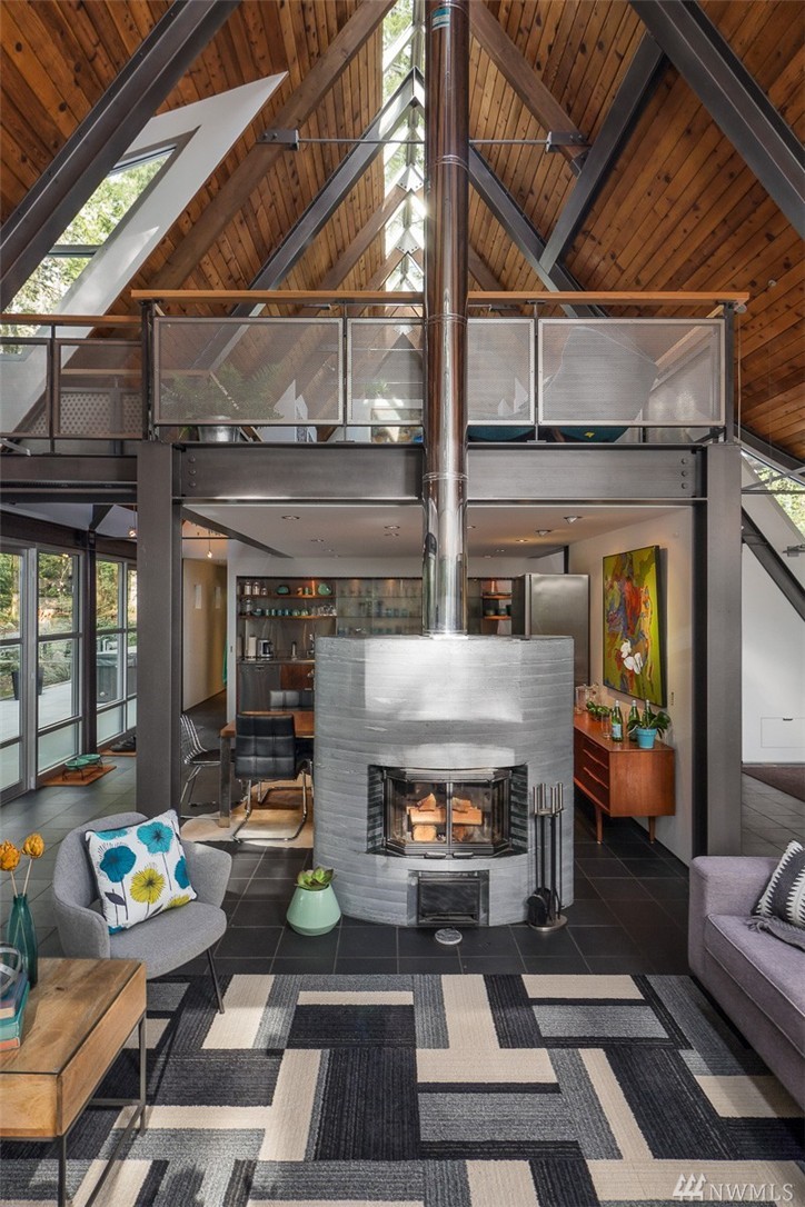 A dramatic chalet made of steel and glass. Designed by Sandler-Kilburn Architects, it is awe inspiring in its exquisitely modern reincarnation. Custom walnut cabinets frame the kitchen, a Tulikivi soapstone fireplace separates the space, a stainless steel Japanese soaking tub anchors the master suite. For the car aficionado or artist, the steel and glass garage is a delight and has a separate meter for gas and water. Set on just over an acre of natural wooded beauty adjacent to Mirrormont.