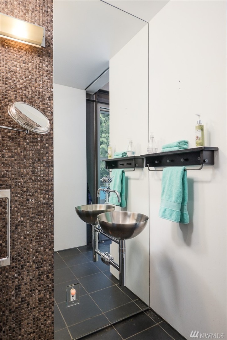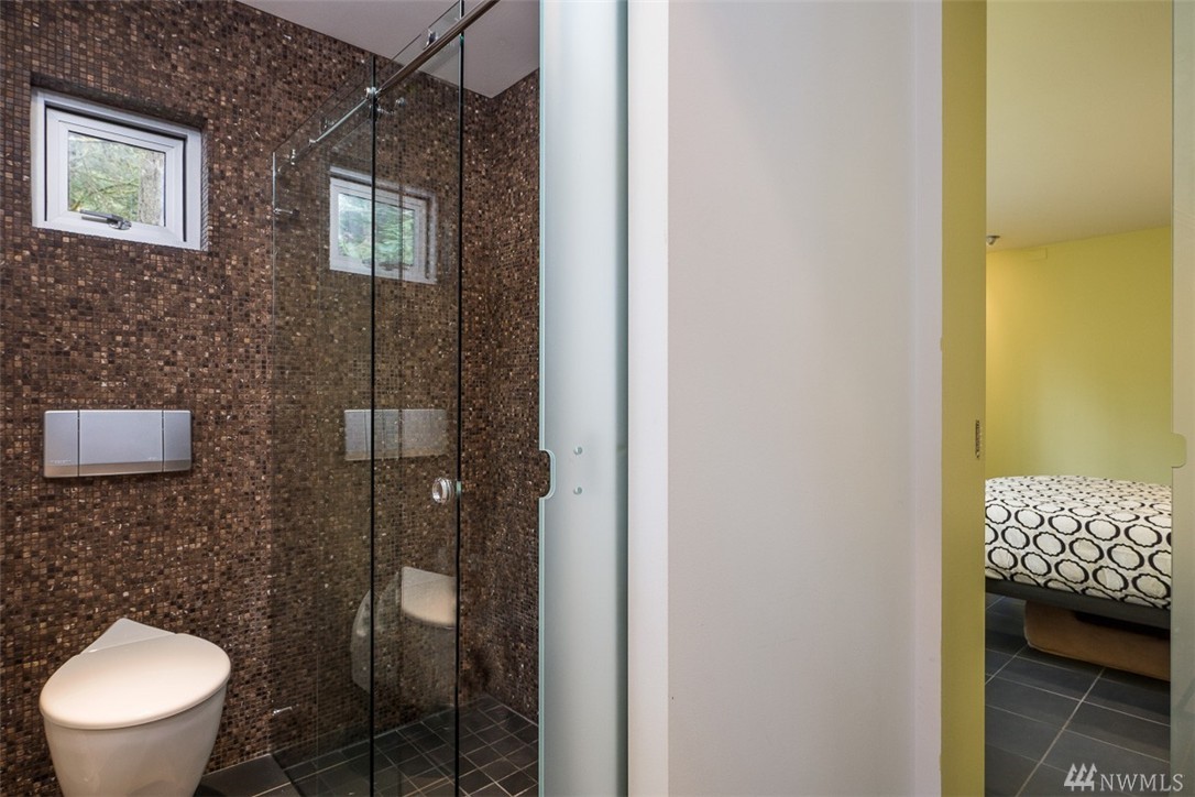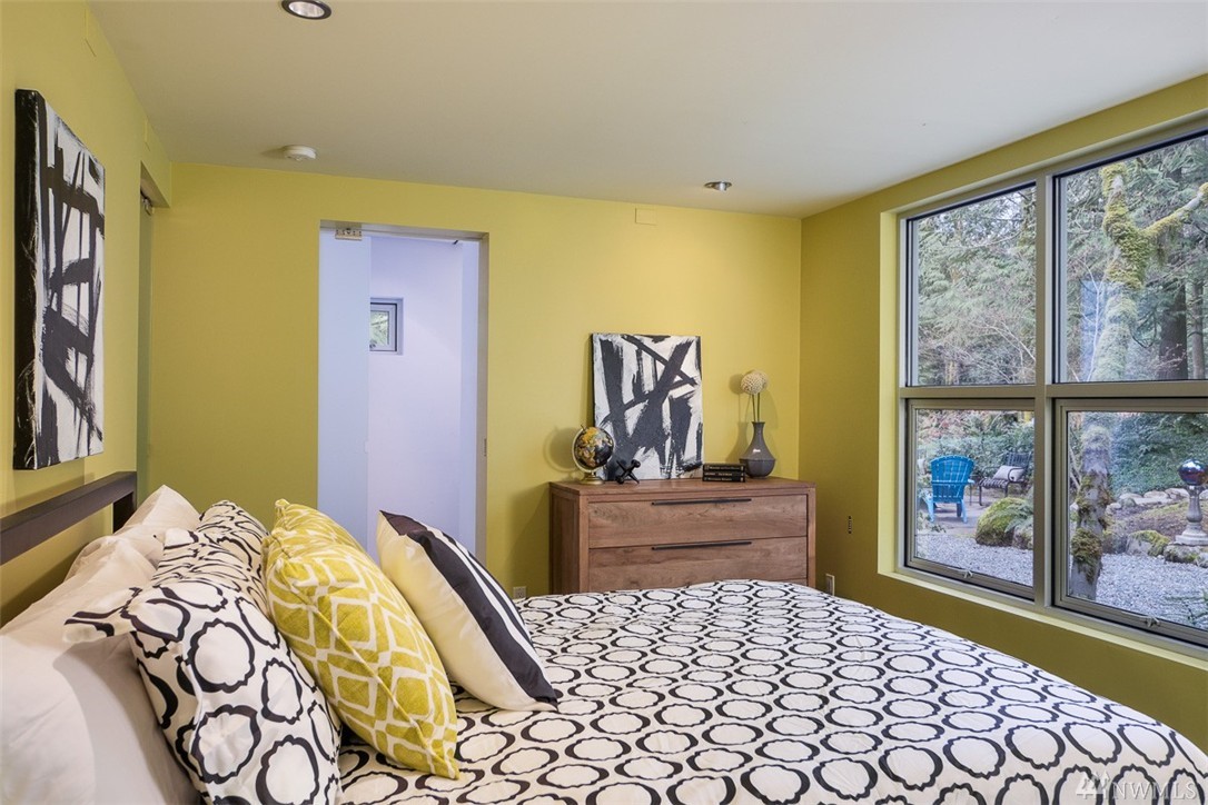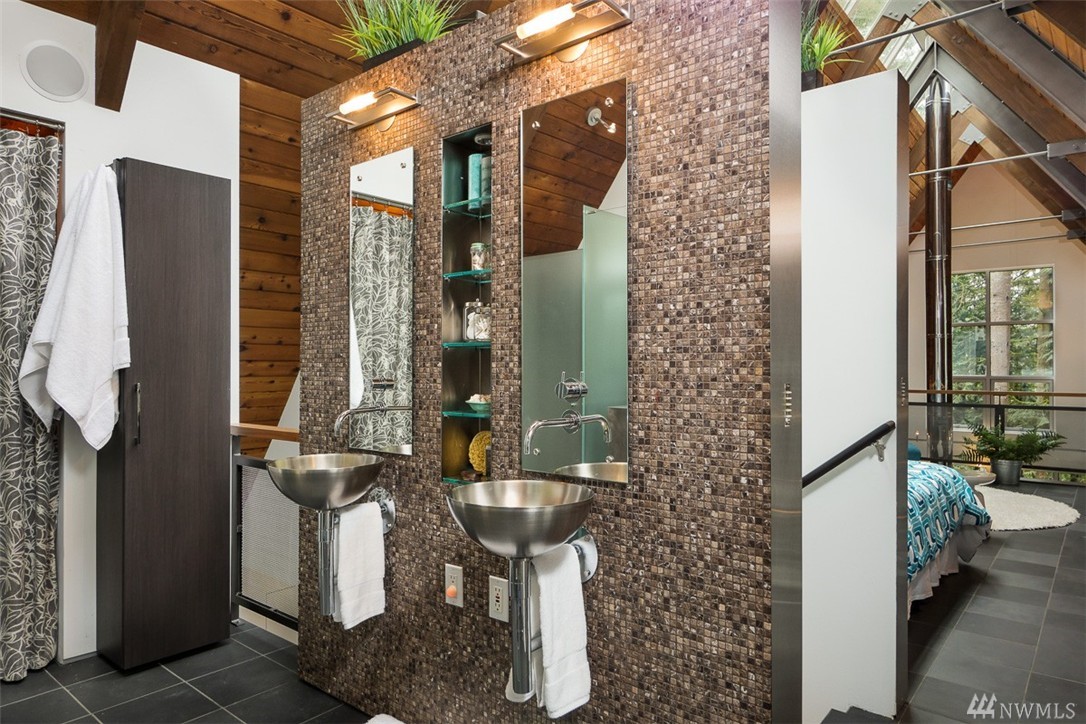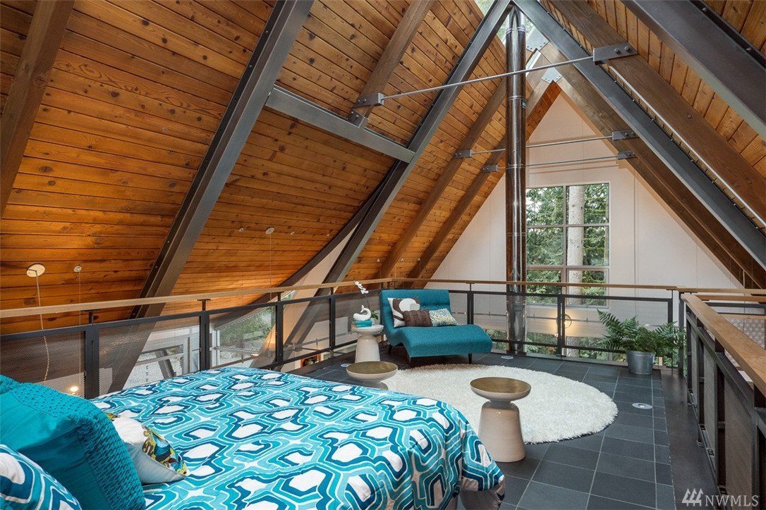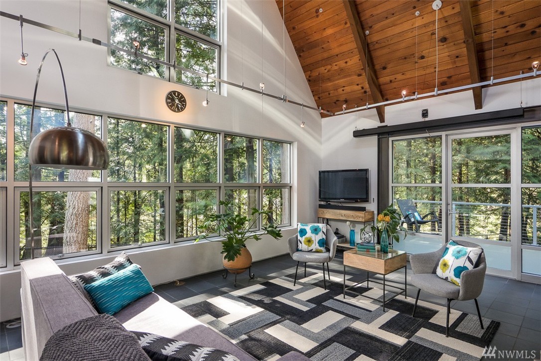 A dramatic chalet made of steel and glass. Designed by Sandler-Kilburn Architects, it is awe inspiring in its exquisitely modern reincarnation. Custom walnut cabinets frame the kitchen, a Tulikivi soapstone fireplace separates the space, a stainless steel Japanese soaking tub anchors the master suite. For the car aficionado or artist, the steel and glass garage is a delight and has a separate meter for gas and water. Set on just over an acre of natural wooded beauty adjacent to Mirrormont.
