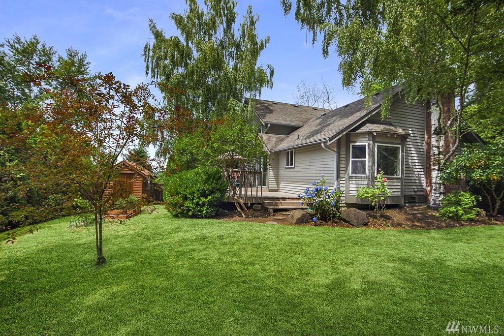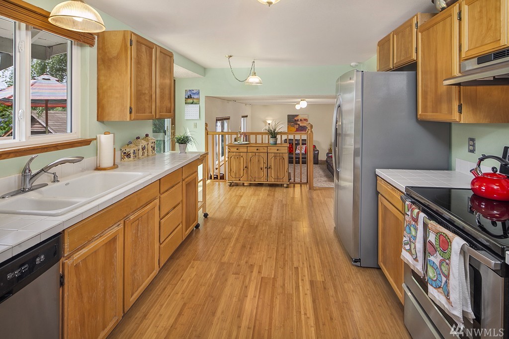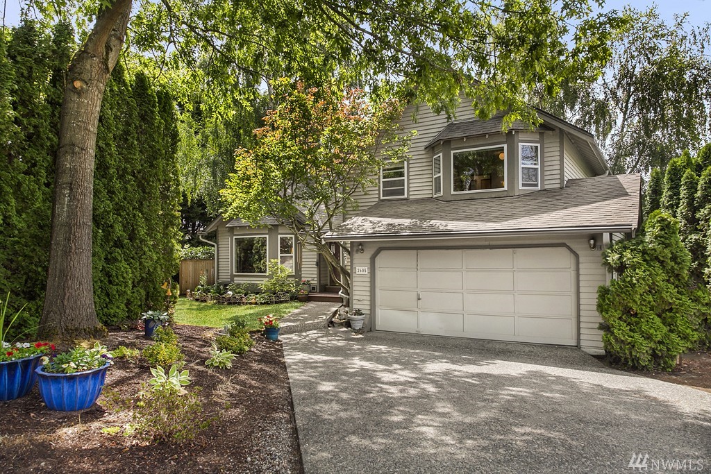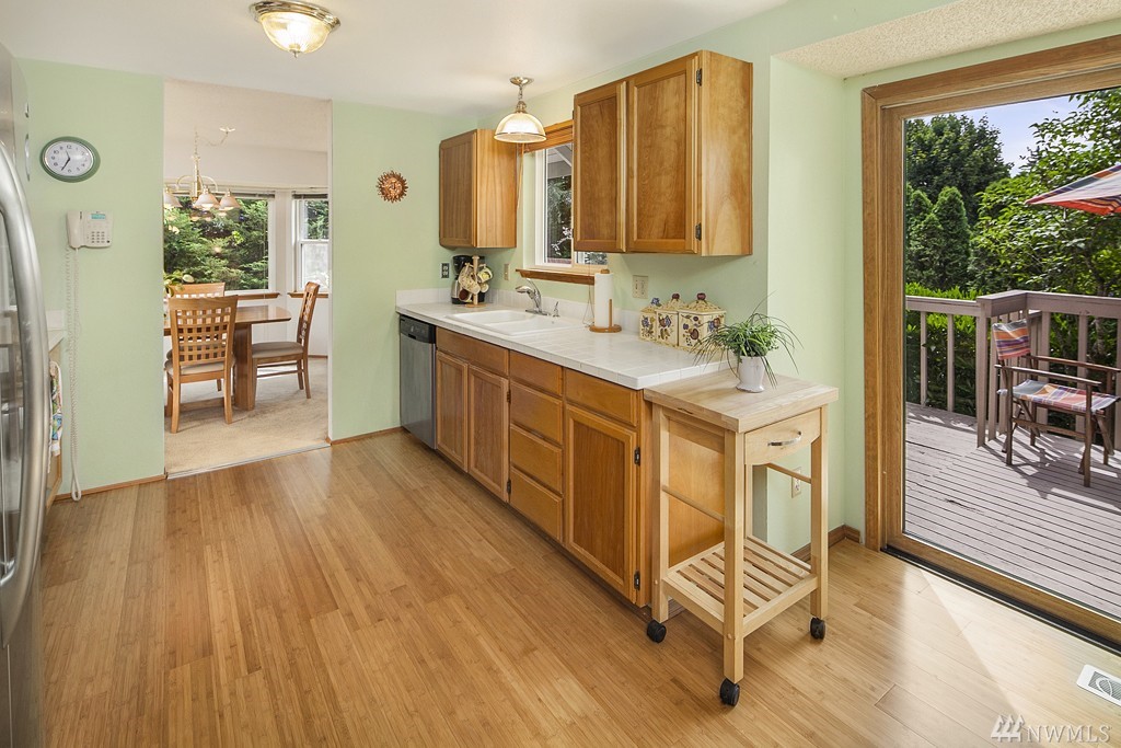 Quiet, cul-de-sac location. Nicely updated tri level floor plan. Living room has front bay window with etched glass & brick fireplace with gas insert. Adjoining formal dining room with bay window. Updated kitchen with tile counters, stainless appliances & bamboo flooring. Spacious lower level family room with adjoining guest bath. Generous master bedroom has walk-in closet and bay window. Vinyl windows, Leaf-Guard gutters. Large fenced yard with mature landscaping. Backs to neighborhood park.