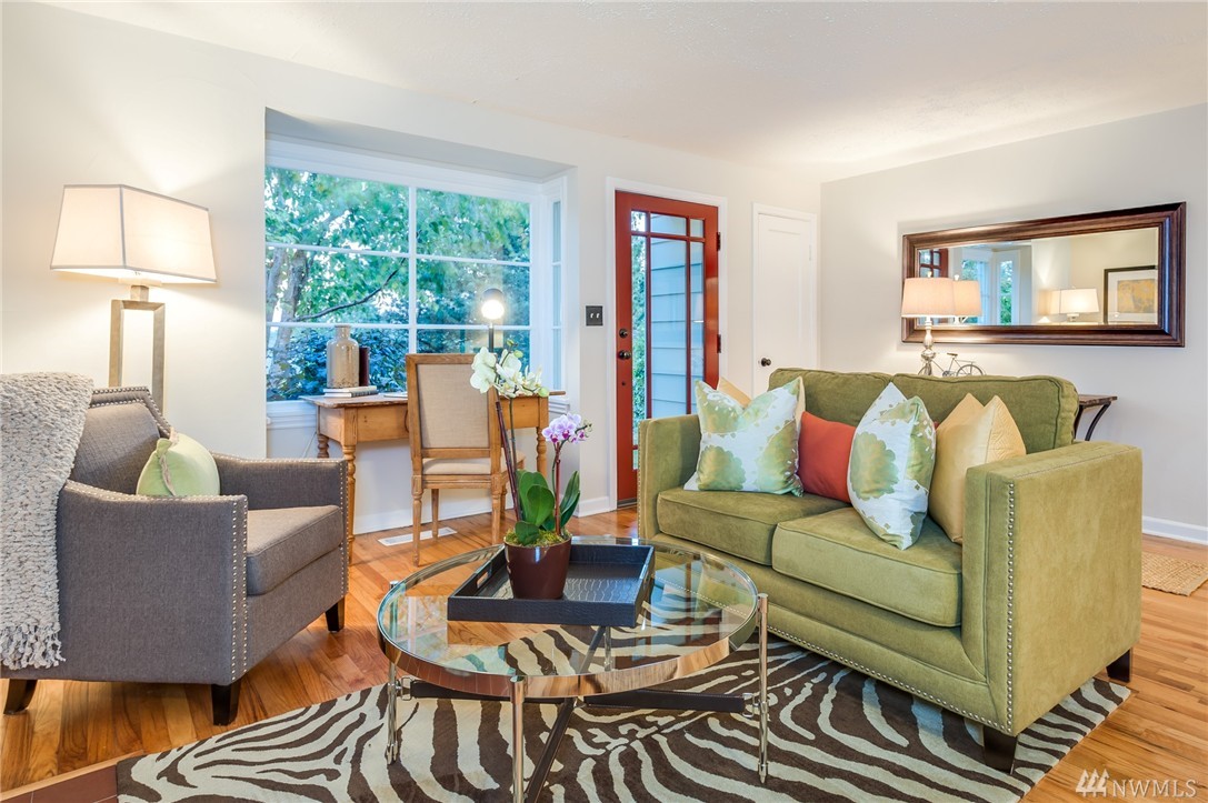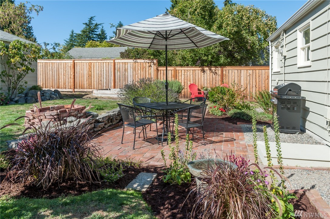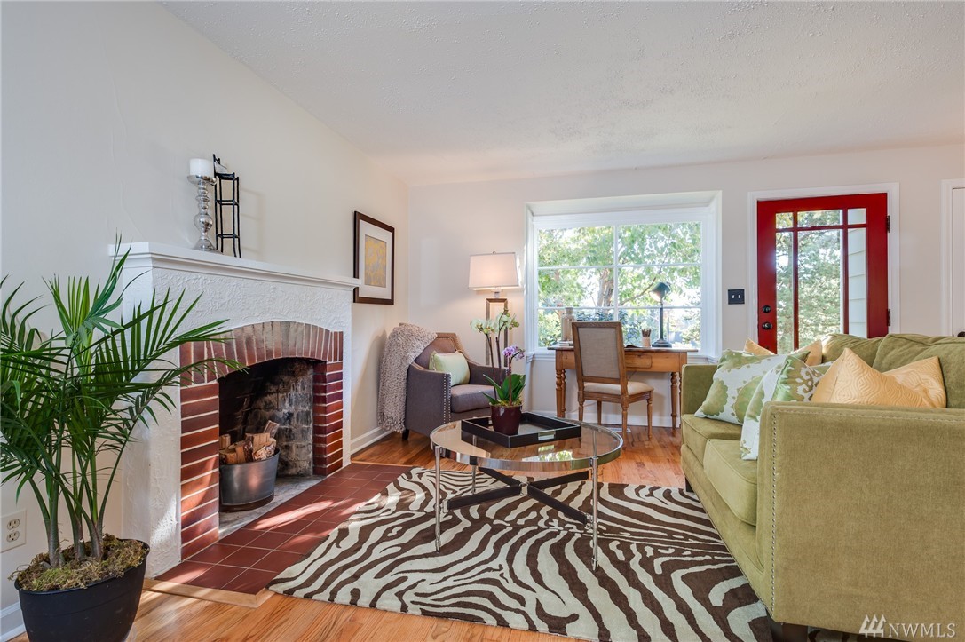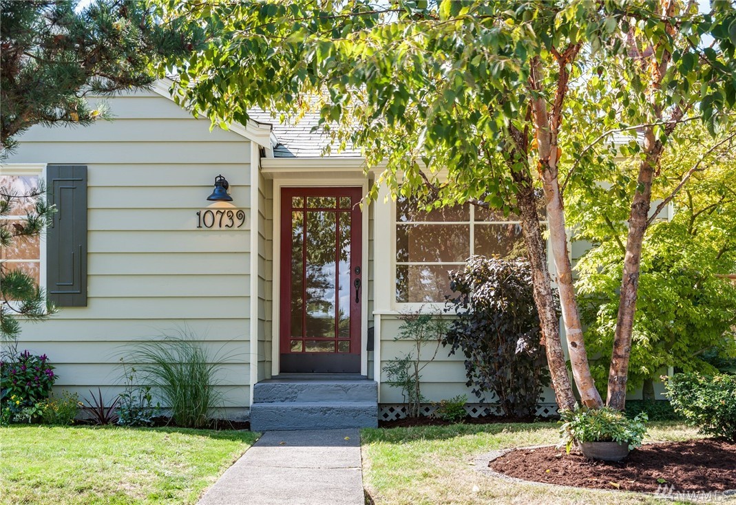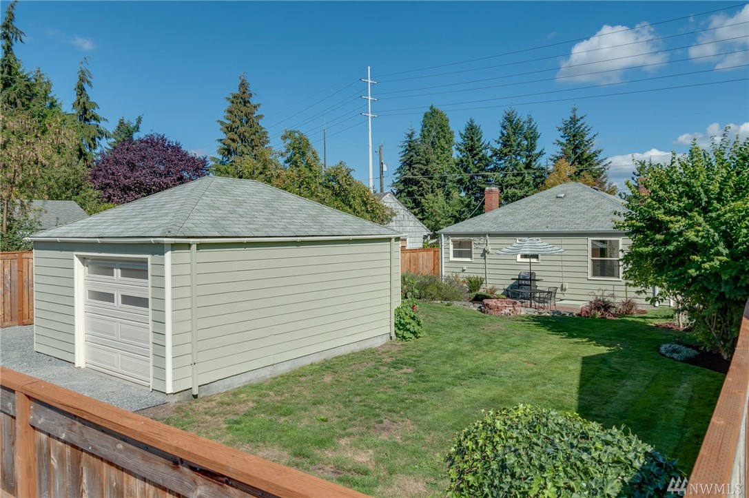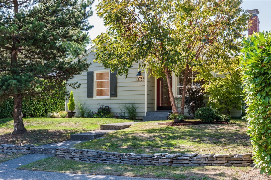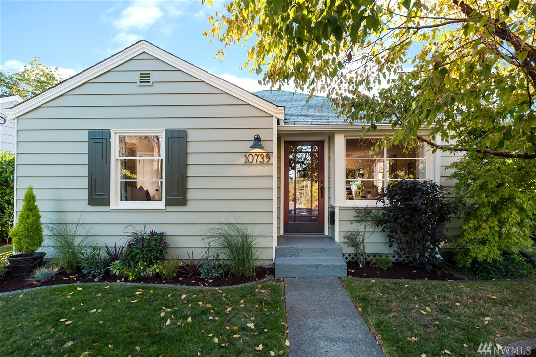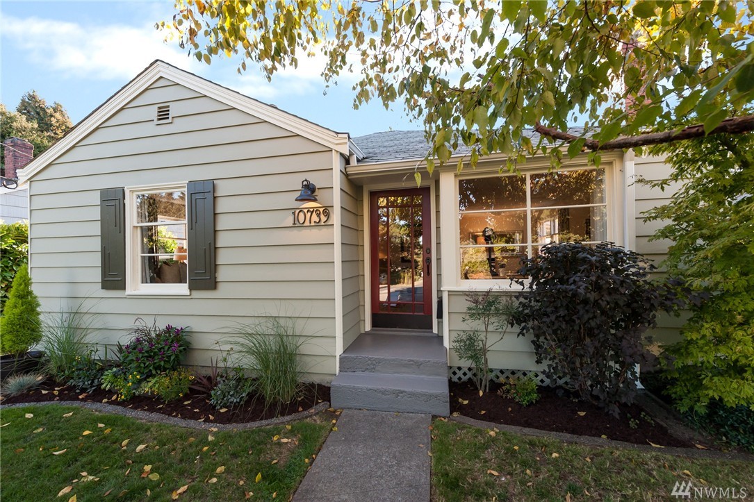 Spacious 2 bedroom home just minutes to Green Lake & a block to the Interurban Trail. Open, circular floor plan with beautiful hardwoods & an abundance of natural light. Period details include the tiled kitchen counters, a charming LR bay window & the manteled fireplace. The laundry room features floor-to-ceiling built-in cabinets & opens to the beautifully landscaped yard, with plenty of space to garden & entertain. One-car detached garage w/ additional workspace & 2 off-street parking spots.