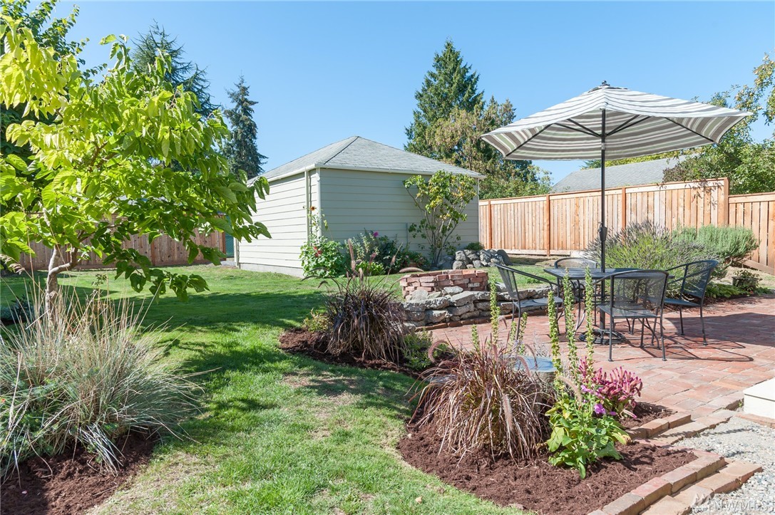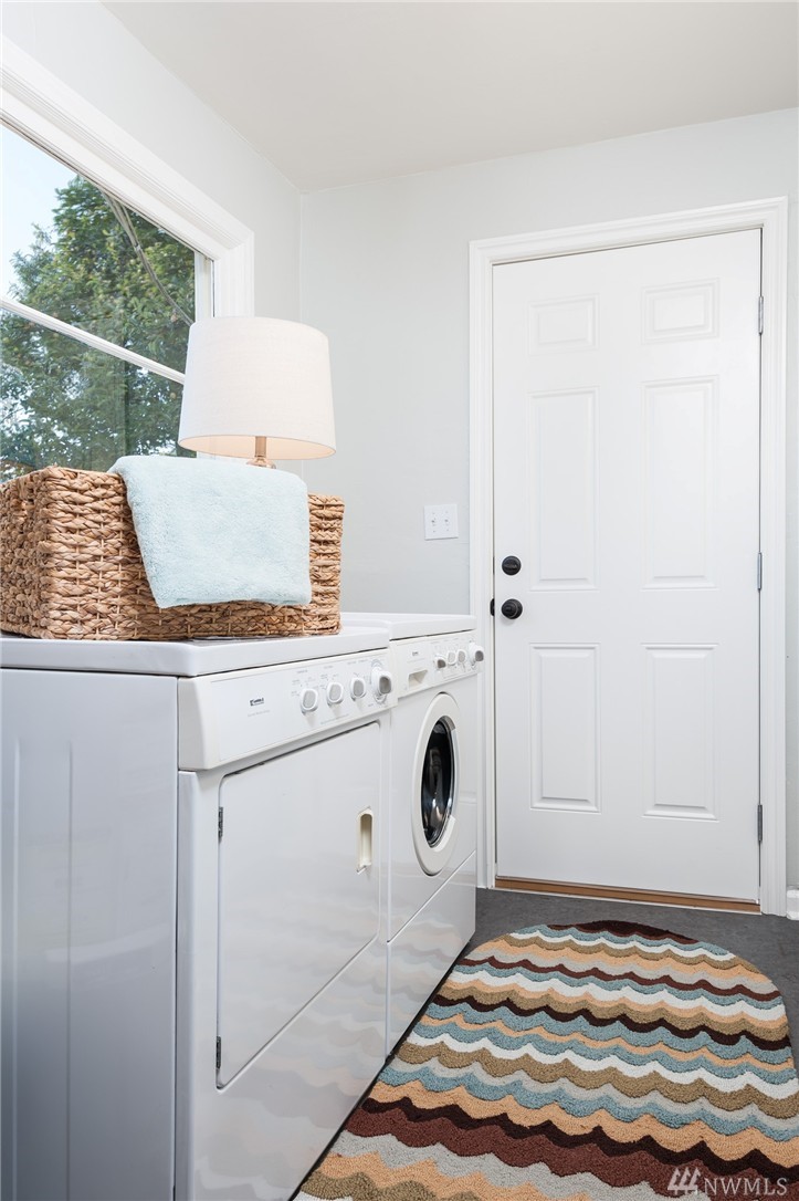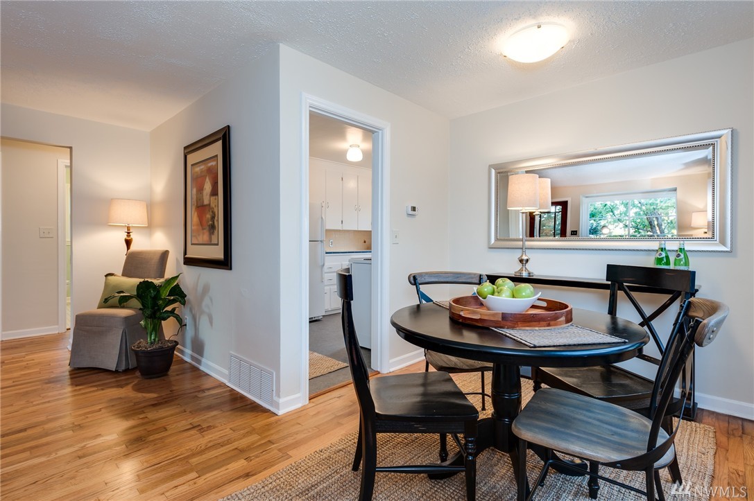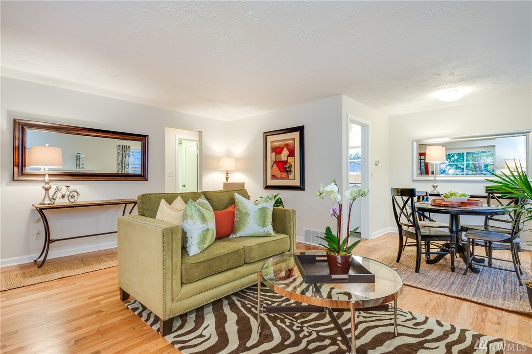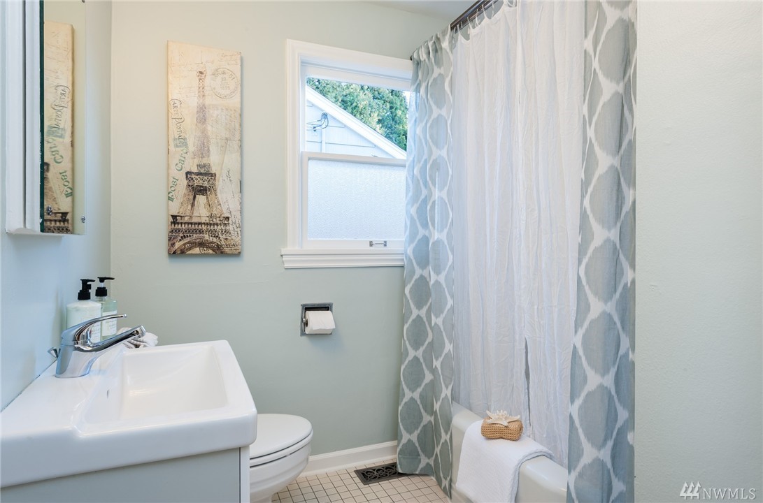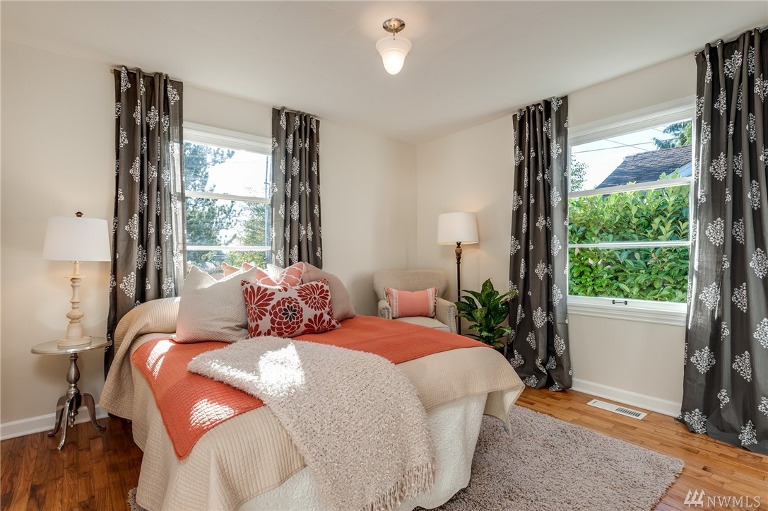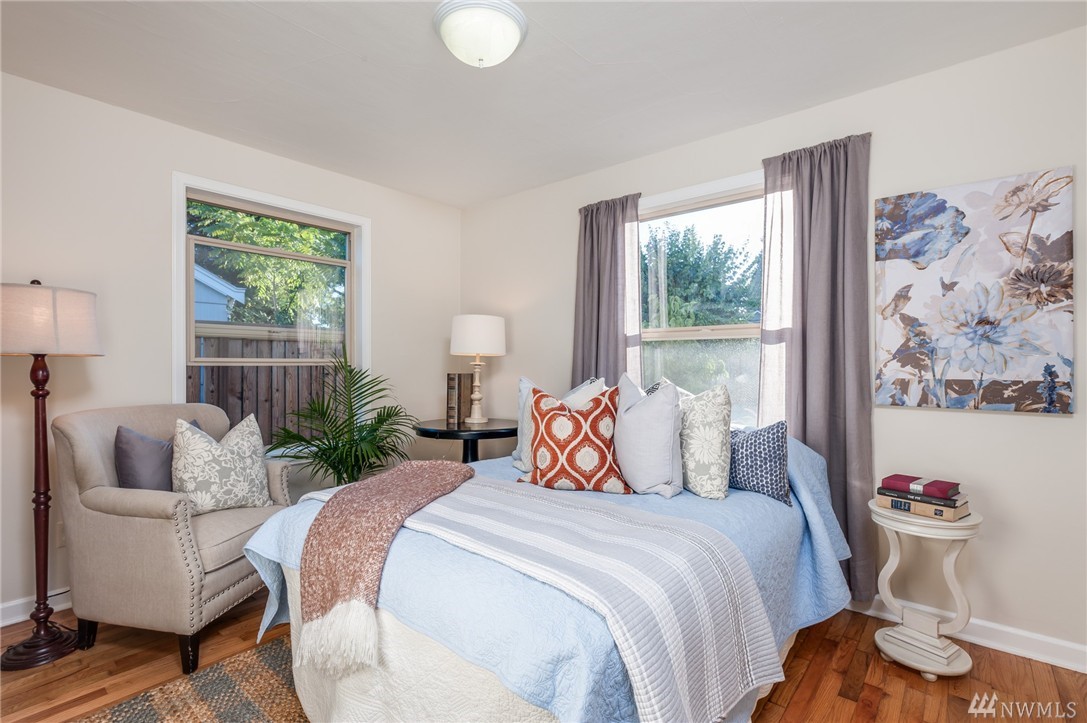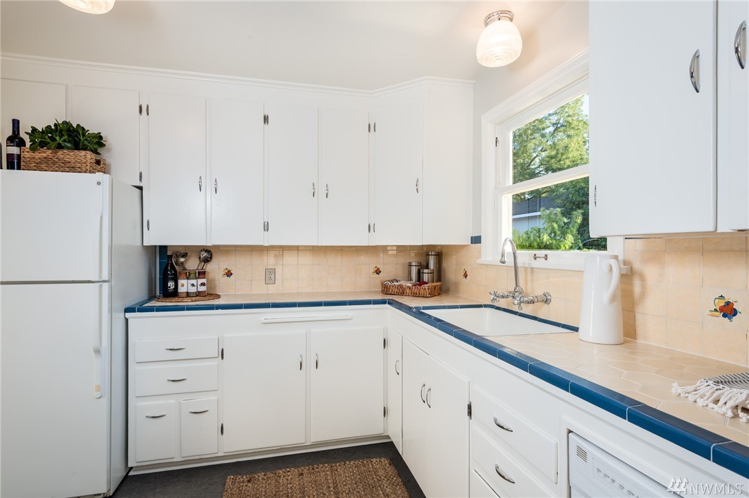 Spacious 2 bedroom home just minutes to Green Lake & a block to the Interurban Trail. Open, circular floor plan with beautiful hardwoods & an abundance of natural light. Period details include the tiled kitchen counters, a charming LR bay window & the manteled fireplace. The laundry room features floor-to-ceiling built-in cabinets & opens to the beautifully landscaped yard, with plenty of space to garden & entertain. One-car detached garage w/ additional workspace & 2 off-street parking spots.