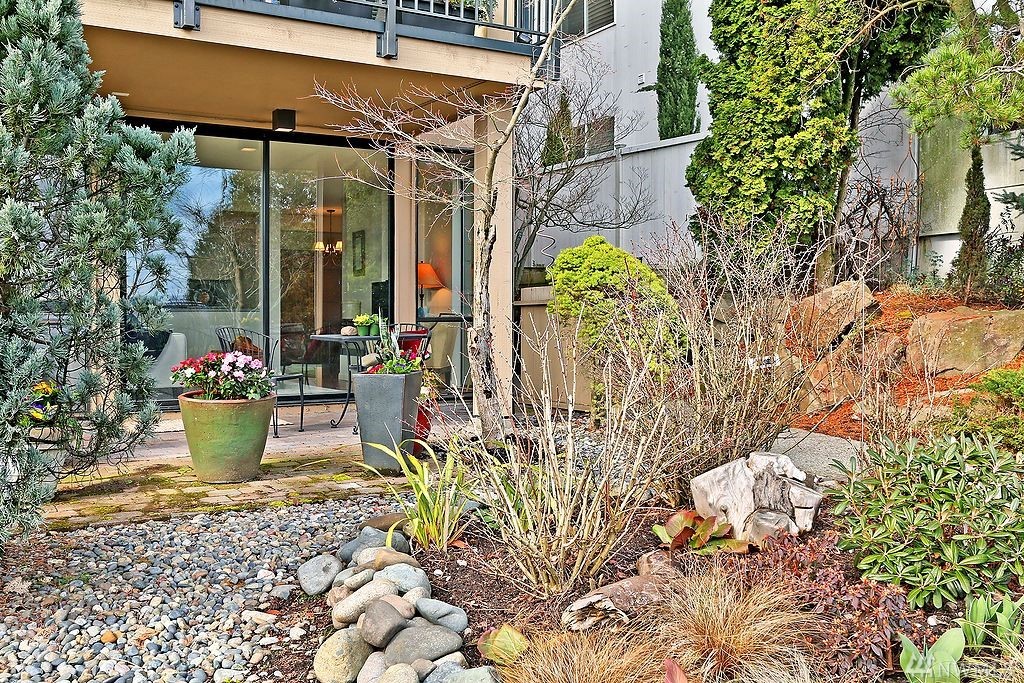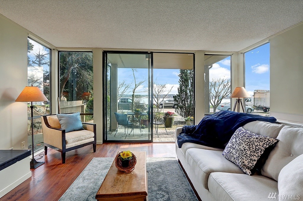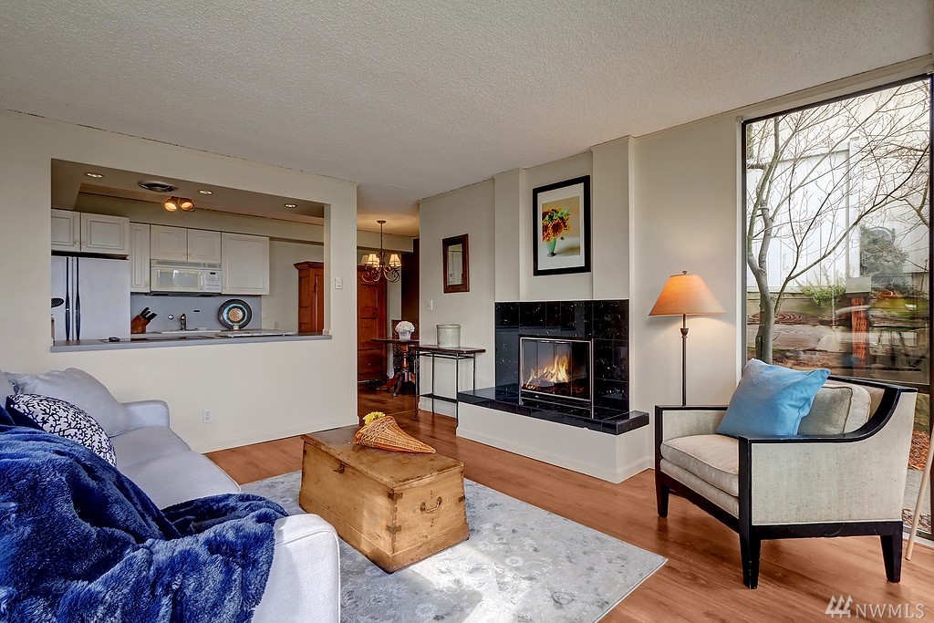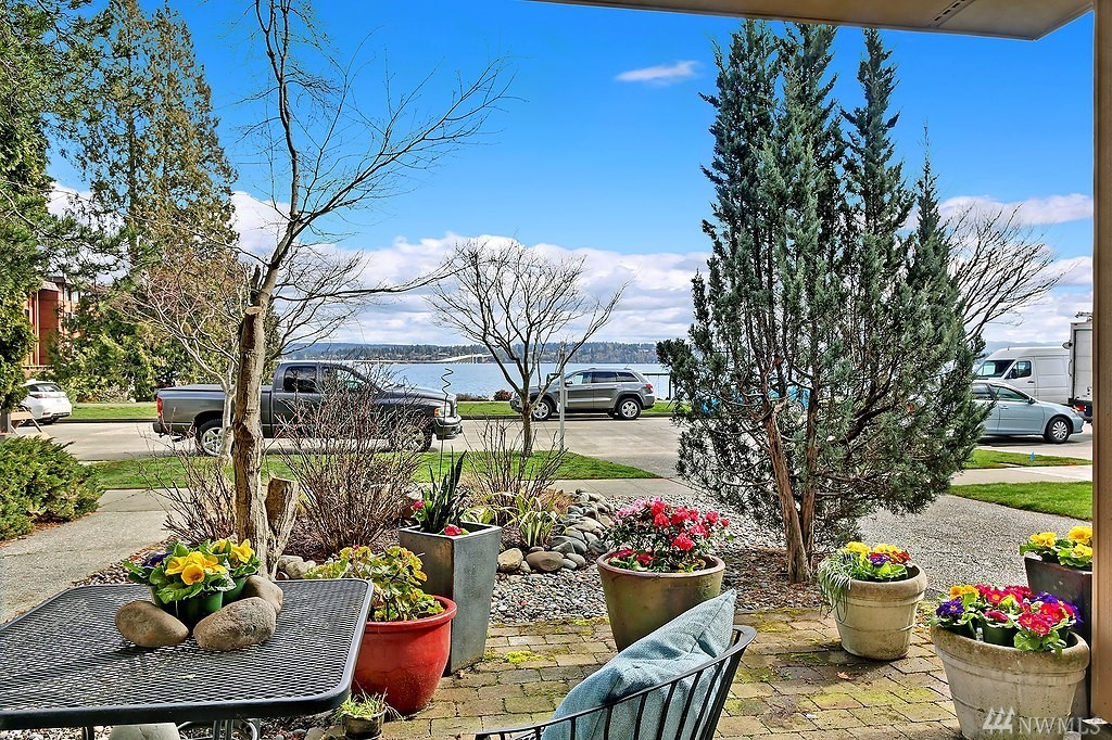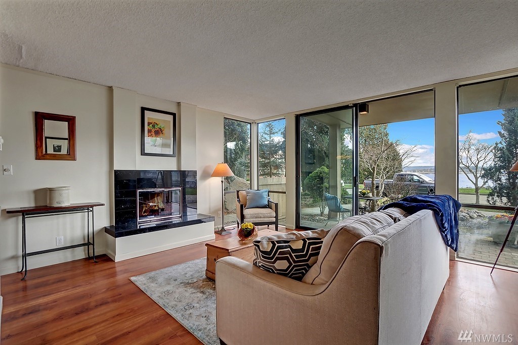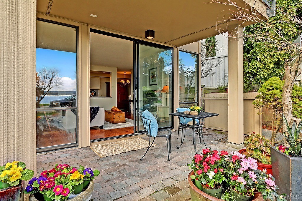 Light filled unit, walls of windows with unobstructed views of Lk Washington. A stone's throw across the street is Madison North Beach Park. Unit has 1 bdrm w/full bath. Ground level living w/open concept kitchen/dining/living room all facing the view & fireplace. Sliding doors to your own private patio & garden. Condo has its own coveted, covered, private parking spot in front of the unit and private entrance. Walk to highly desirable downtown Madison Park amenities. HOA dues only $200 a month!