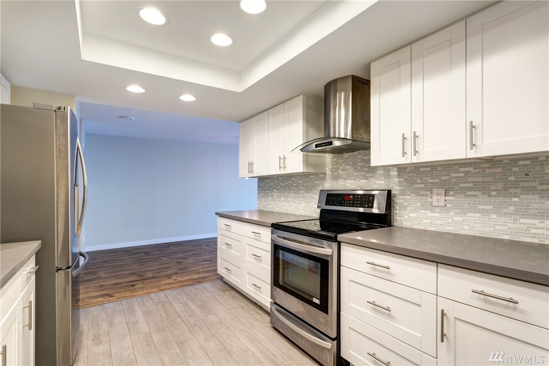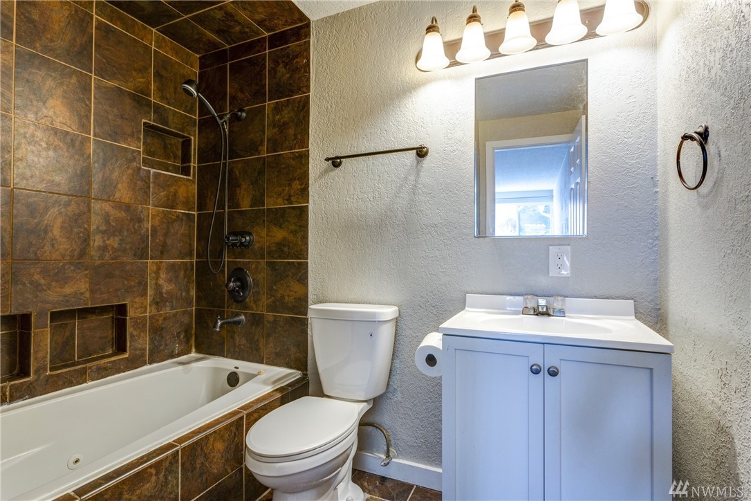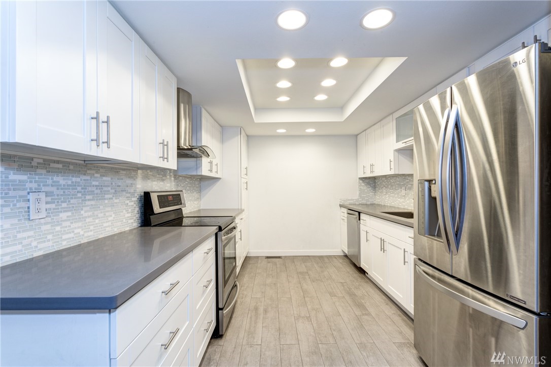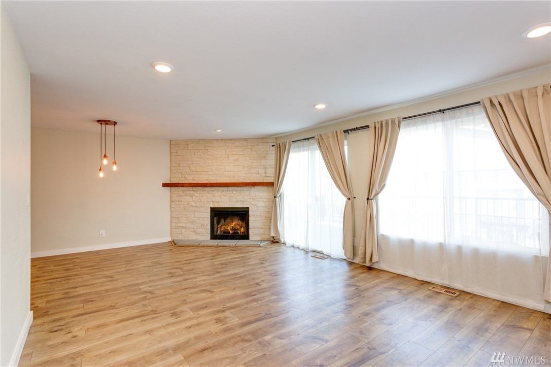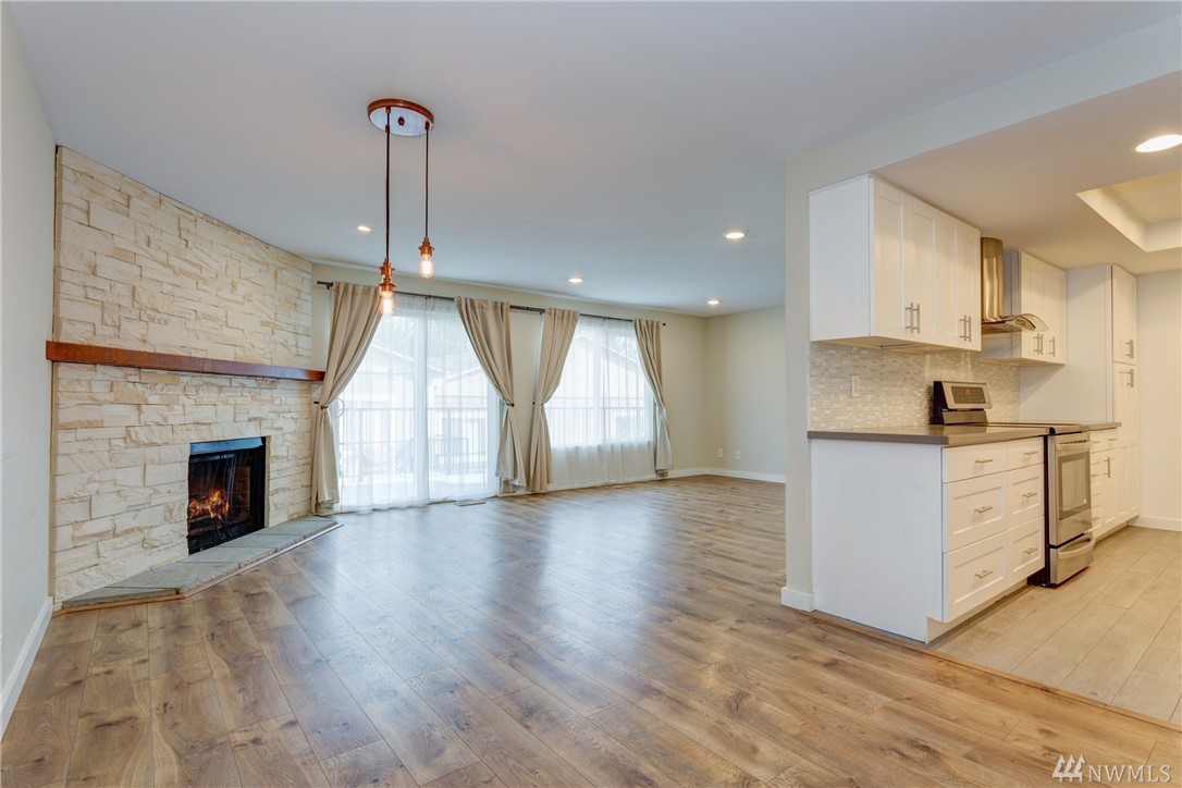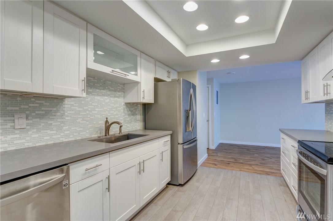 Beautifully remodeled, spacious top floor unit with private patio, detached garage and assigned parking spot in desired Kirkland/Juanita Beach location. Enjoy walking to the beach and Juanita Village. New siding, windows and landscape done in 2015. Inside new appliances, furnace, kitchen, floors, fireplace and paint. No rental cap.Highly rated Lake Washington School District.