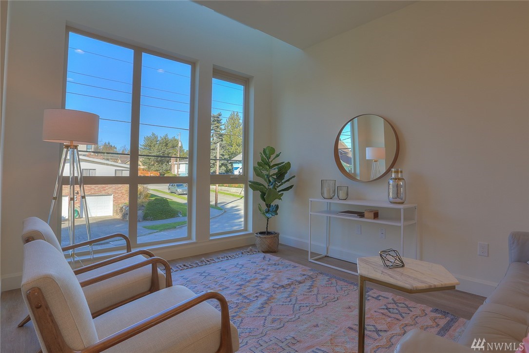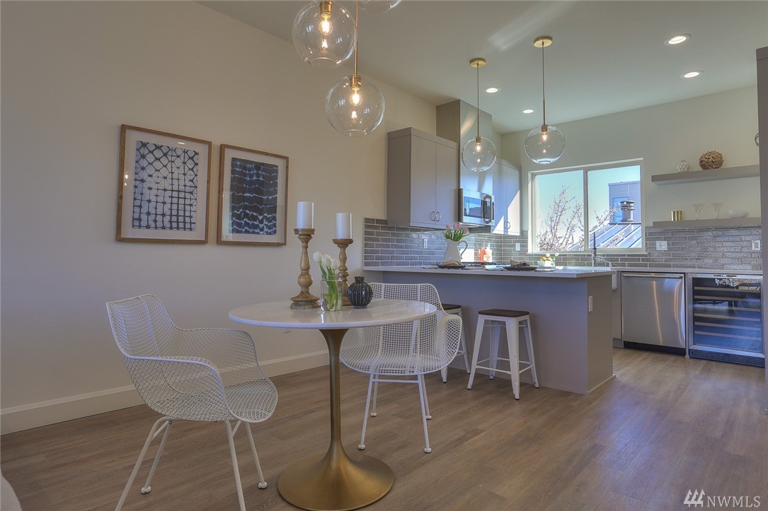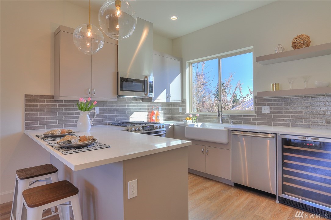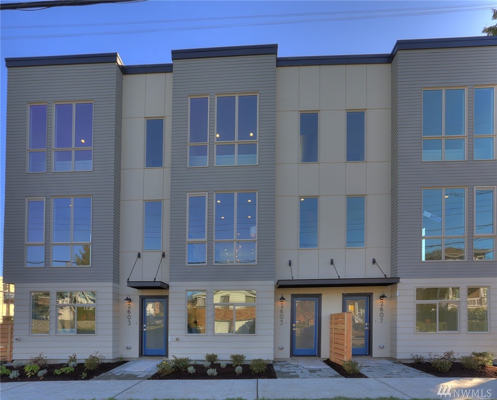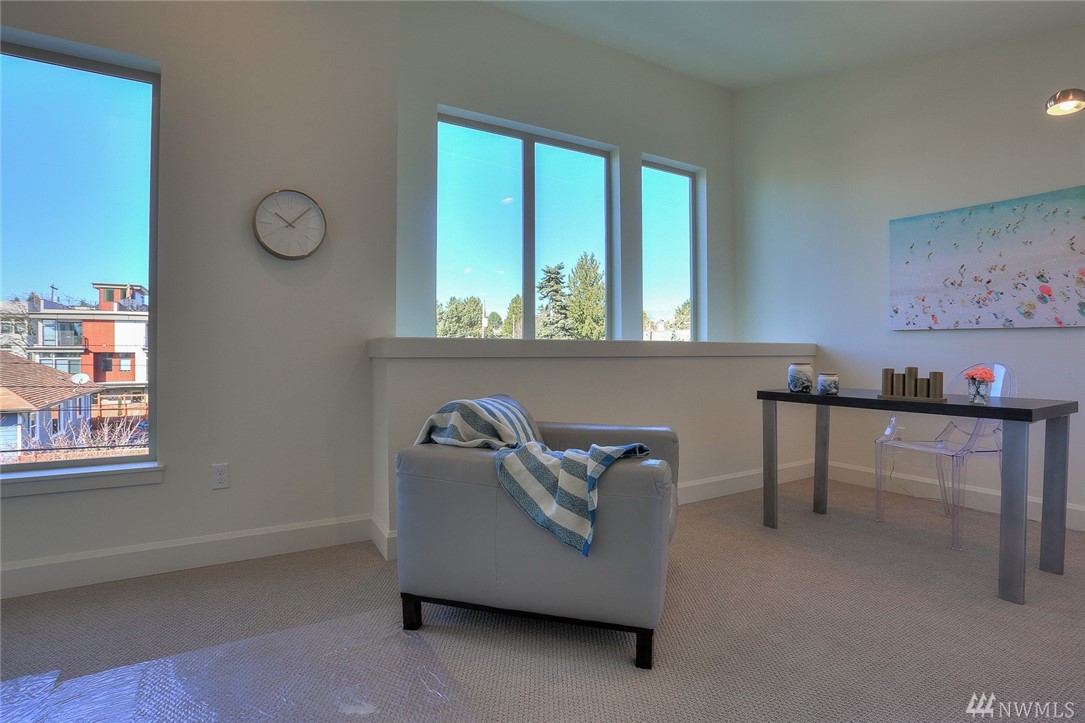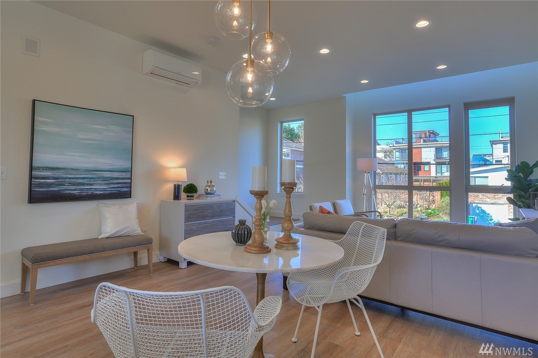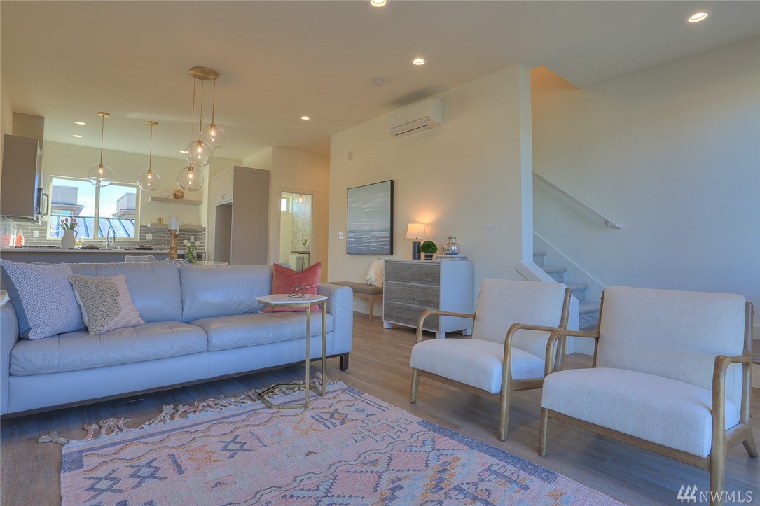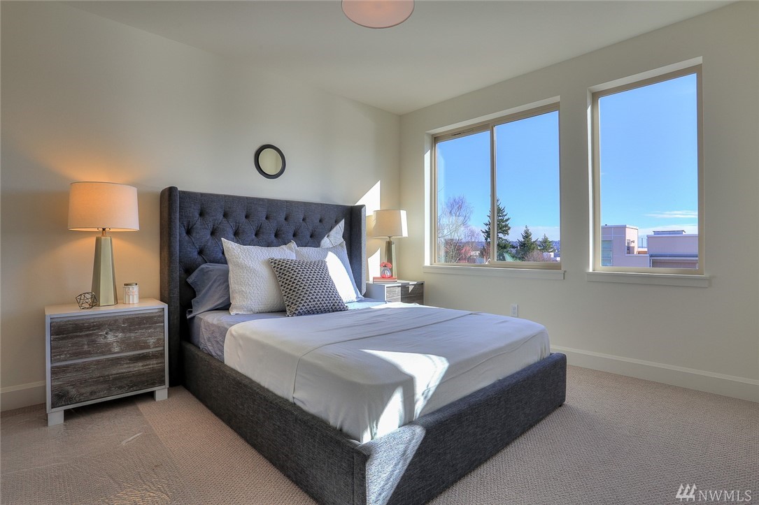 Light & bright new rowhouse by Triple Point (Noland Homes) in a terrific Ballard location. Nice spaces, large windows let all the sunshine in. Custom hand picked tile, fixtures and hardware. Spacious kitchen with Electrolux appliances. Great room living, designer powder room with mahogany counter and high ceilings! Two bedrooms and full bath on the first level. Wonderful master suite upstairs. Roof deck with views! Live healthy and happy with 4 Star Built Green. One car parking. Sharp!
