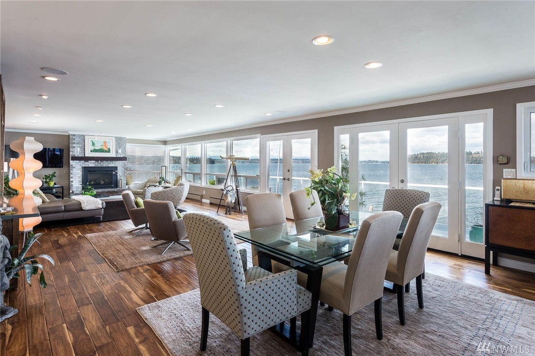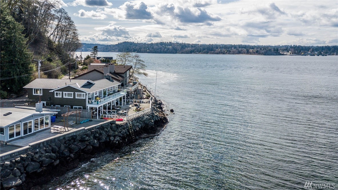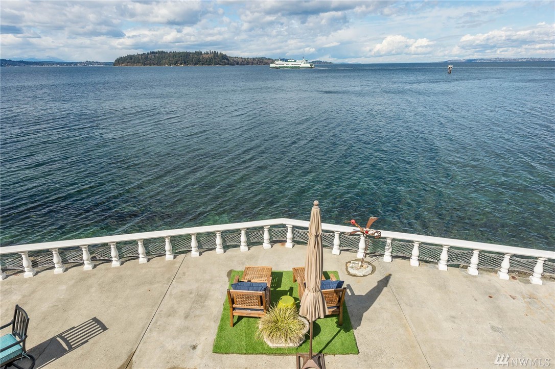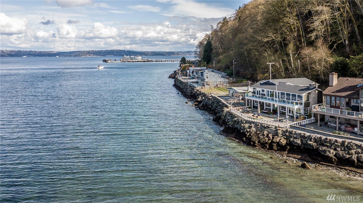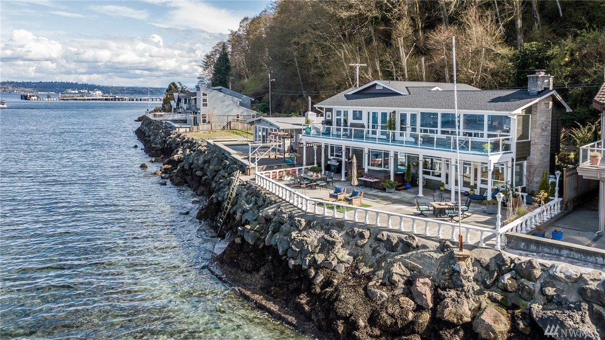 Exceptional beachfront living in this stunning contemporary home w/ 60+’ of low-bank waterfront & sweeping views of Sound, Olympics, Cascades, Mt Baker & city lights. Home offers great room floor plan, walls of view windows, 2 fireplaces, designer kitchen, teak floors, exceptional master suite, elegant finishes & artisan touches. Two large view decks perfect for alfresco dining. Experience the beauty of living on the water & seeing the vibrant sunrises & sunsets. 2 minutes from ferry. Paradise!