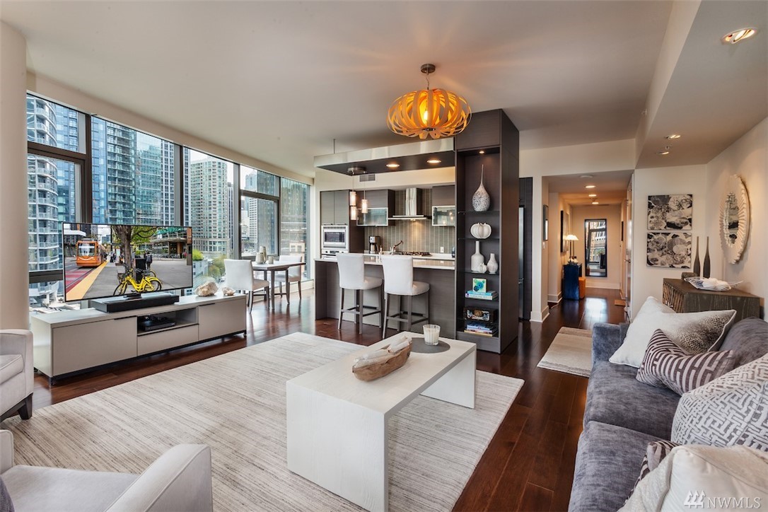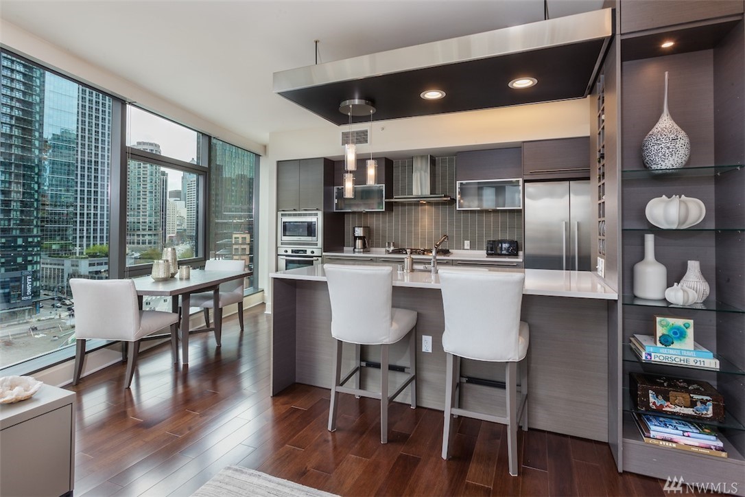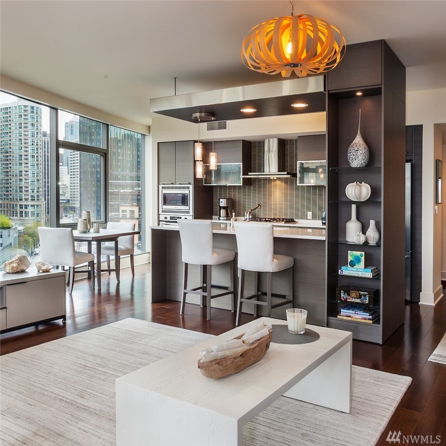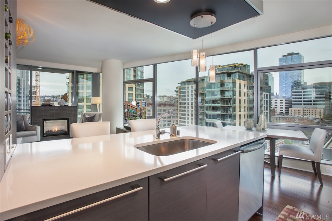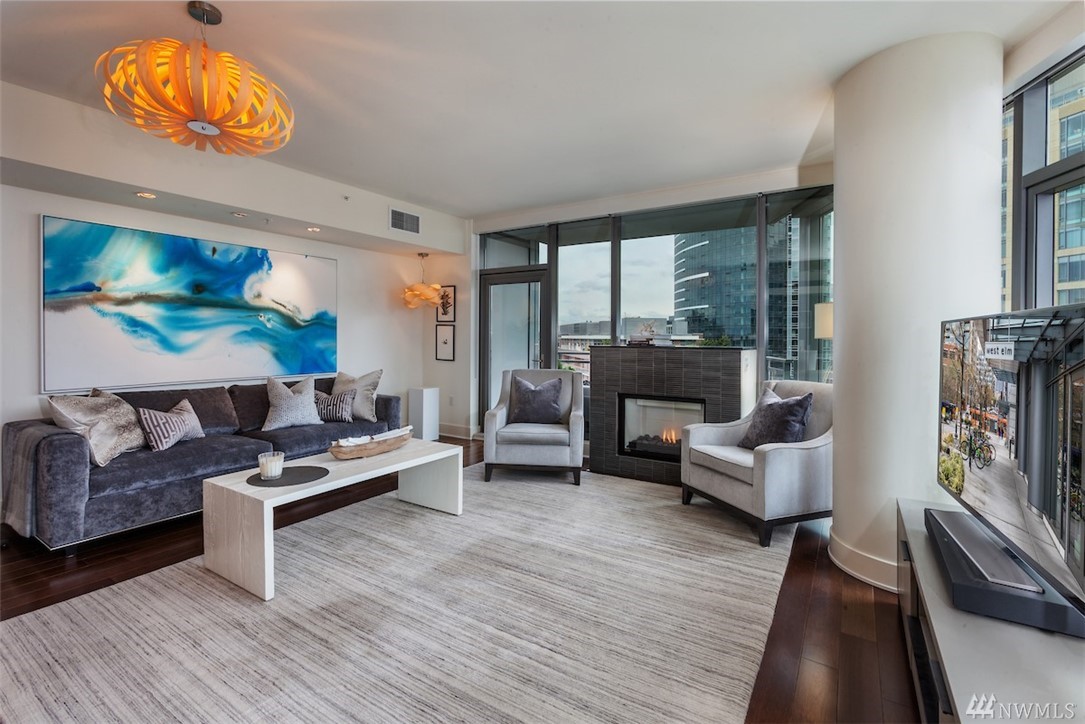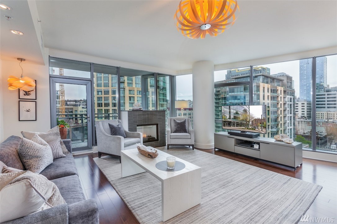 City life elevated to new heights in 2 bed, 1.75 bath home in the Enso Building. Floor to ceiling windows frame backdrop of gorgeous vistas & open concept offers seamless flow. Living room views meet custom lighting, fireplace & hardwood floors. Step onto the private balcony for immersive city experience. Chef's kitchen w/SS appliances, gas range & eat-in bar. Master suite w/walk-in closet, spa-like bath. Secure building, 2 parking spaces, addt'l storage, luxuries amenities & walkability.