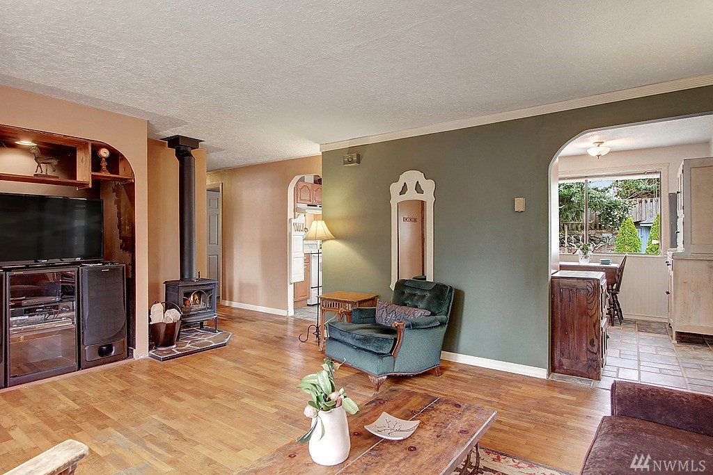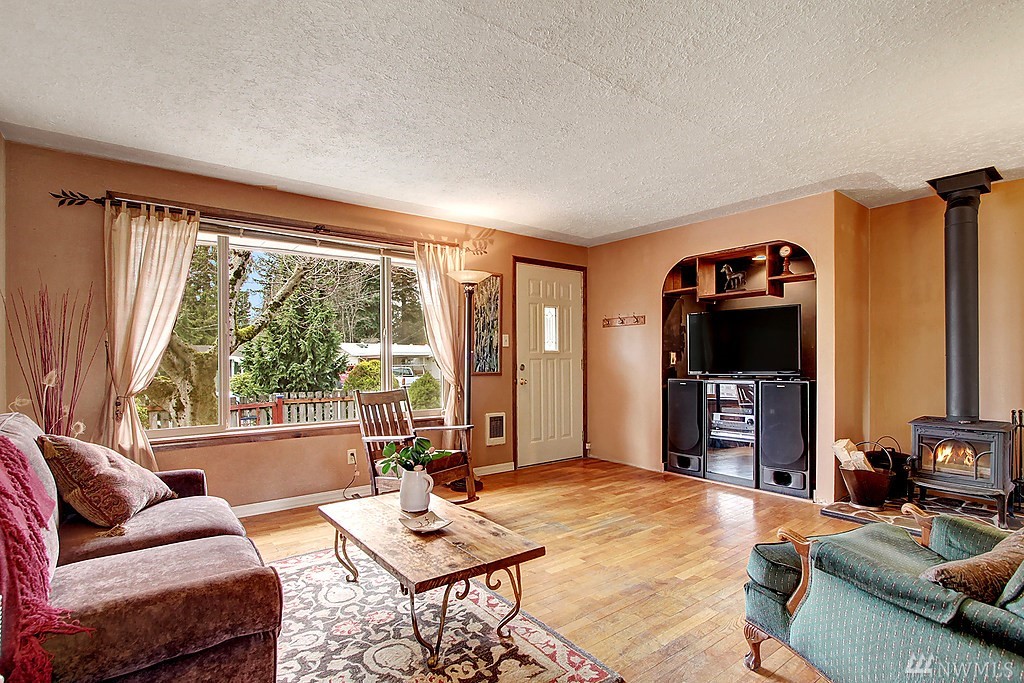Charming bungalow w/hardwood floors & tons of natural light. Efficient wood burning stove, arched doorways. Updated kitchen w/tile floors & eating nook. Large patio, sunny gardens, arbor, wood built shed - a true gardener’s delight! Ideal central location- walk to the 24 mile Interurban Trail, connecting Everett to Seattle, South Lynnwood Park w/sports courts & playground, and transit. Just minutes to shopping & restaurants. Great commuter location, EZ Highway 99, I-5 & I-405 access.