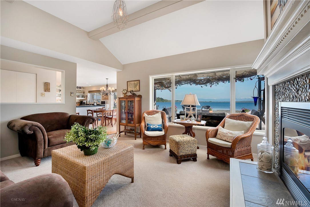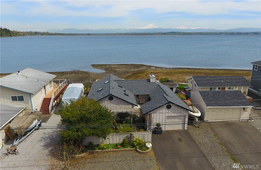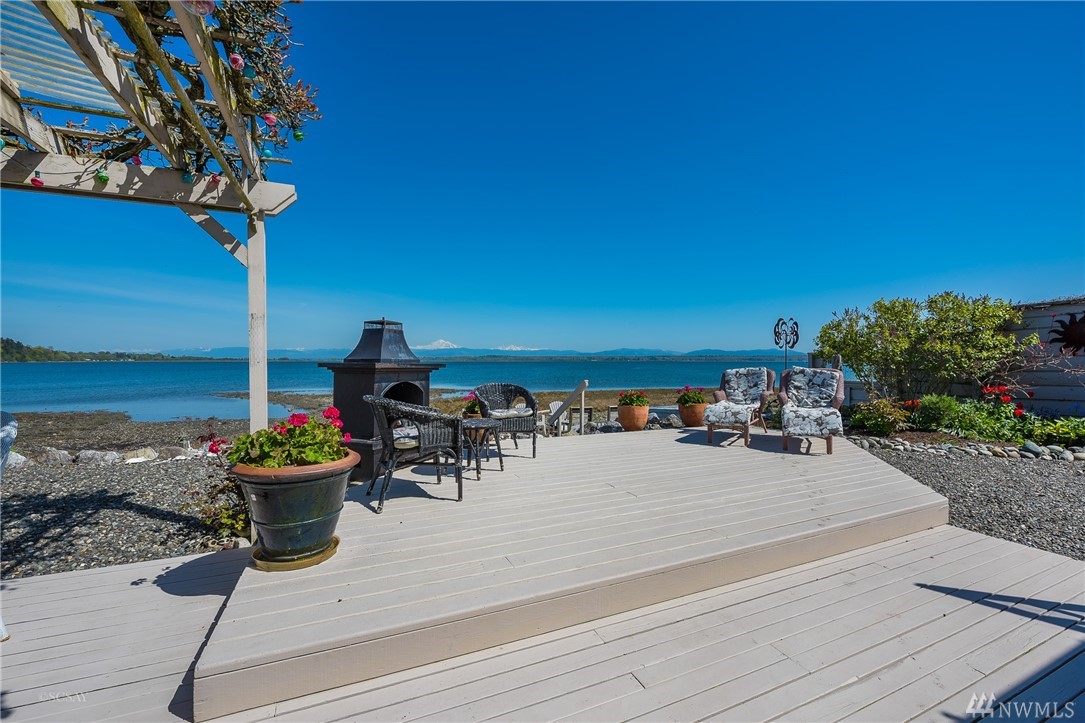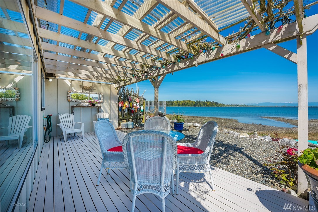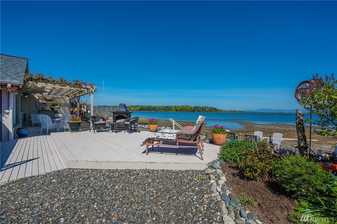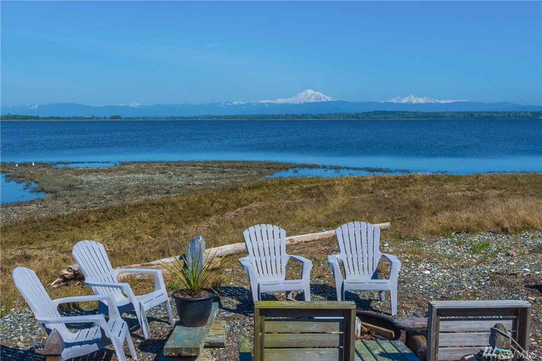 Start your day with an amazing view of Mount Baker & the Sisters over the Bay. Waterfront rambler with living spaces overlooking the water. Sweet kitchen with style, includes slate chalkboard countertop from Roosevelt High in Seattle. Gas fireplace in living room, 3rd bedroom is being used as family room. Newer roof, skylights, appliances, FP, carpet. Several private courtyard patios to enjoy your time at the beach. Special feel in this home! Sandy Point: Marina, Golf, Pool, Tennis, Play Areas