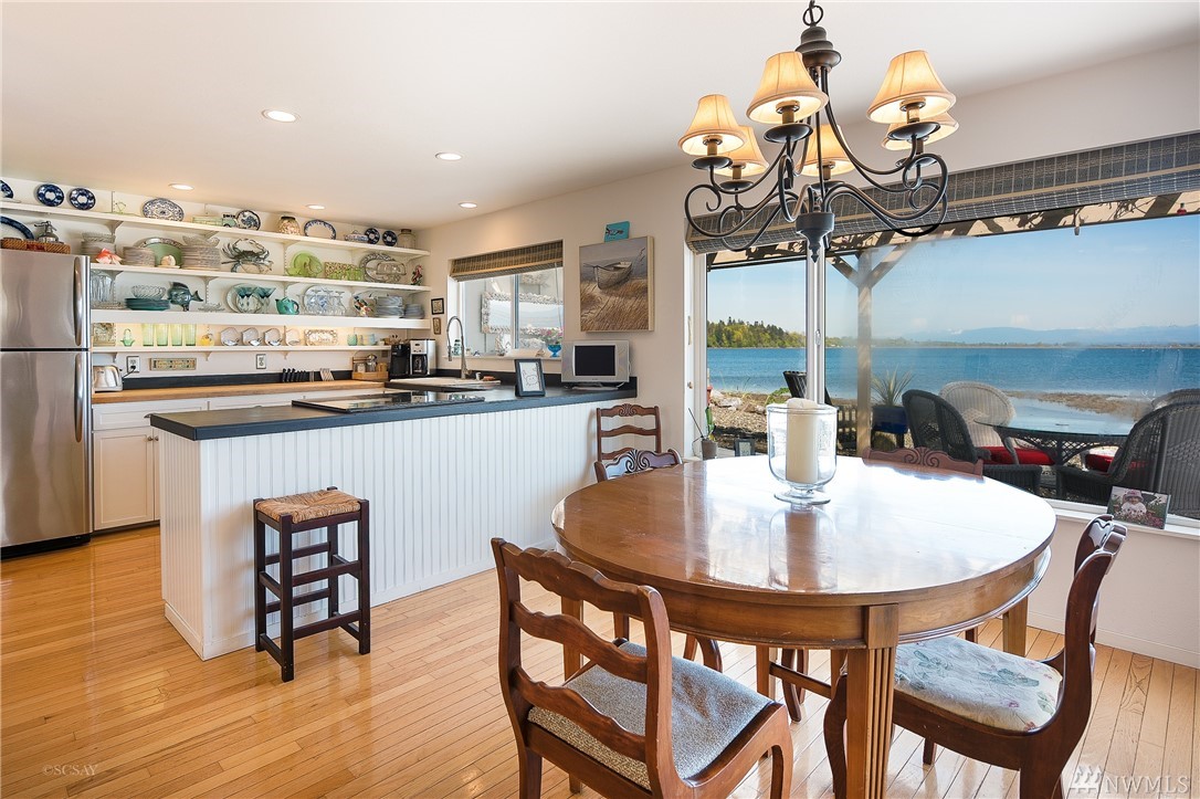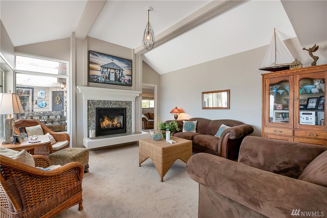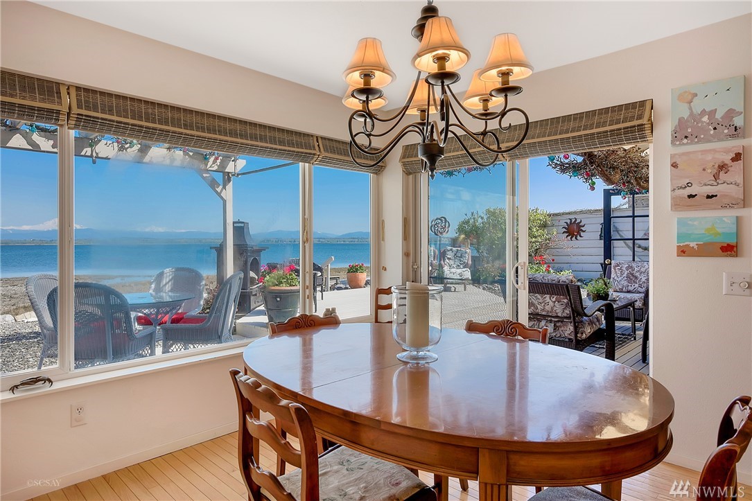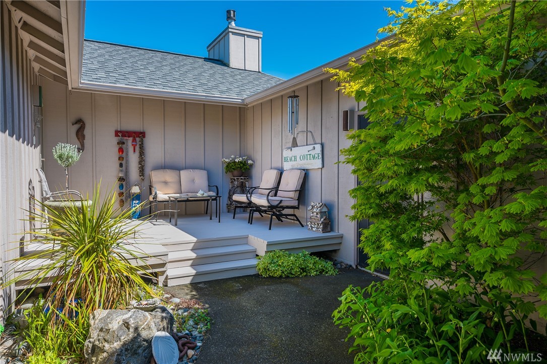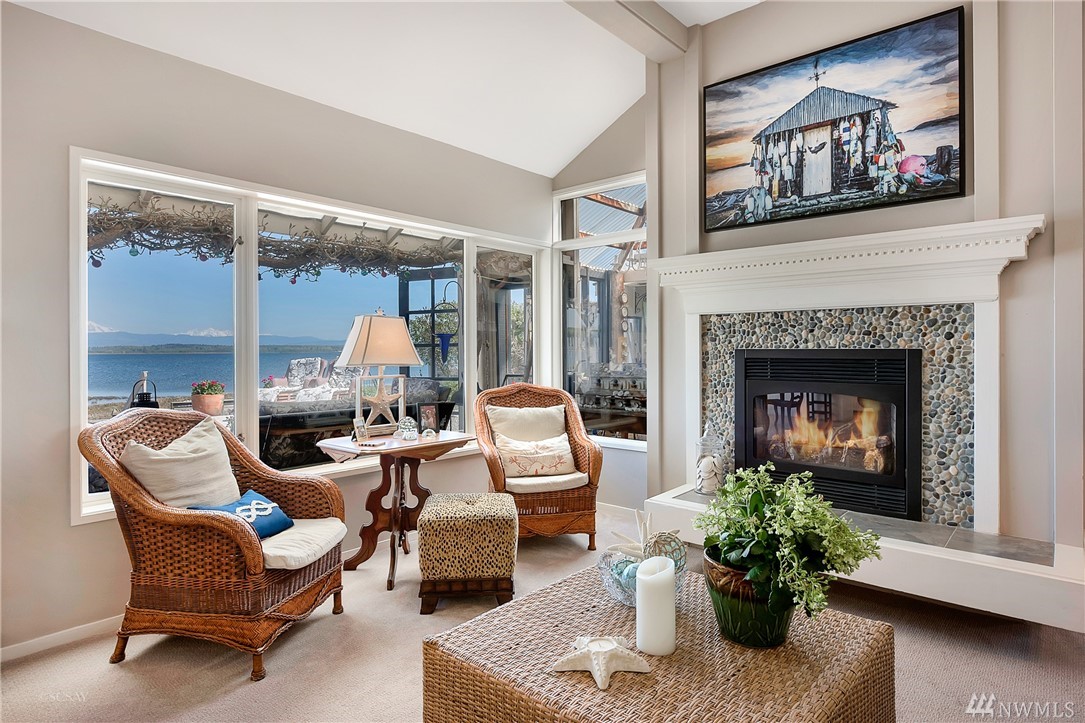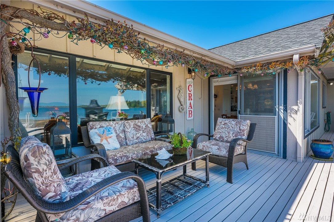 Start your day with an amazing view of Mount Baker & the Sisters over the Bay. Waterfront rambler with living spaces overlooking the water. Sweet kitchen with style, includes slate chalkboard countertop from Roosevelt High in Seattle. Gas fireplace in living room, 3rd bedroom is being used as family room. Newer roof, skylights, appliances, FP, carpet. Several private courtyard patios to enjoy your time at the beach. Special feel in this home! Sandy Point: Marina, Golf, Pool, Tennis, Play Areas